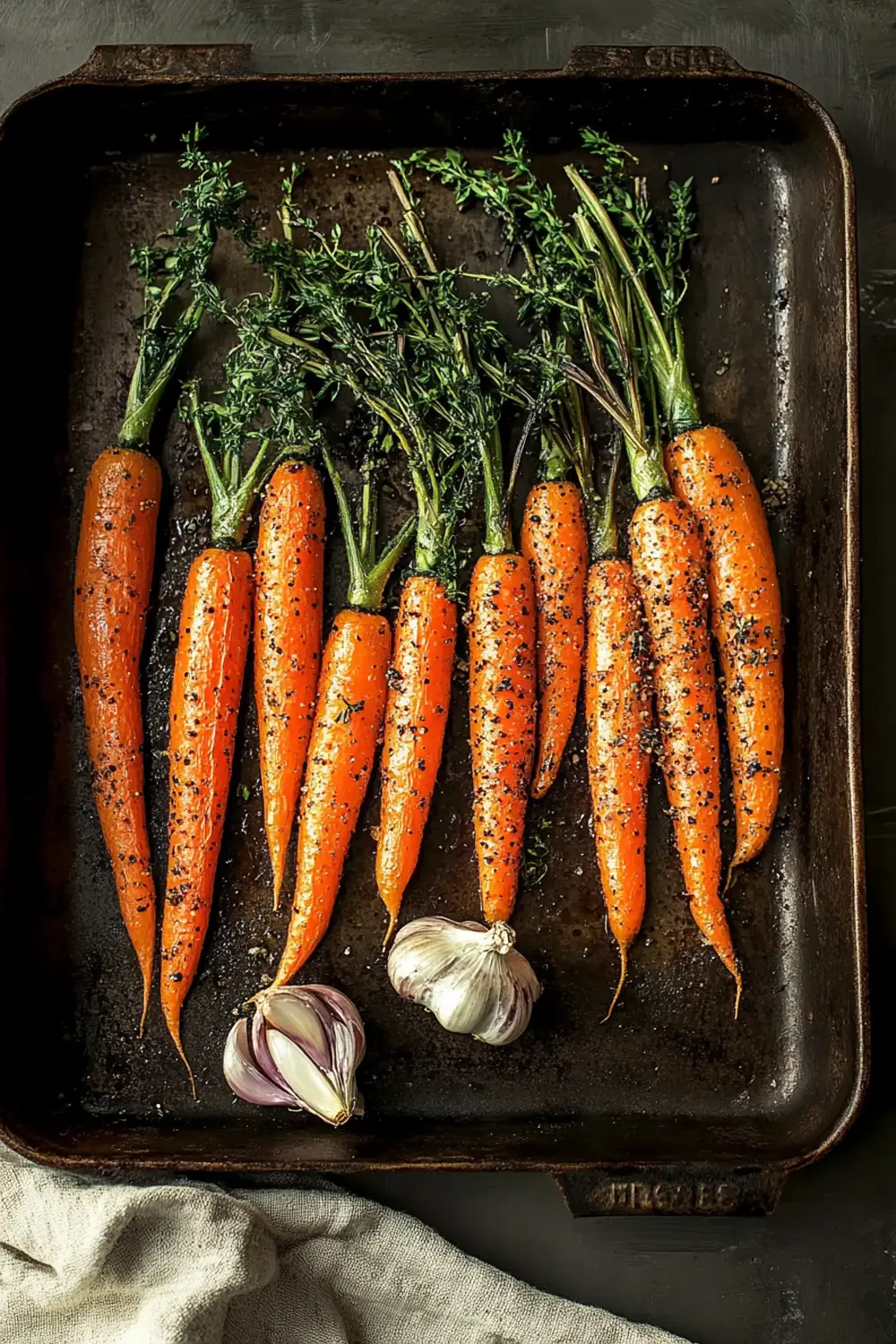 Toss carrots with oil, garlic, and seasonings. Roast at 400°F (200°C) for 25 minutes, stirring halfway, until caramelized and tender.