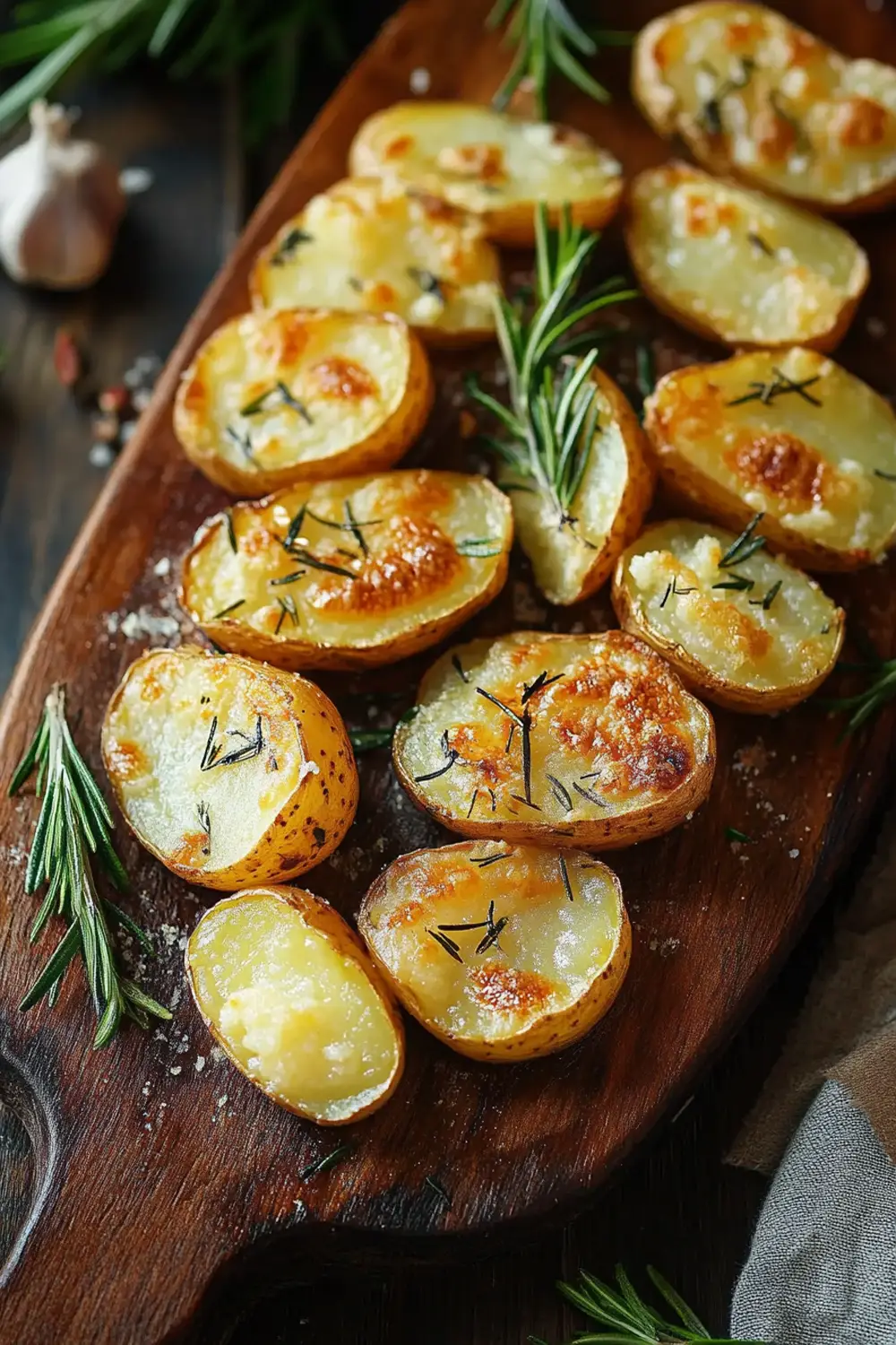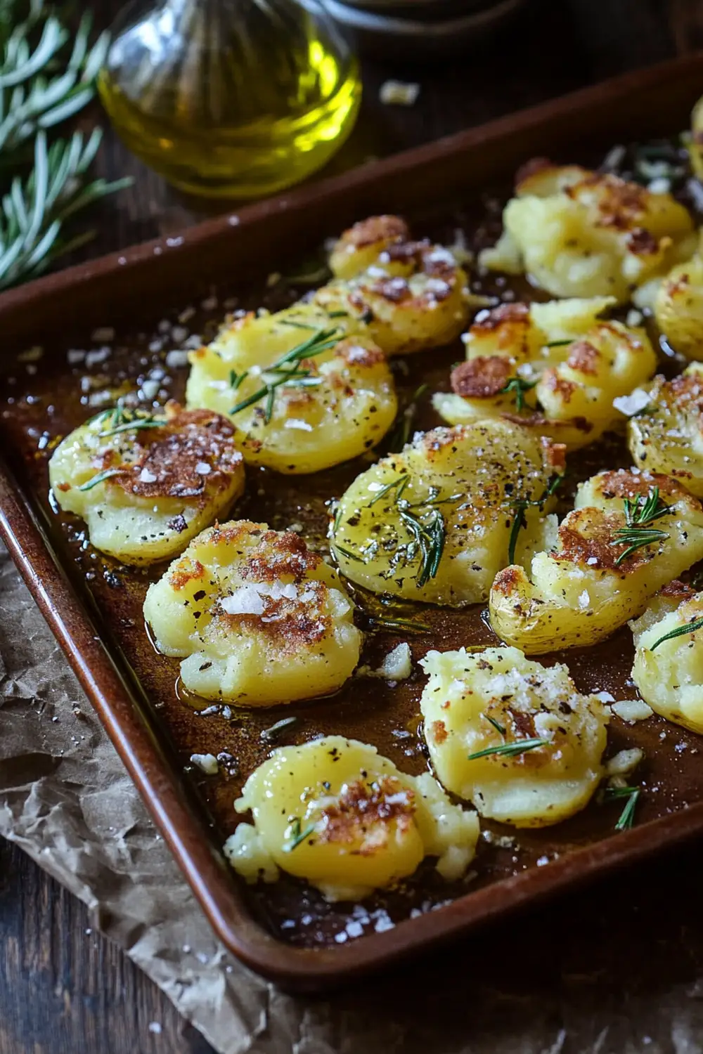 Flatten potatoes slightly, drizzle with oil, and bake at 425°F (220°C) for 20 minutes until crispy.