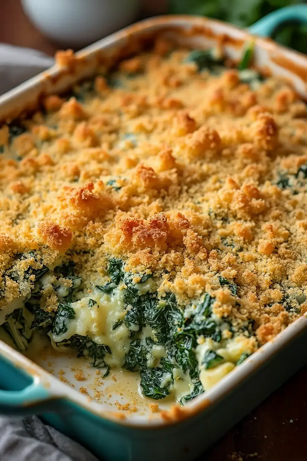 Layer potatoes and spinach in a greased baking dish. Pour over heavy cream, season with salt and pepper, and top with Gruyère and breadcrumbs. Bake at 375°F (190°C) for 40 minutes until golden and bubbly. Serve warm for a rich, comforting side.