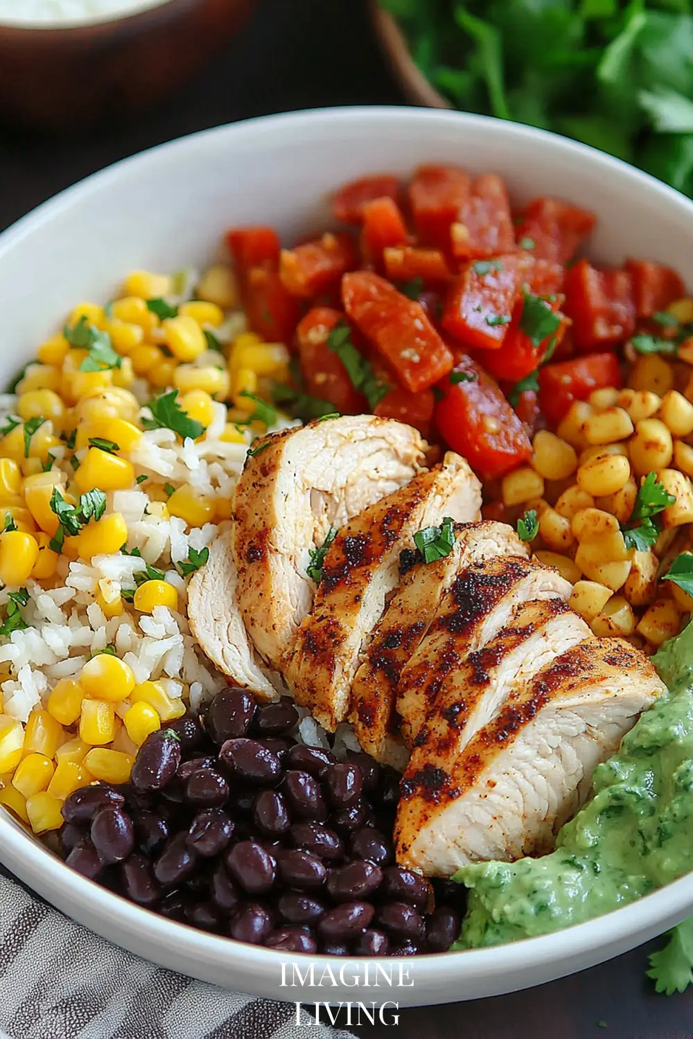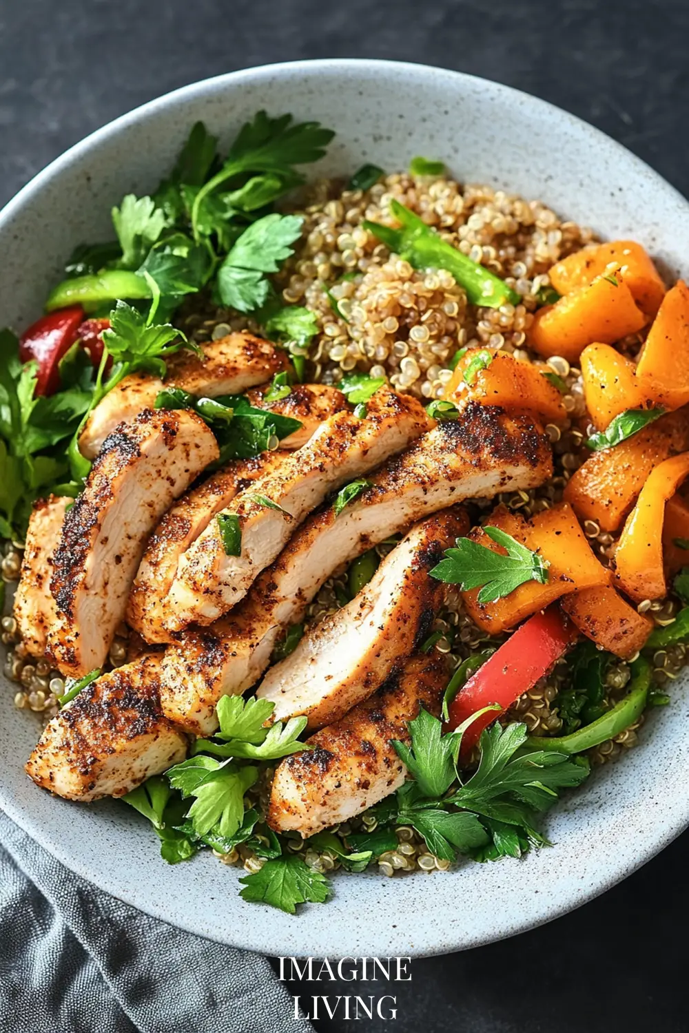 3. Assemble the bowl: Layer quinoa, black beans, cherry tomatoes, and cooked chicken.