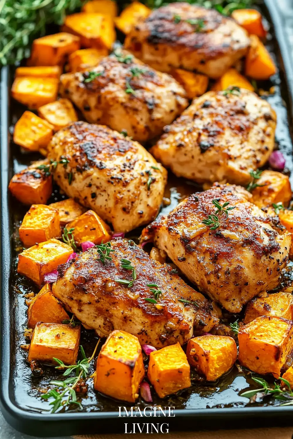 3. Place chicken and Brussels sprouts on a baking sheet. Drizzle with half of the balsamic mixture.