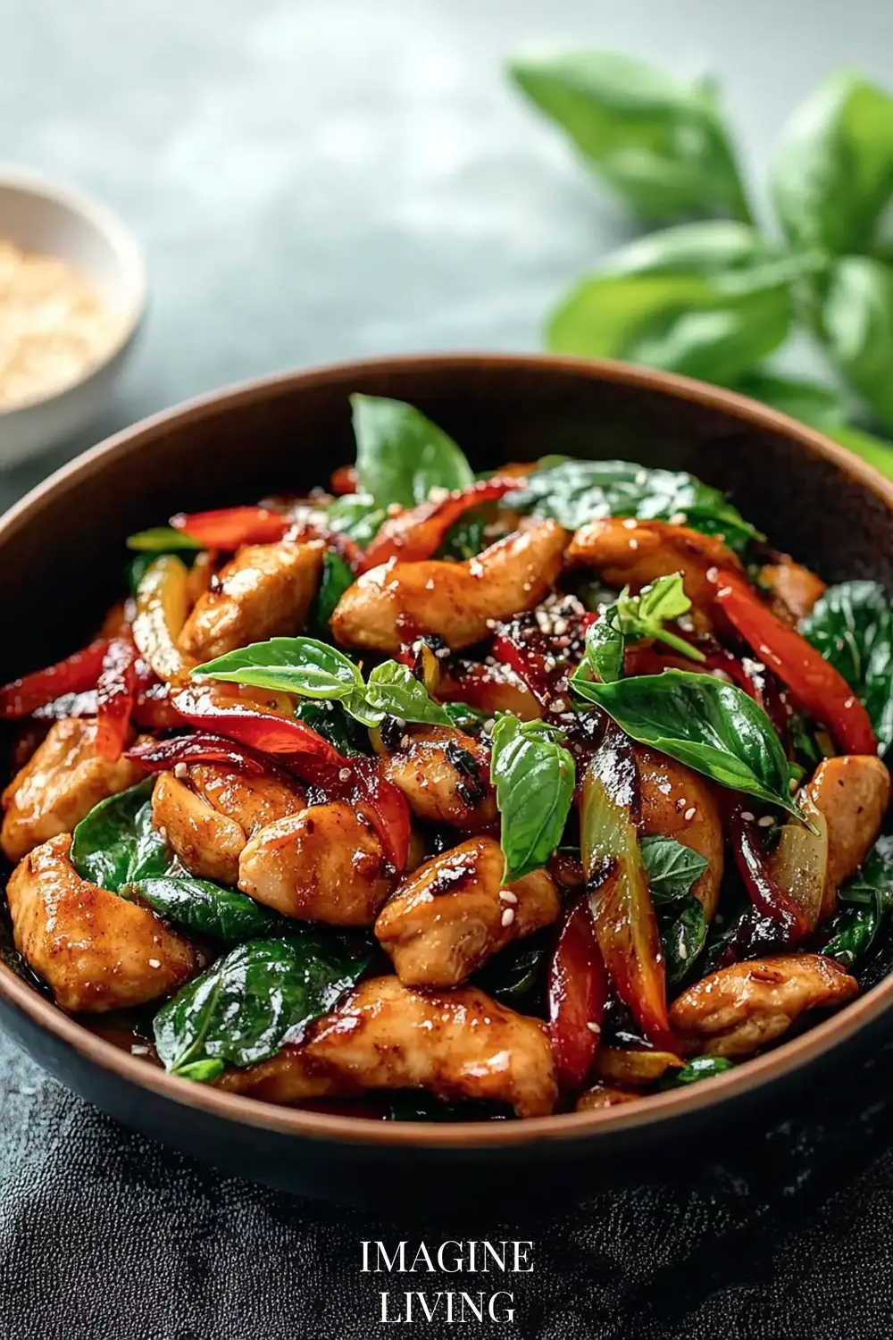 5. Toss in fresh Thai basil leaves and stir for 1 more minute until fragrant.