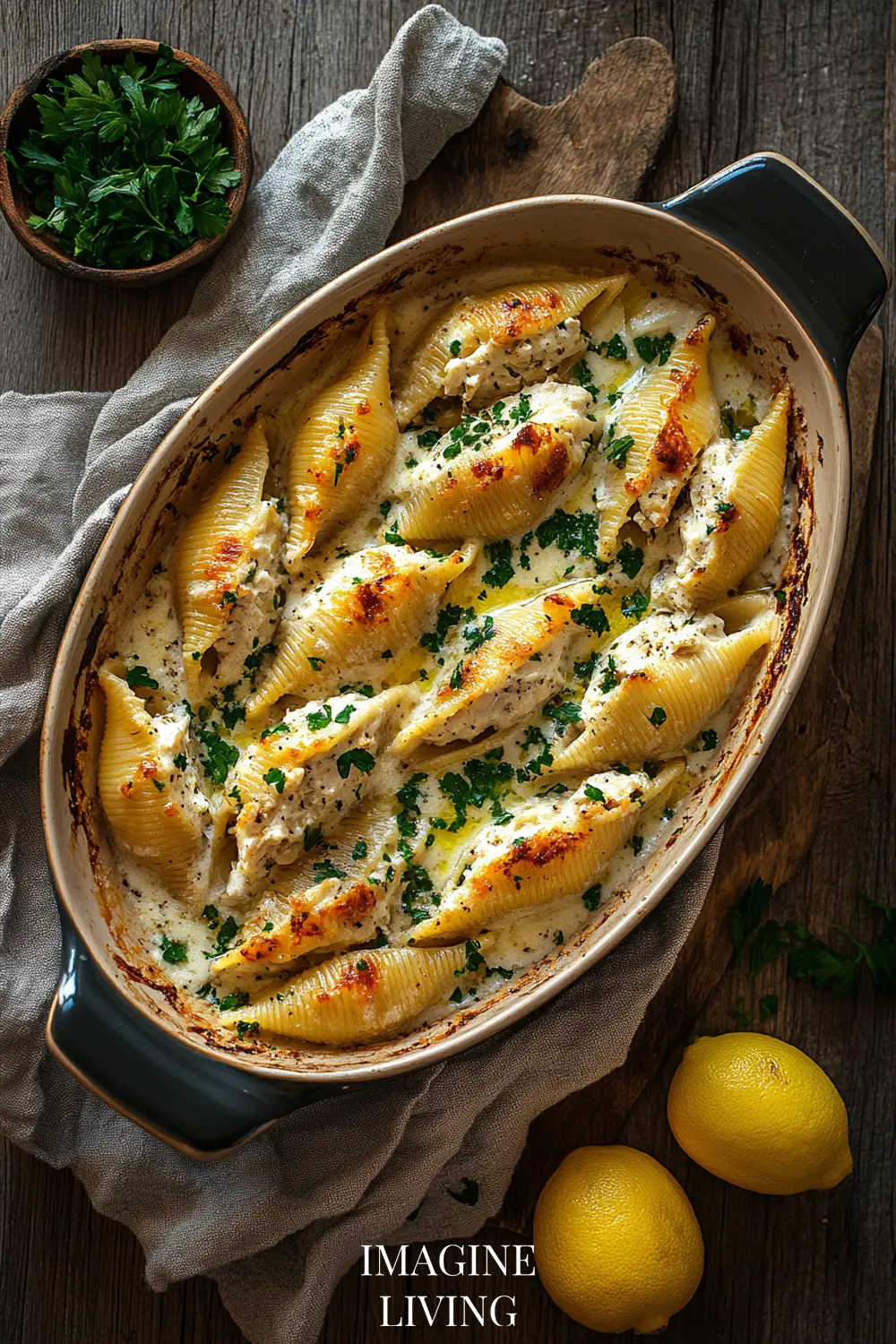 Pour the remaining Alfredo sauce evenly over the shells. Cover with foil and bake at 375°F (190°C) for 25 minutes, then uncover and bake an additional 5–7 minutes until the sauce is bubbling.