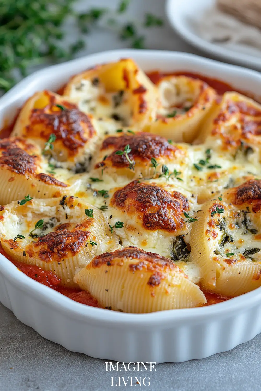 Pour the remaining marinara over the shells. Cover with foil and bake at 375°F (190°C) for 25 minutes, then uncover and bake for another 5 minutes until golden and bubbling.