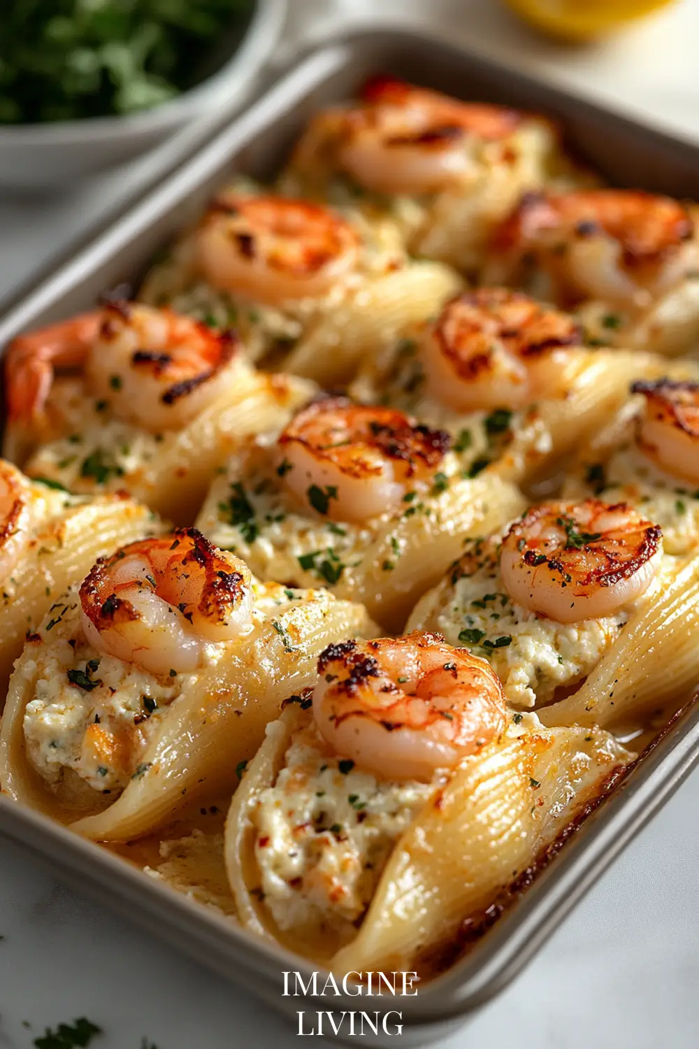 Generously fill each shell with the shrimp and ricotta mixture and place them in the dish.