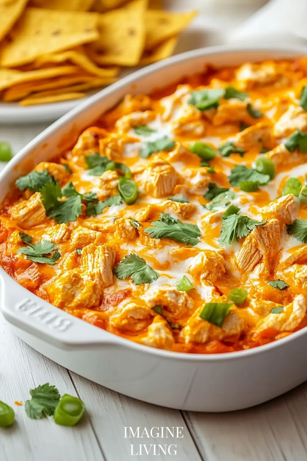 Once the dip is out of the oven, sprinkle it with chopped green onions for a pop of freshness and color. Serve immediately with warm tortilla chips on the side.