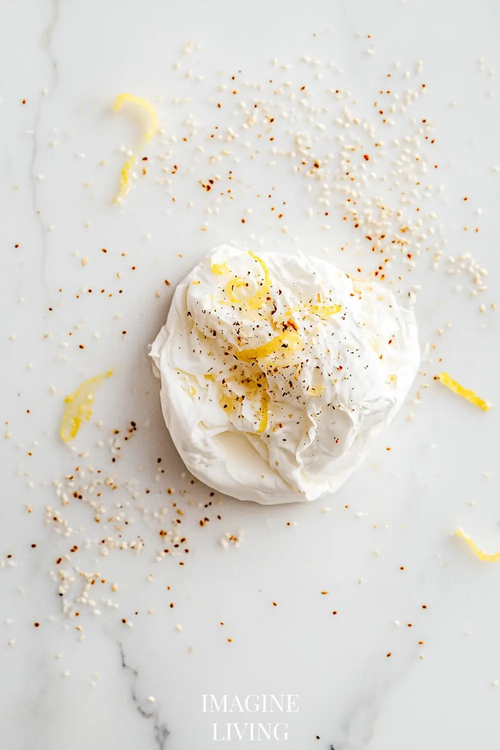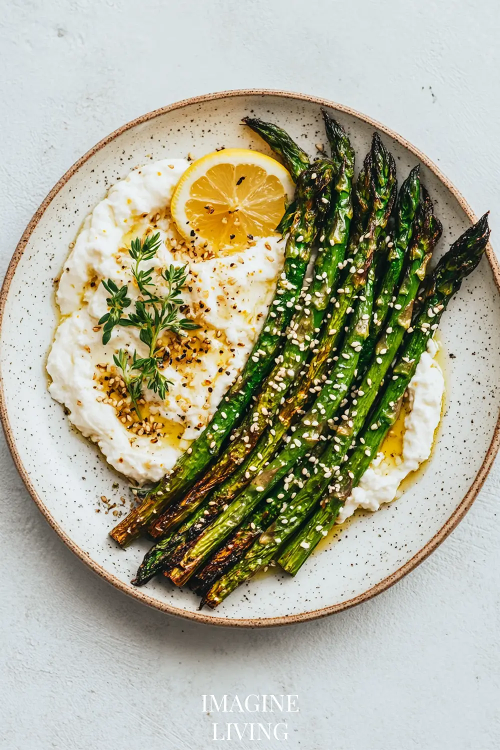 Arrange warm asparagus over and around the burrata. Sprinkle with toasted sesame seeds and additional lemon zest for brightness.