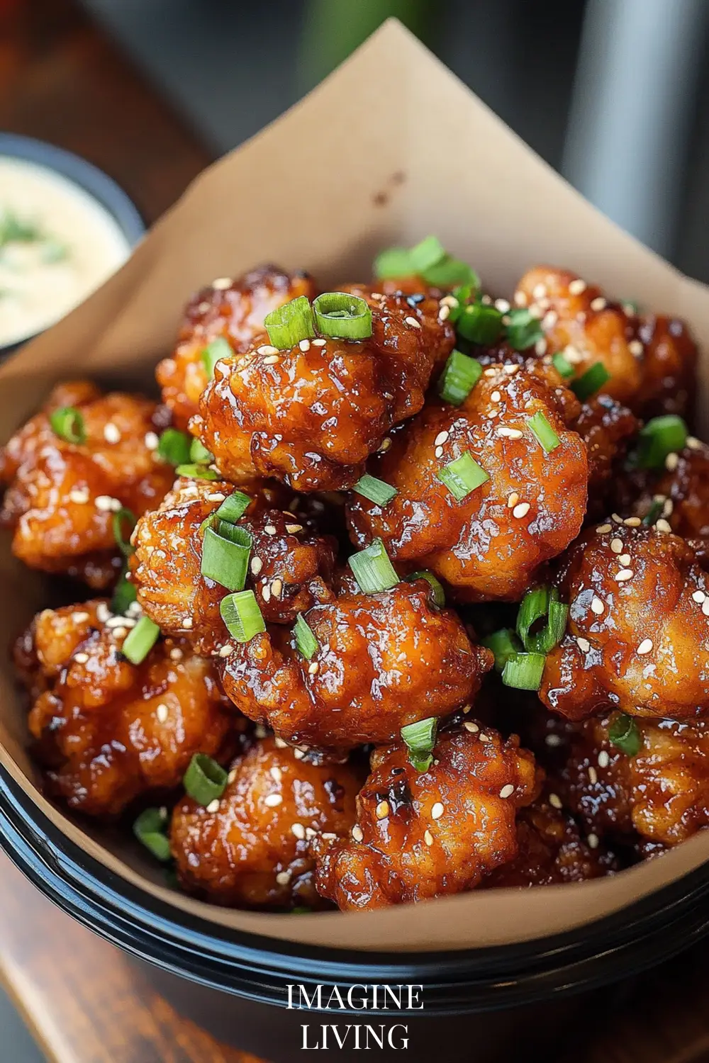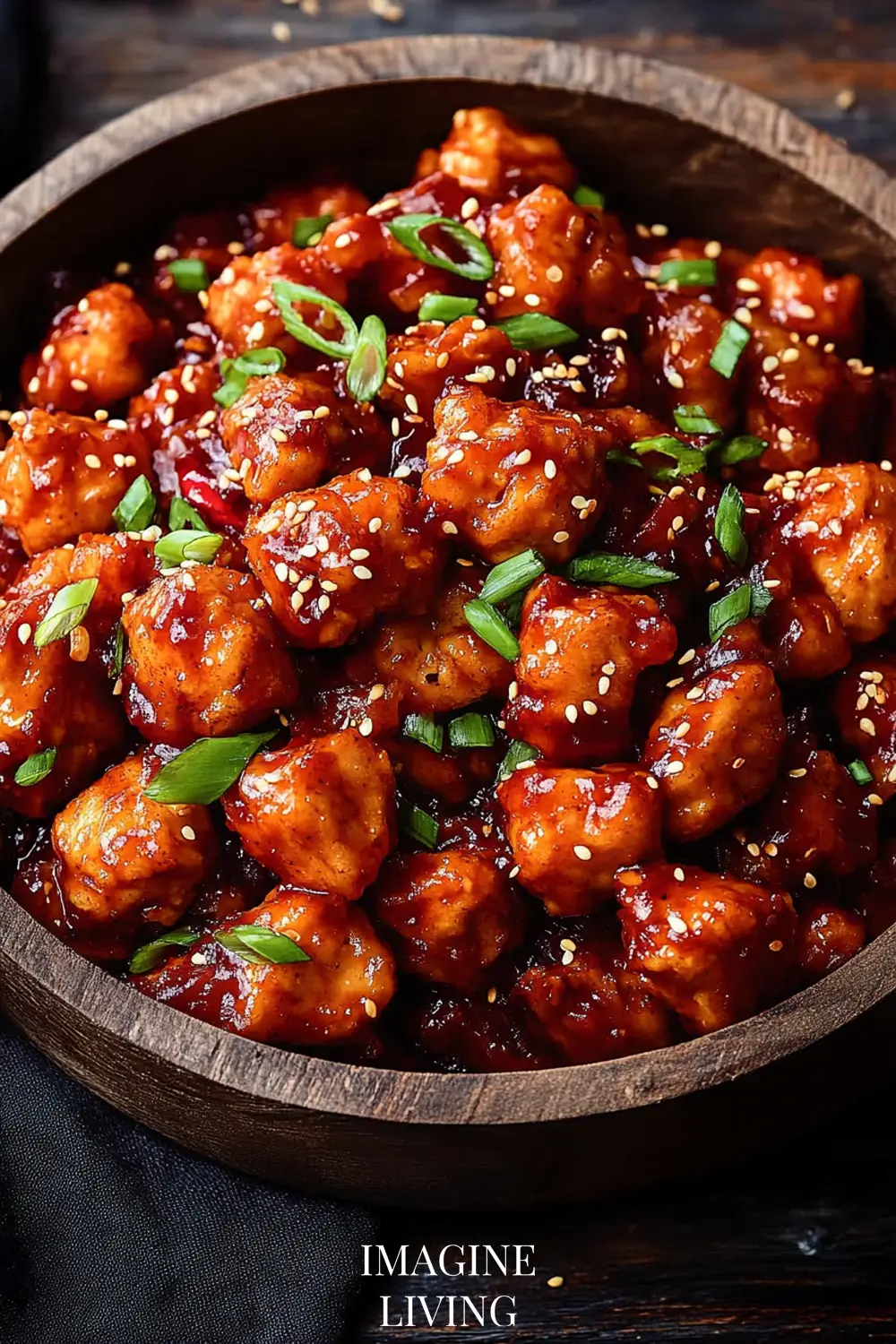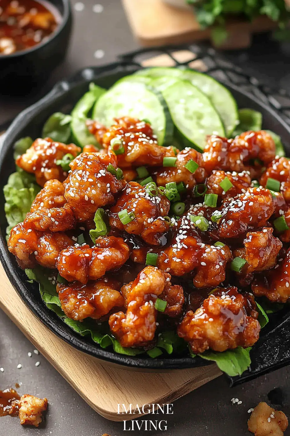 - Coat the crispy chicken generously in the sauce, garnish with sesame seeds and green onions, and serve immediately.