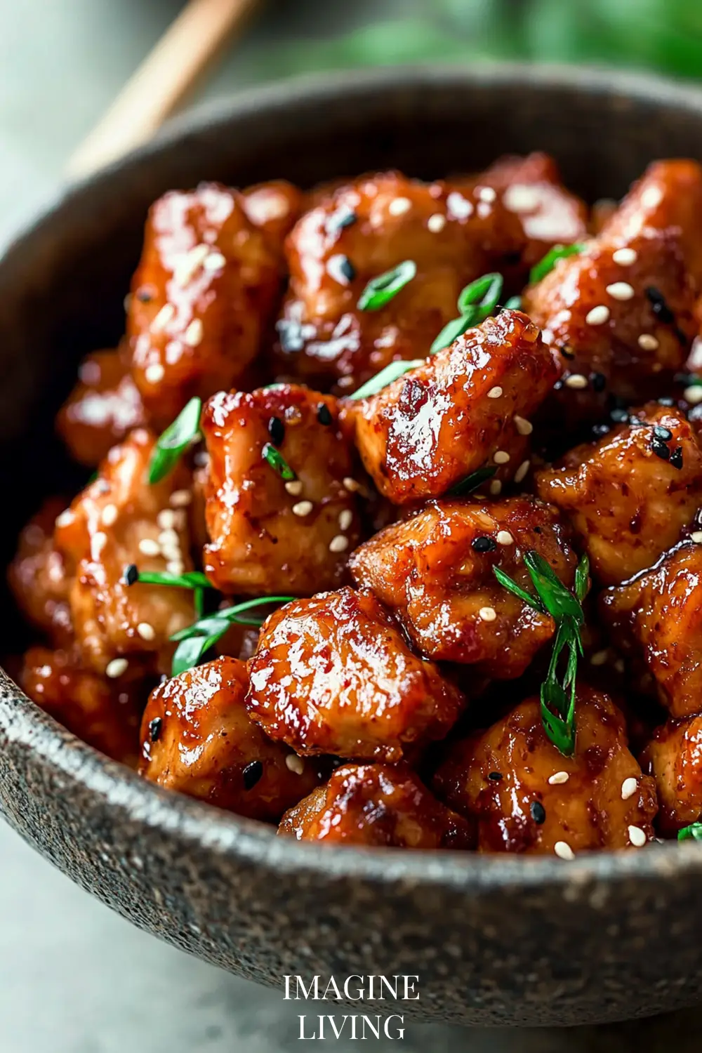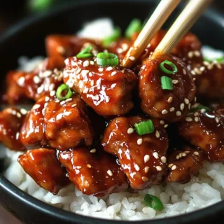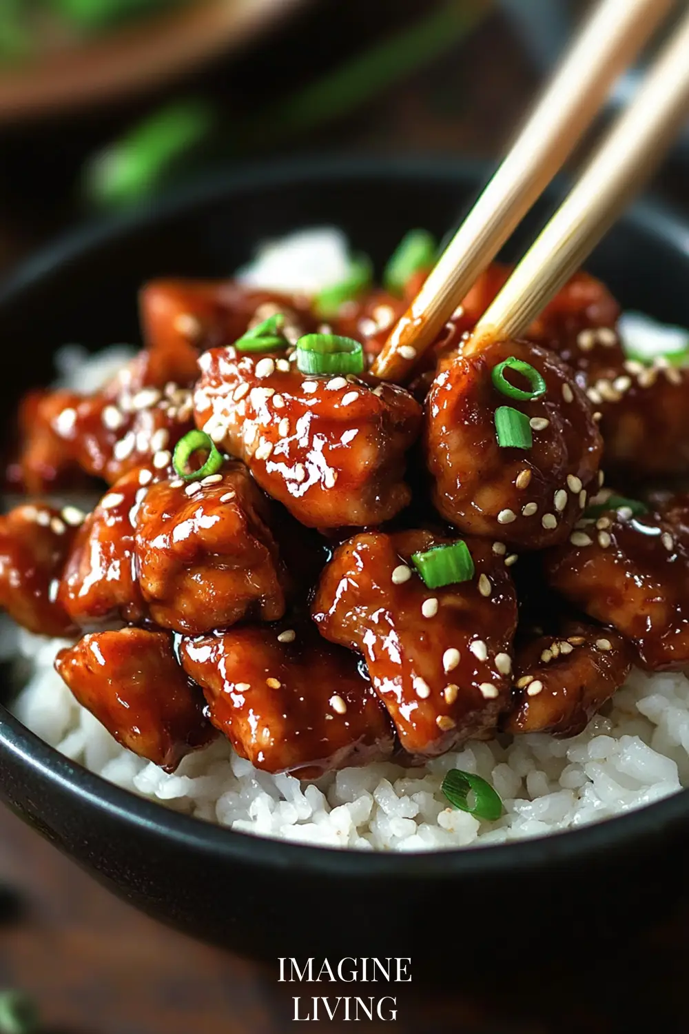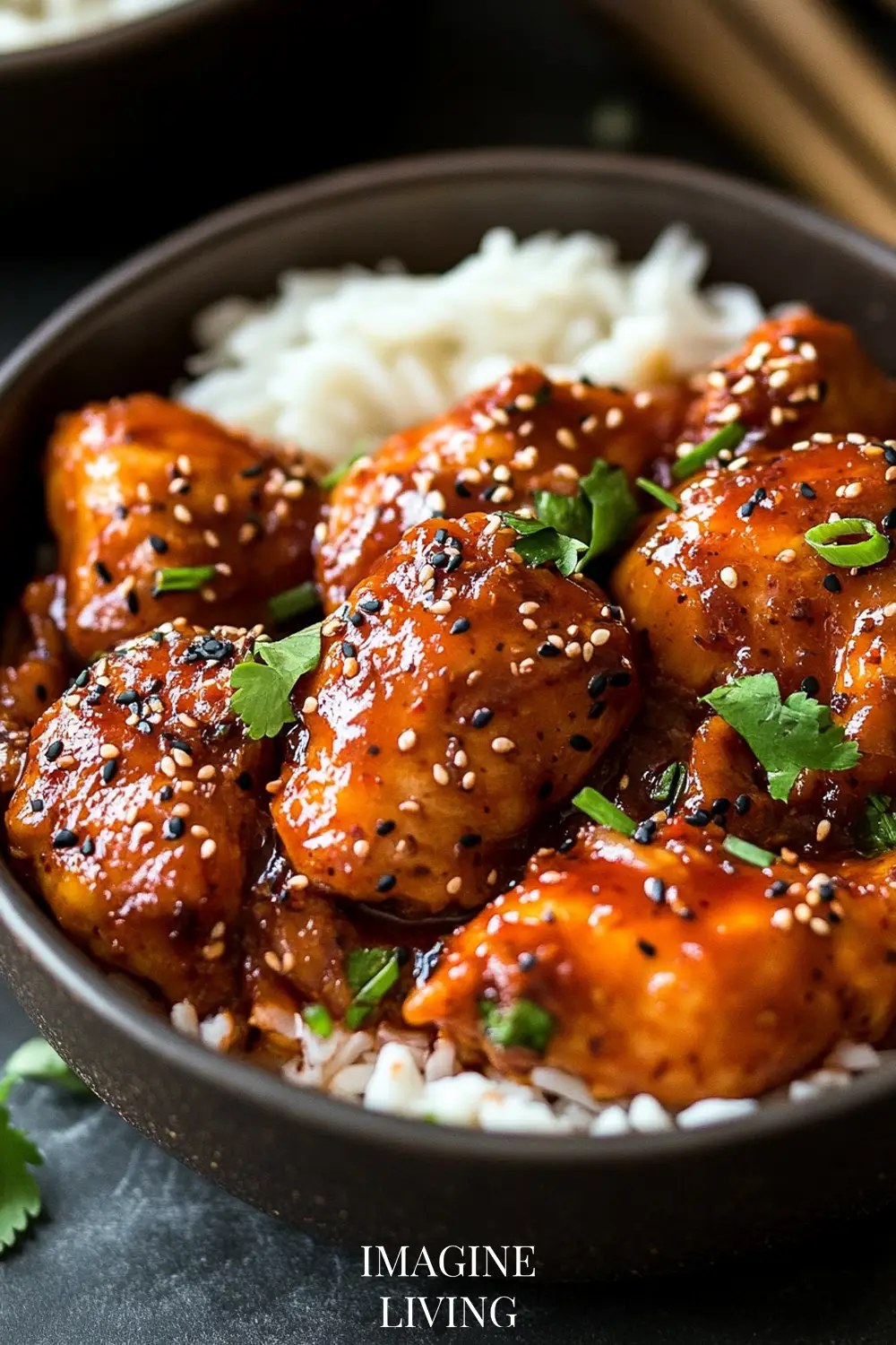 - Coat the crispy chicken generously in the sauce, garnish with sesame seeds and green onions, and serve immediately.