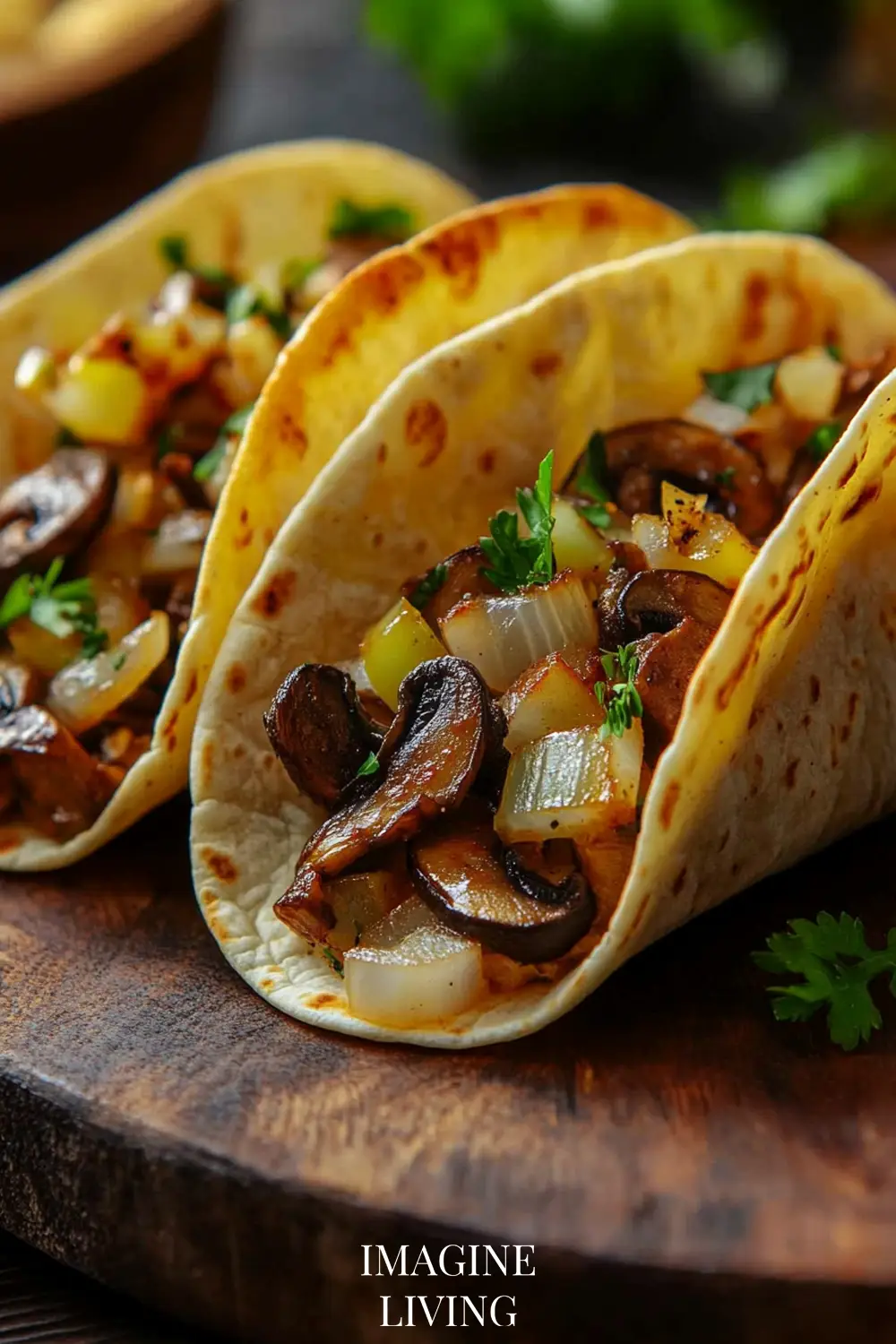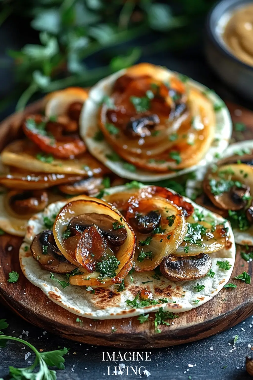 - Layer the roasted mushrooms and onions onto each mini tortilla.