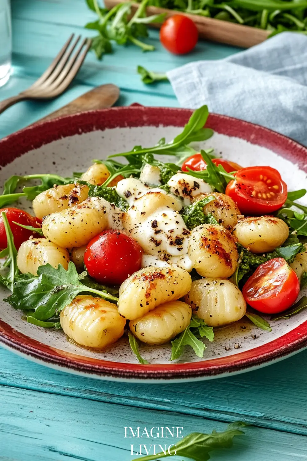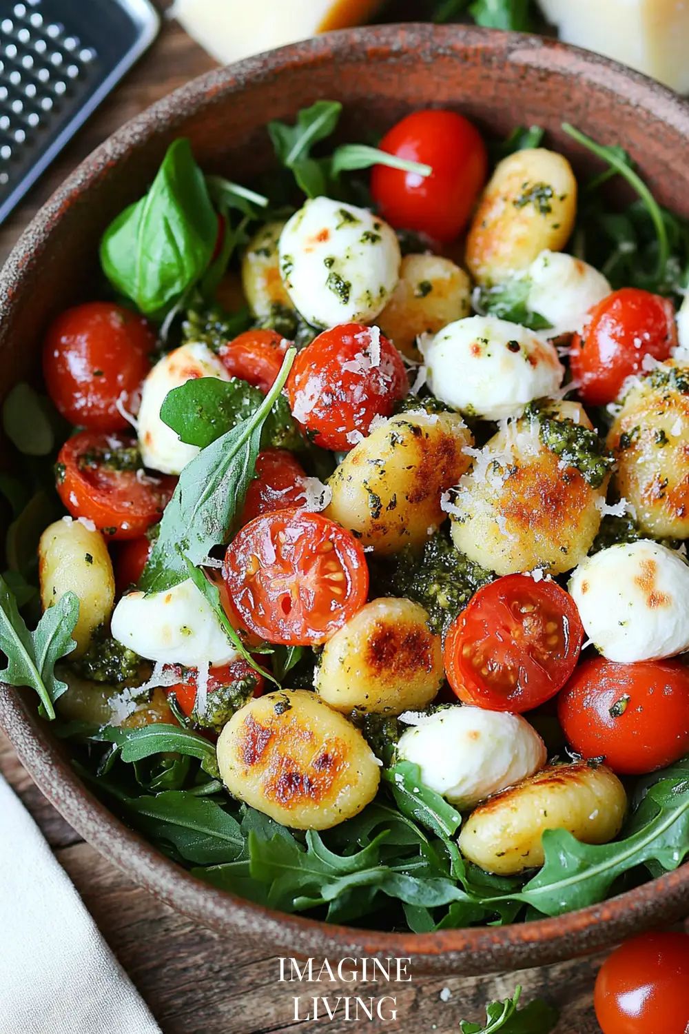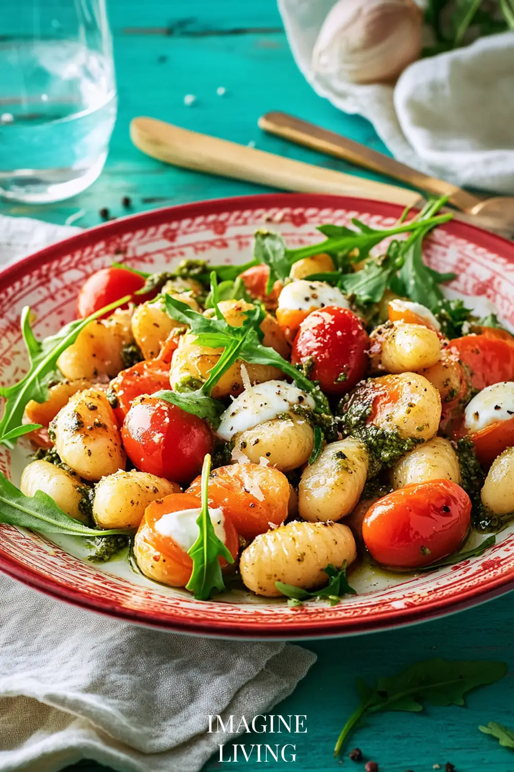 Roasted Gnocchi Salad with Basil Pesto, Tomatoes, Mozzarella, and Arugula
