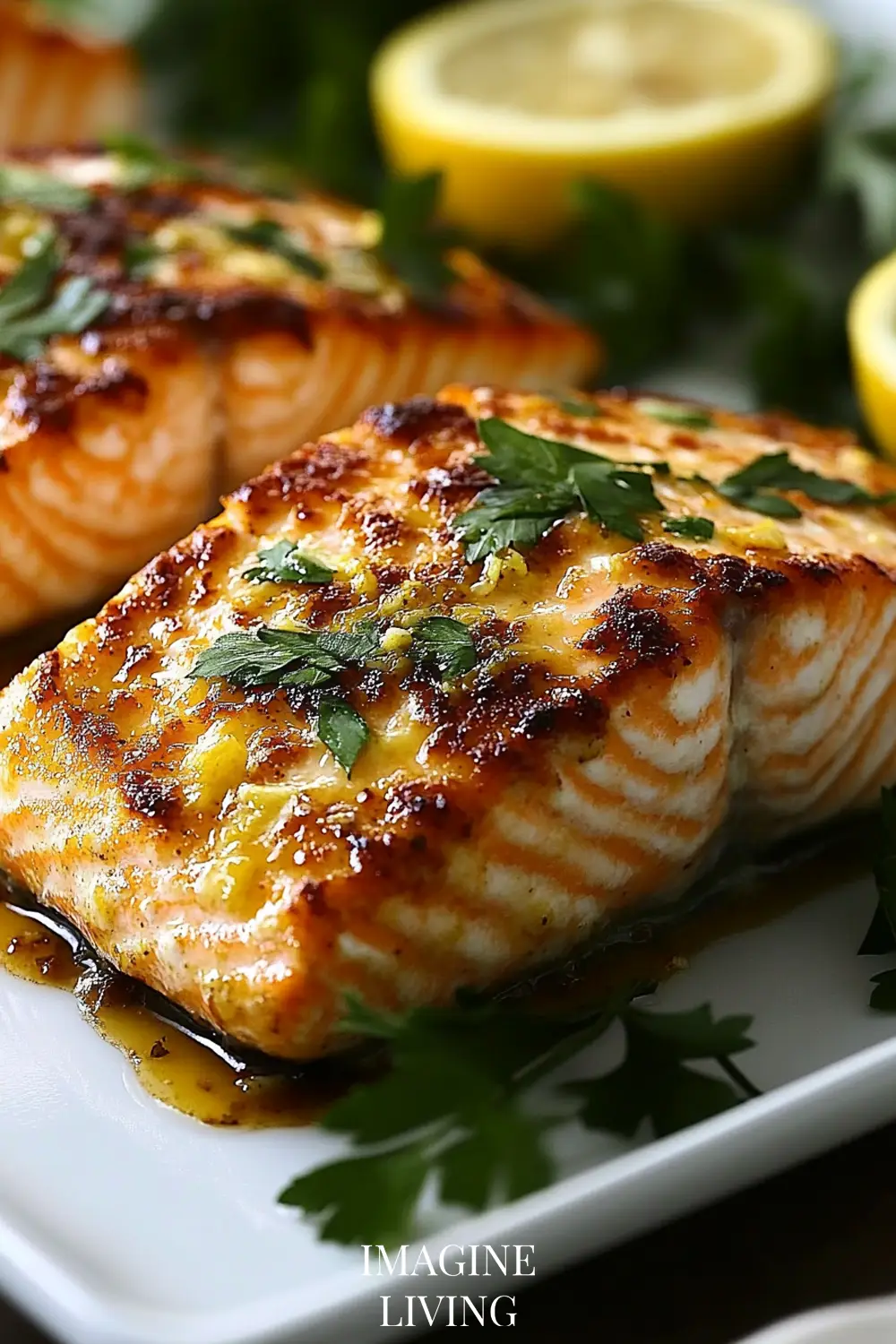 - Drizzle reserved butter sauce over the salmon, garnish with parsley, and serve immediately.