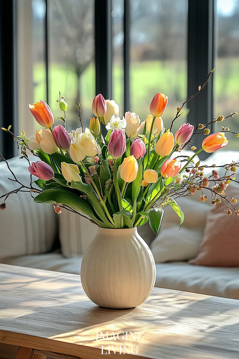 - Kitchen Counter – A small tulip bouquet in a ceramic vase adds an effortless spring touch.