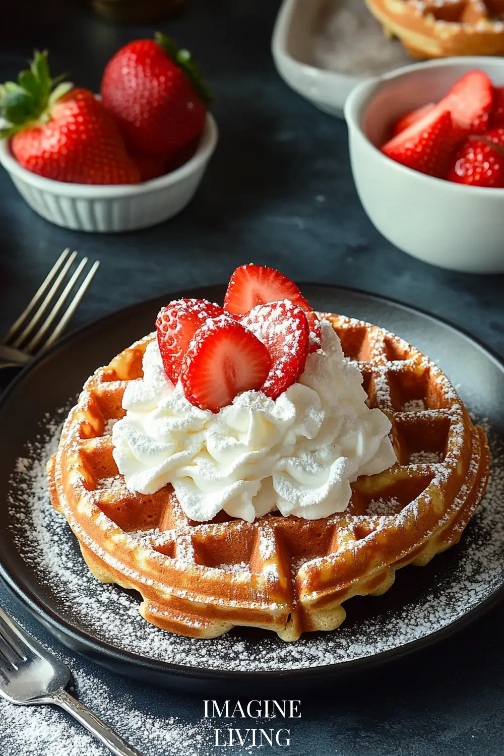 • Top with fresh strawberries, a dusting of powdered sugar, and a dollop of whipped cream.