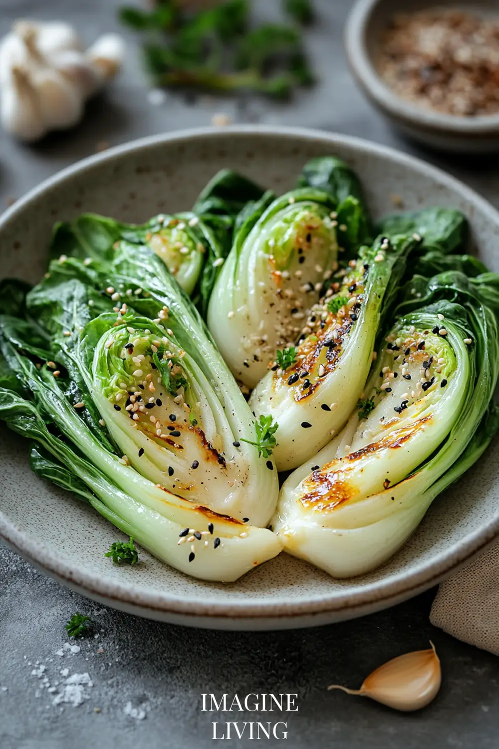 Preheat the grill to medium heat. Place the bok choy cut side down and grill for 3–4 minutes until slightly charred. Flip and grill the other side for an additional 2 minutes.