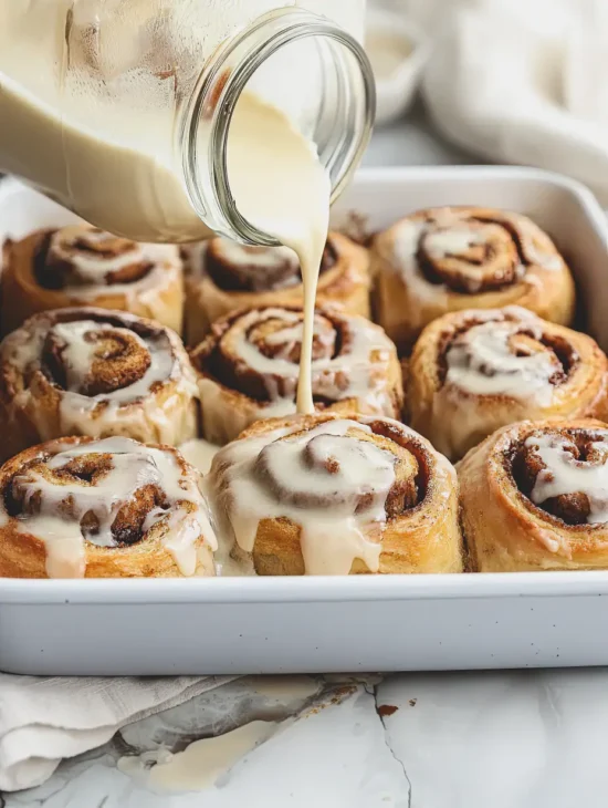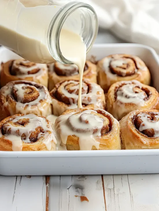 Pour the glaze while the rolls are still warm for maximum absorption. Drizzle evenly over each roll, letting it seep into the layers and edges for that dreamy, luscious finish.