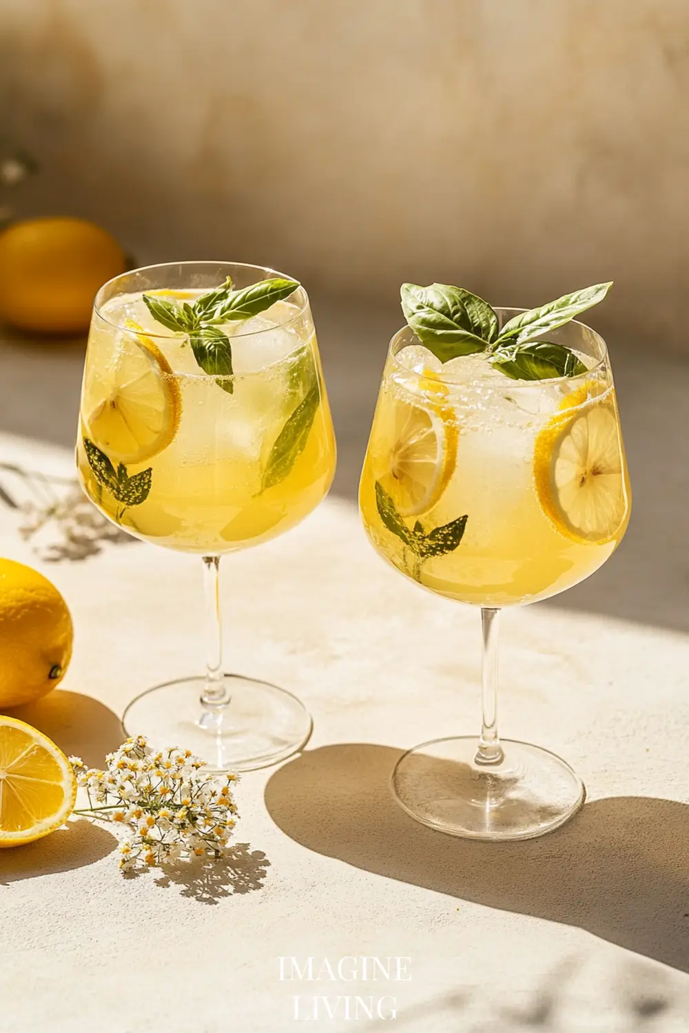 Lightly clap 2–3 basil or mint leaves between your palms and drop them into each glass. Add a lemon wheel or twist if desired.