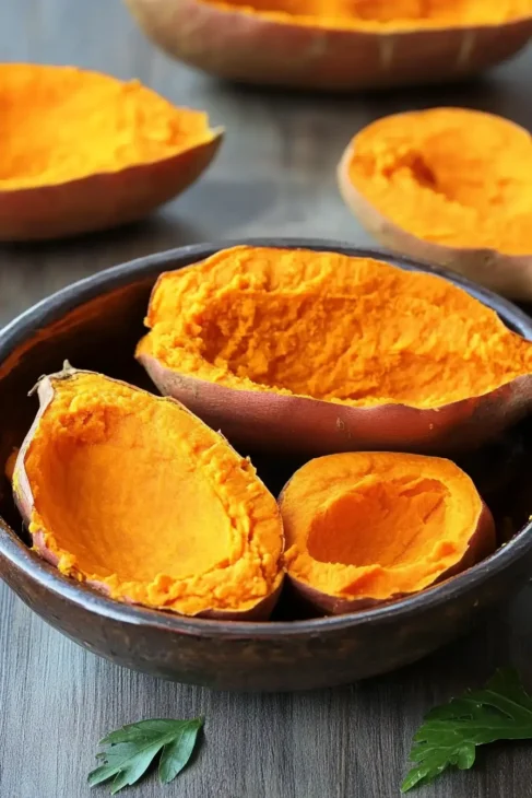 Let the sweet potatoes cool enough to handle. Slice them in half lengthwise and gently scoop out most of the flesh, leaving about ¼ inch behind to keep the skins sturdy. Save the scooped flesh for another use (sweet potato mash, anyone?).