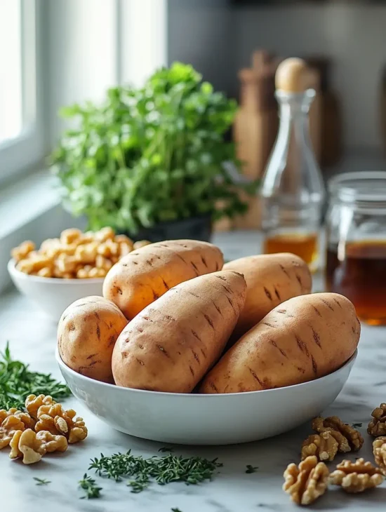 The key ingredients are vibrant sweet potatoes, crunchy walnuts, and pure maple syrup. They mix to create a perfect flavor and texture. Here’s what you’ll need: