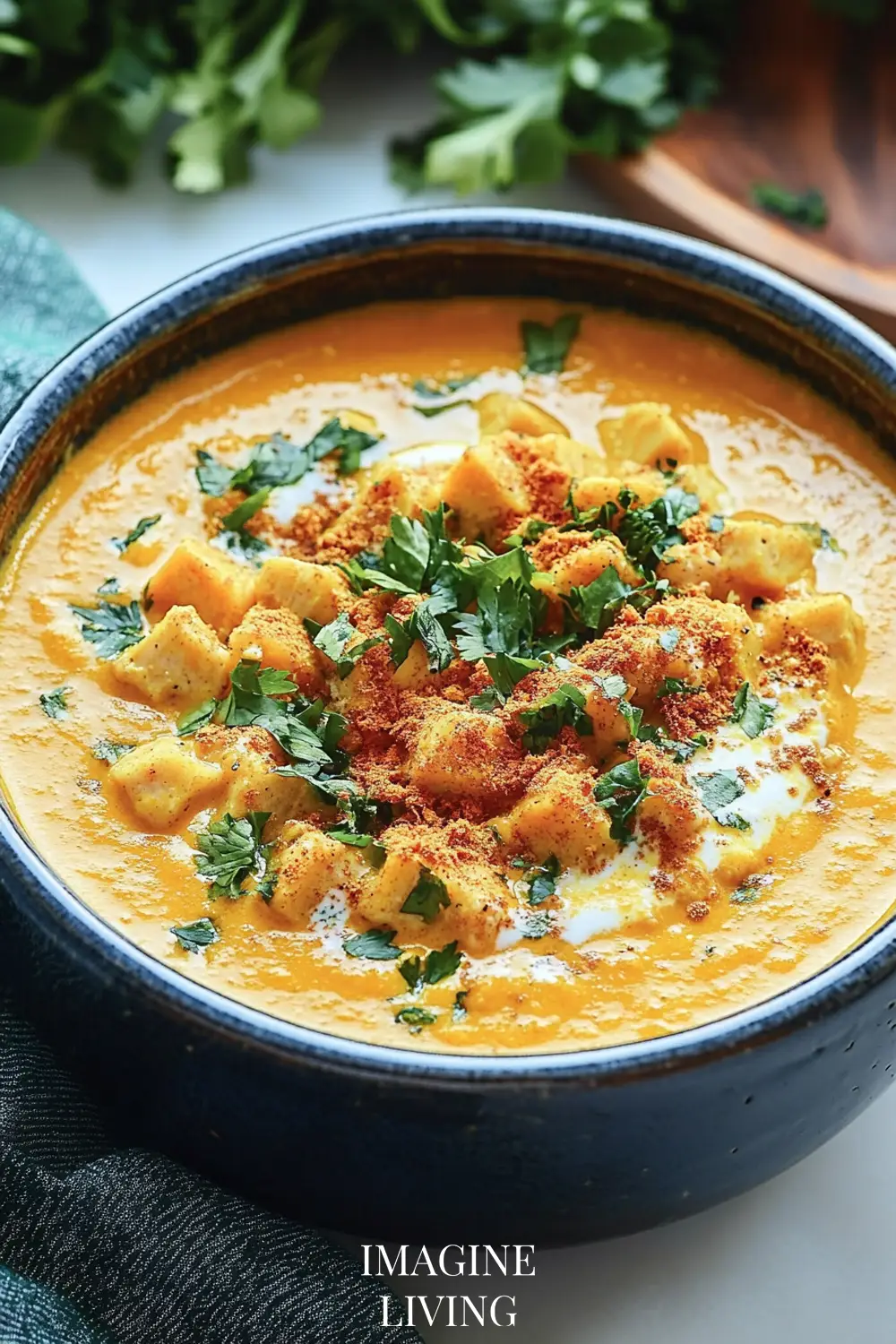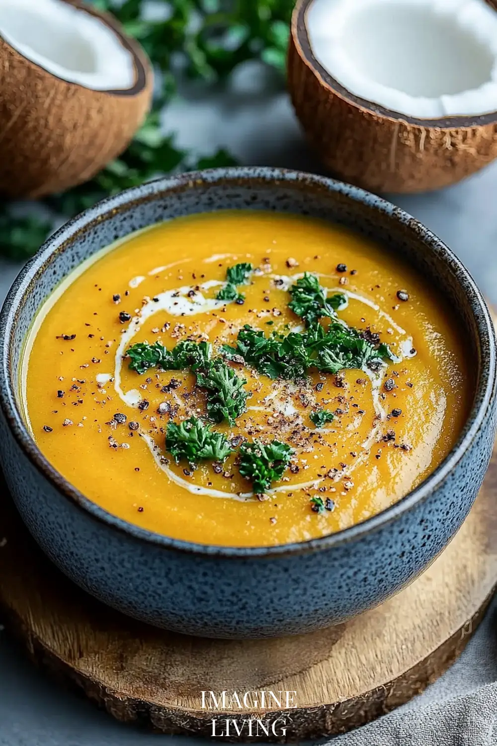 Ladle the soup into bowls, drizzle with a swirl of coconut milk, and sprinkle fresh cilantro or parsley on top.