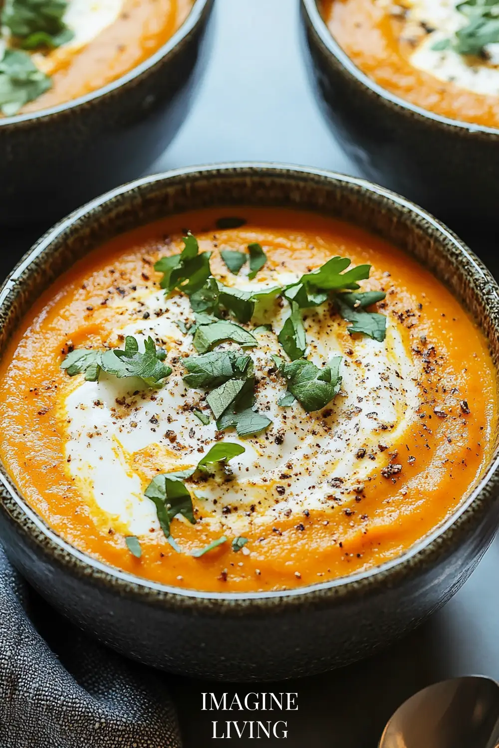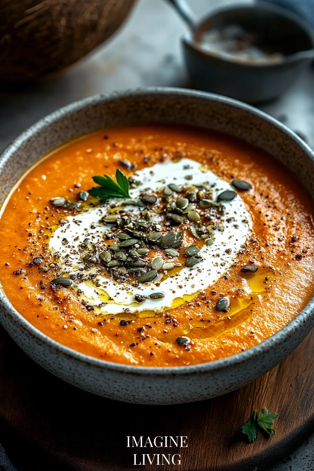 Crispy toppings like toasted seeds, nuts, or croutons add texture and contrast to the creamy soup.