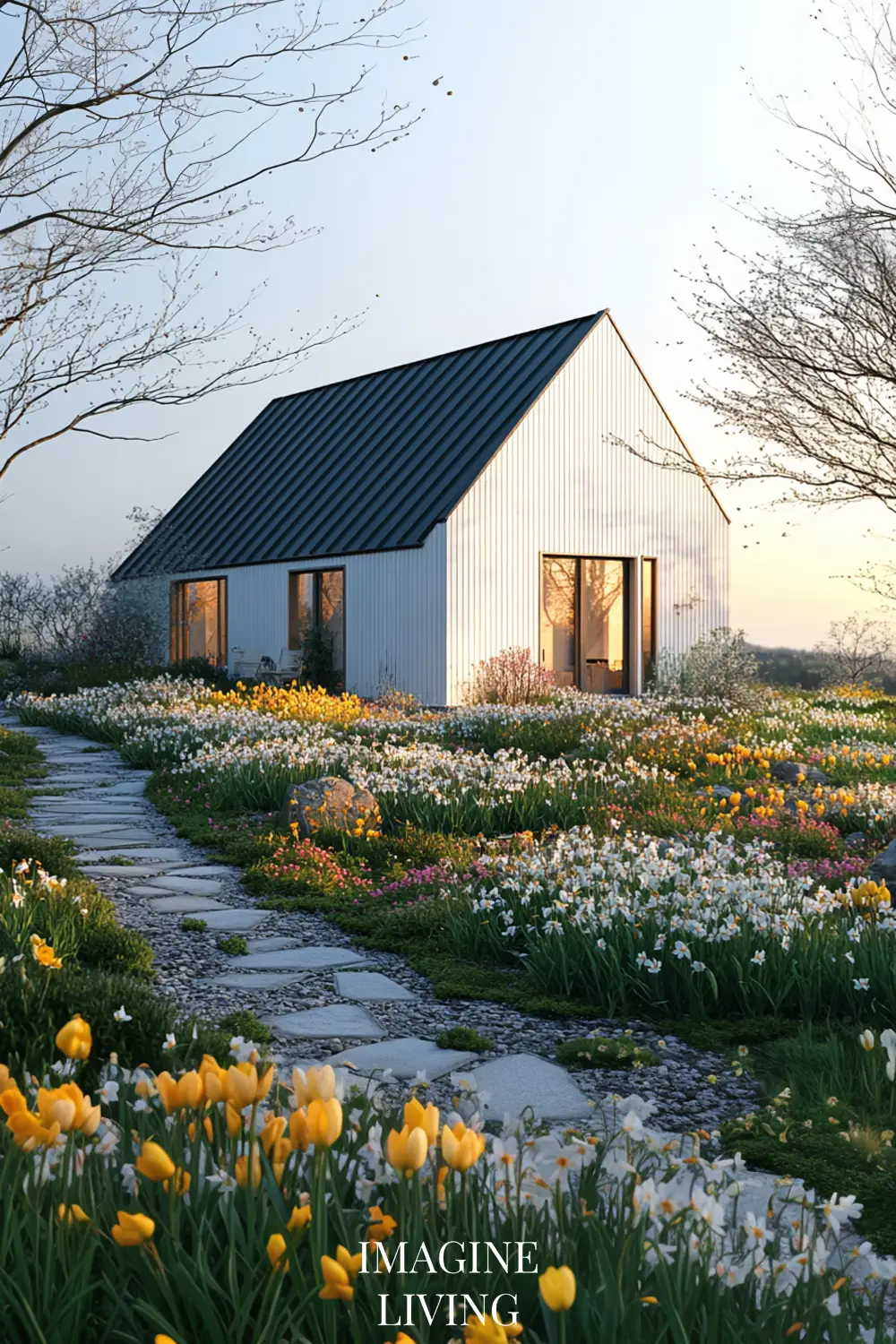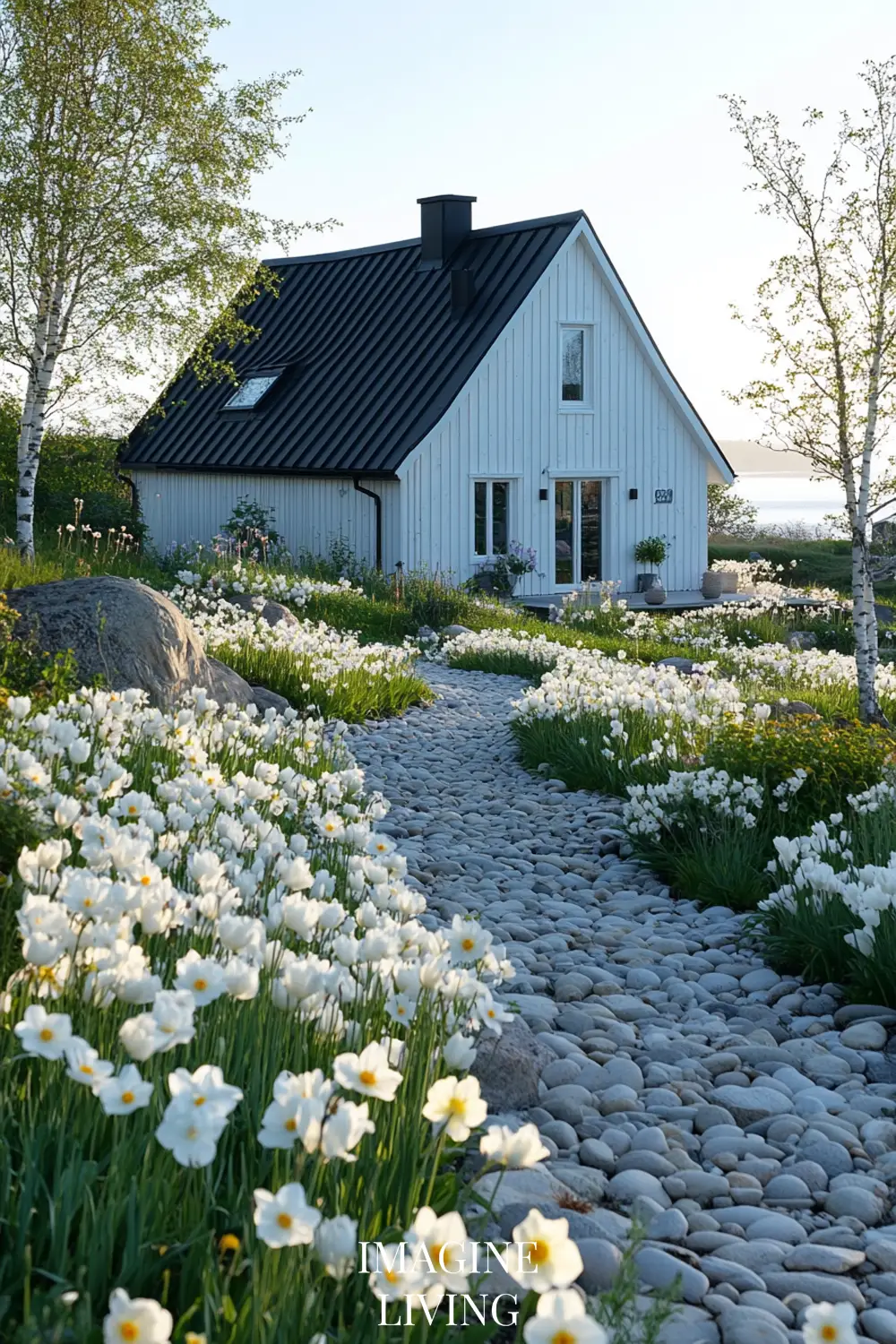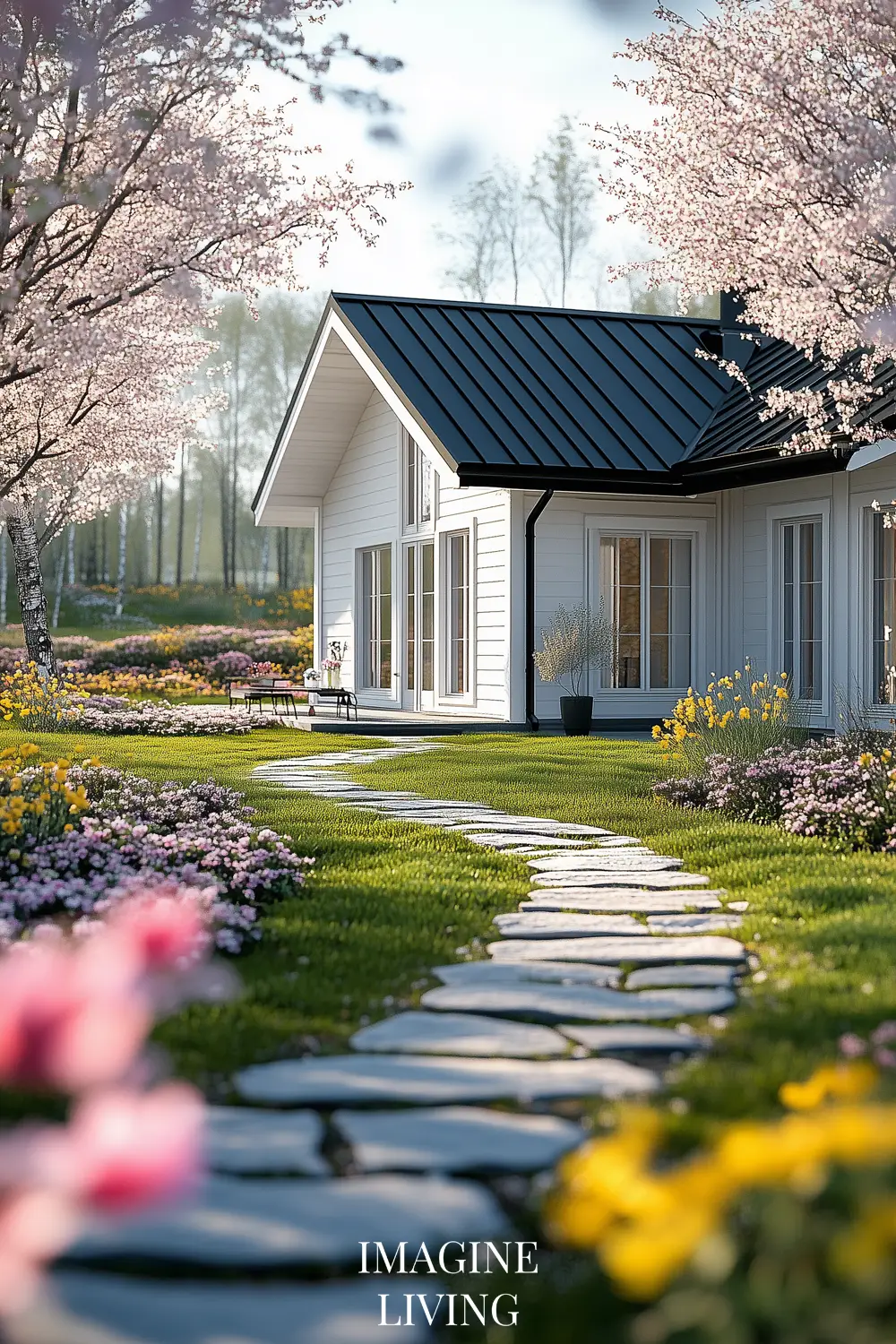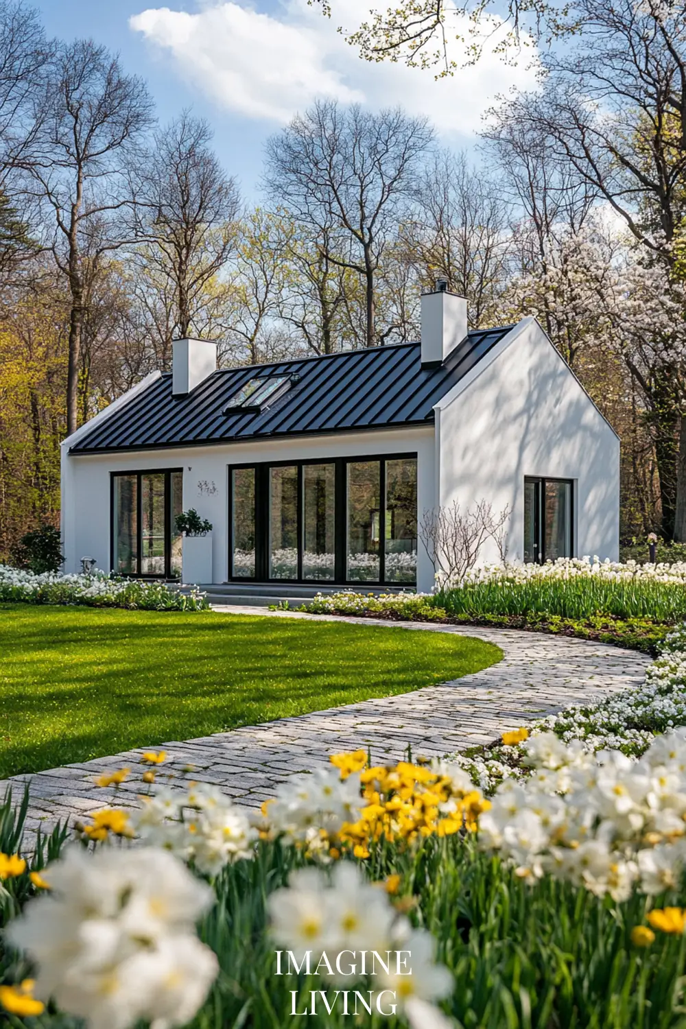 In spring, these homes take on an even more serene charm. White-washed facades, black metal or wood roofs, and clean lines are softened by gentle greenery and delicate blooms. The landscaping remains intentional yet unfussy, with neatly arranged flower patches, structured pathways, and natural stone elements that enhance the minimalist aesthetic without overwhelming it.