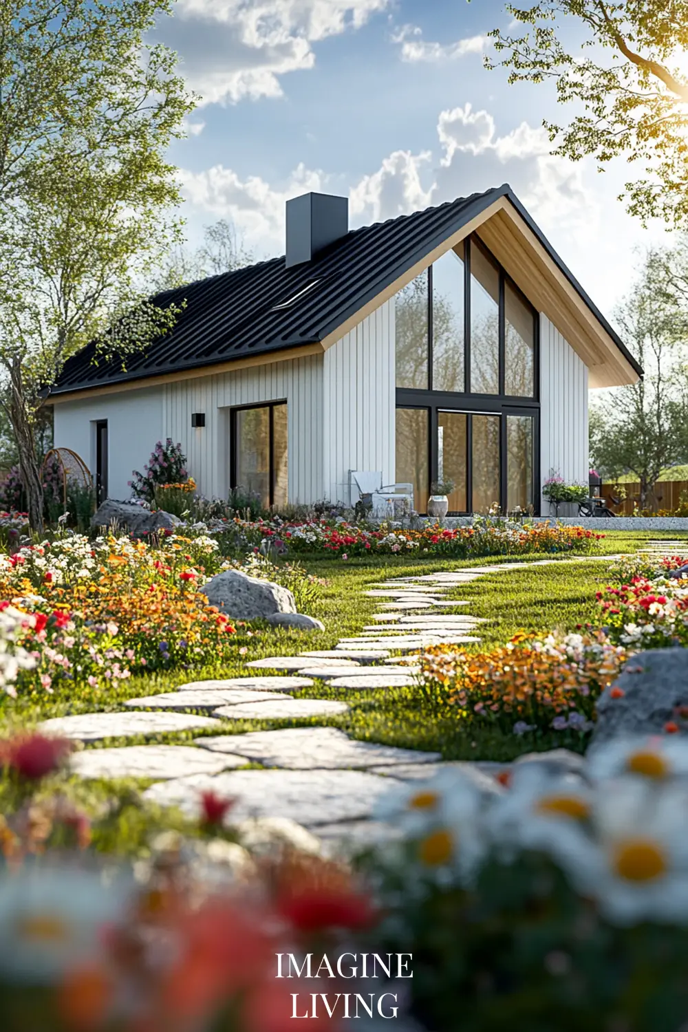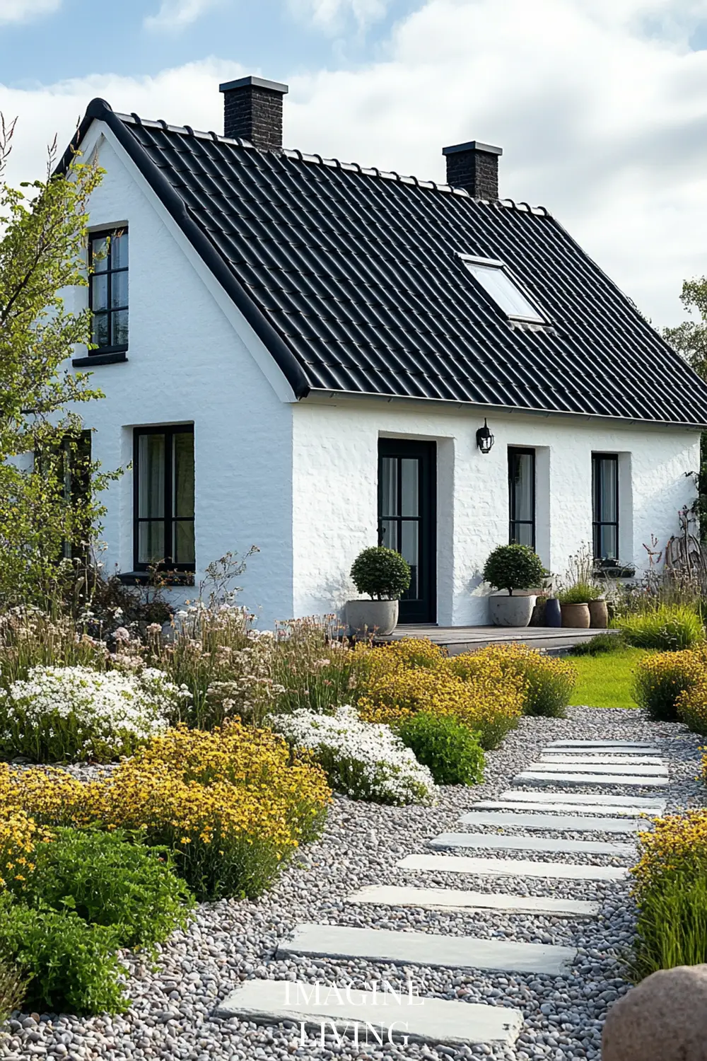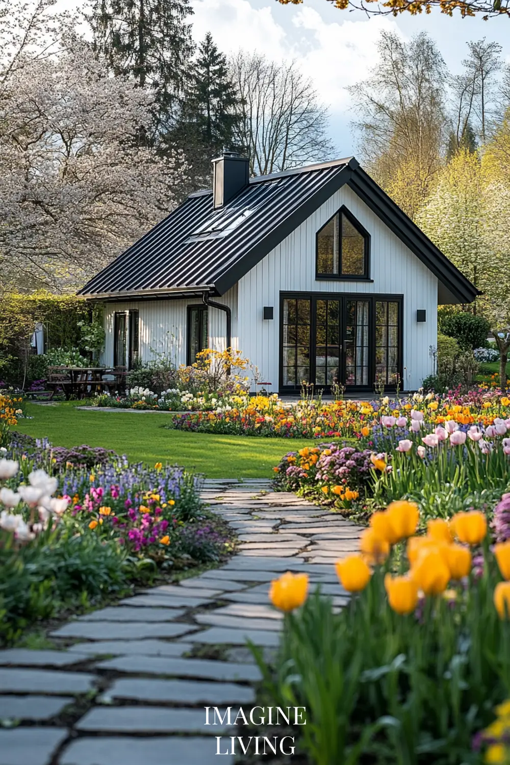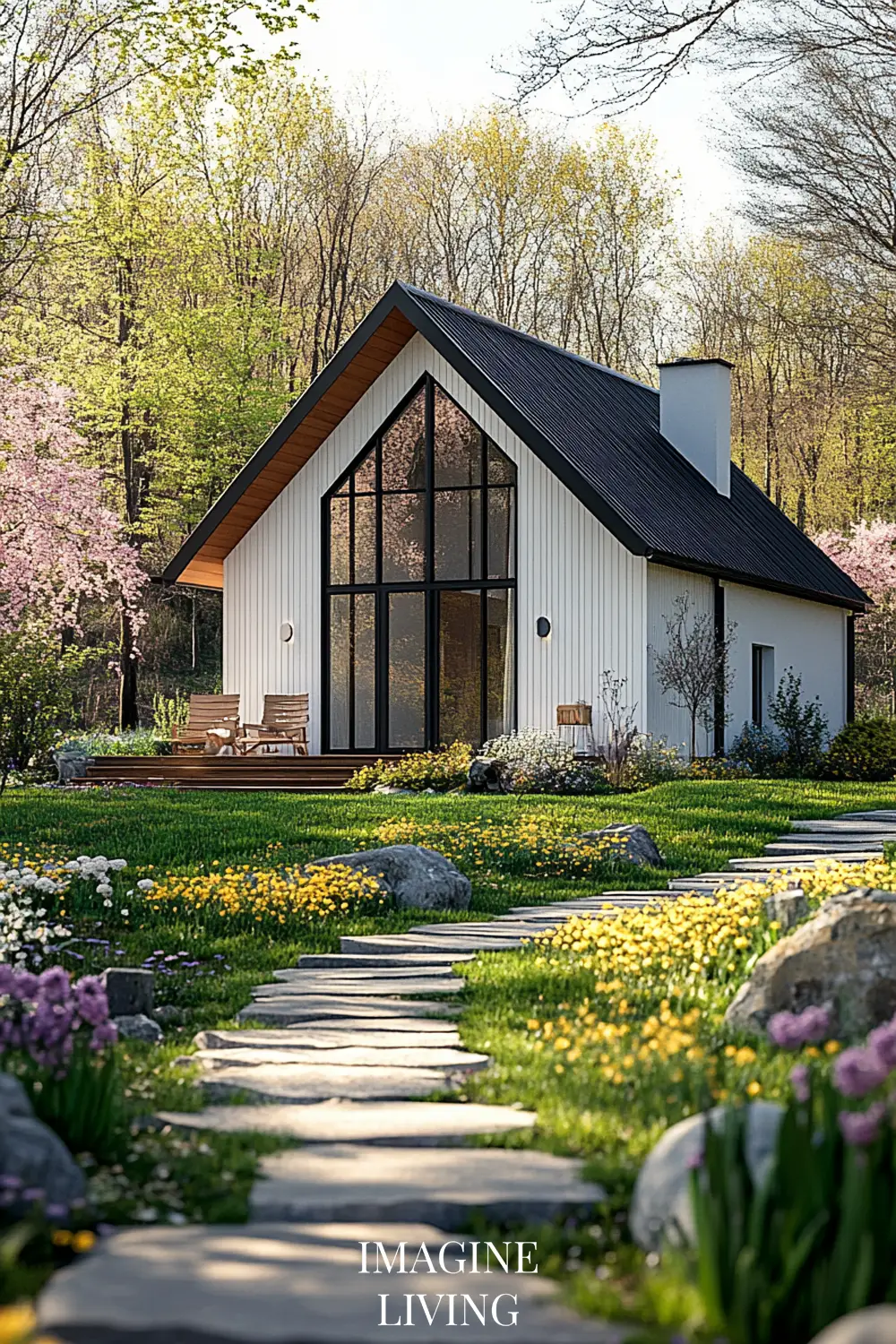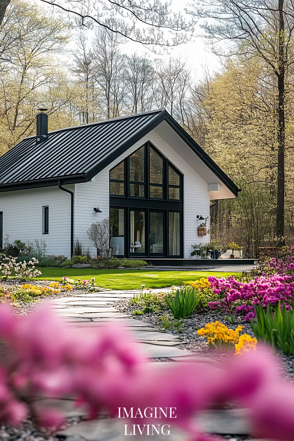 In spring, these homes take on an even more serene charm. White-washed facades, black metal or wood roofs, and clean lines are softened by gentle greenery and delicate blooms. The landscaping remains intentional yet unfussy, with neatly arranged flower patches, structured pathways, and natural stone elements that enhance the minimalist aesthetic without overwhelming it.