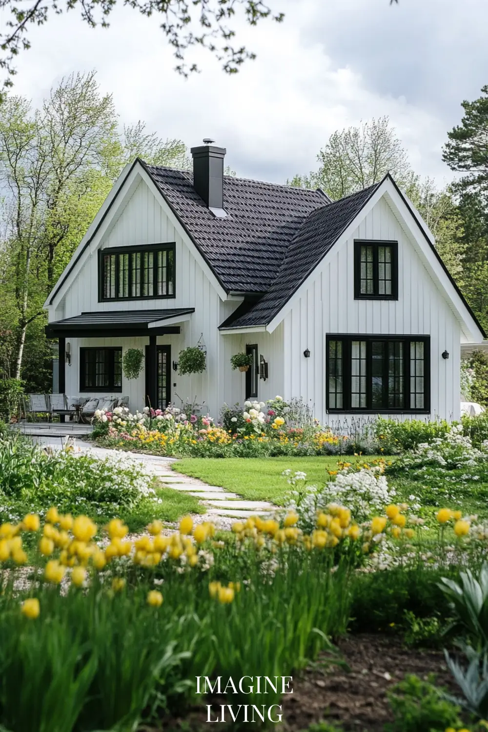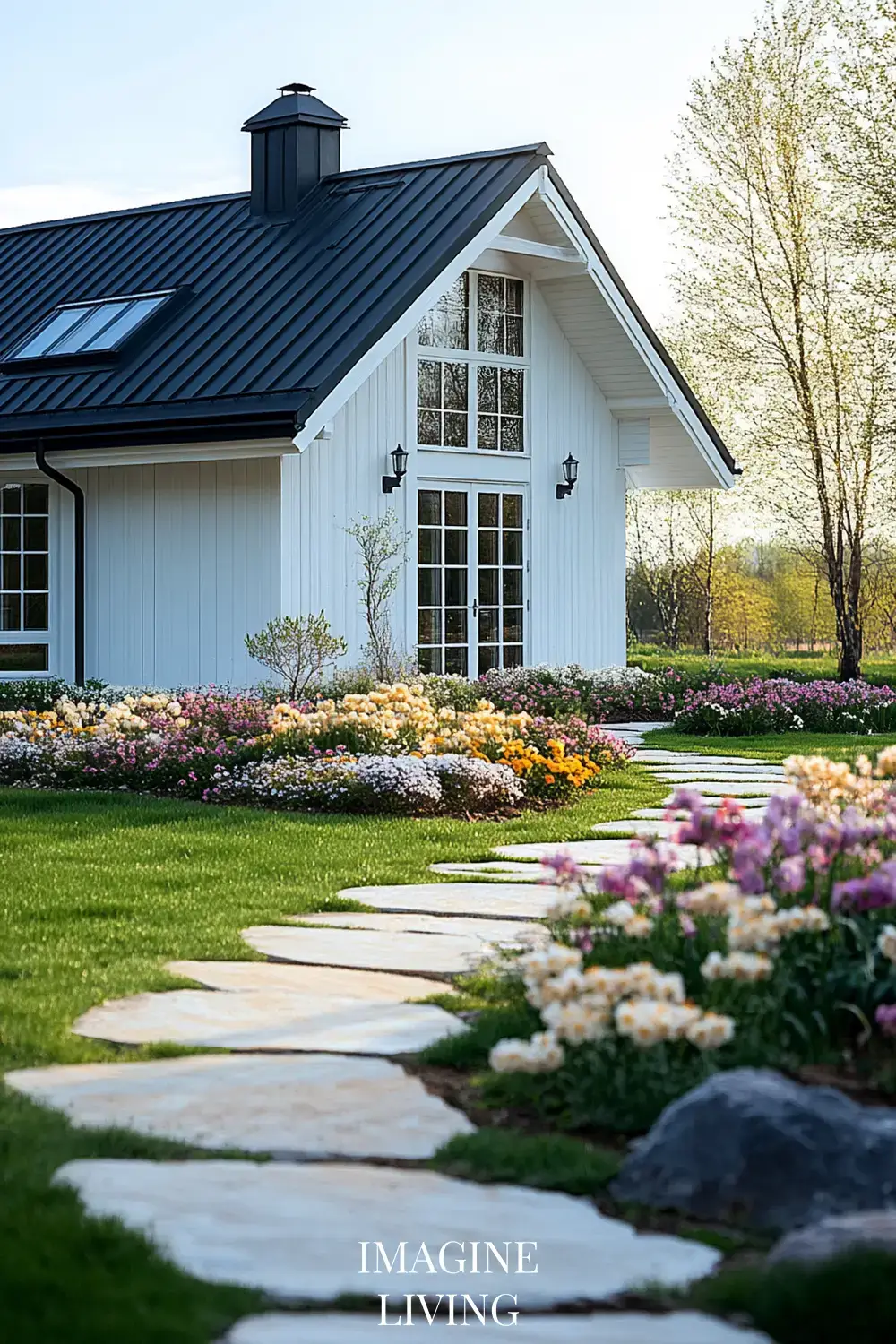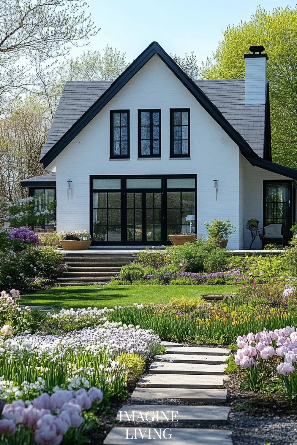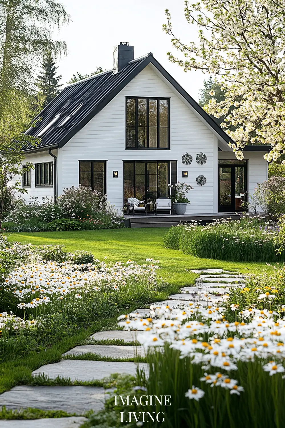 In spring, these homes take on an even more serene charm. White-washed facades, black metal or wood roofs, and clean lines are softened by gentle greenery and delicate blooms. The landscaping remains intentional yet unfussy, with neatly arranged flower patches, structured pathways, and natural stone elements that enhance the minimalist aesthetic without overwhelming it.