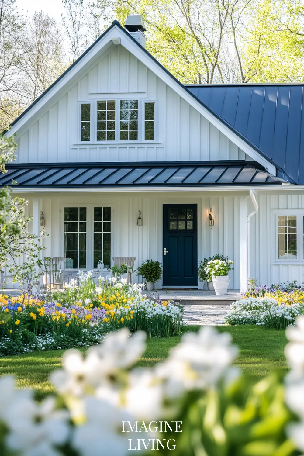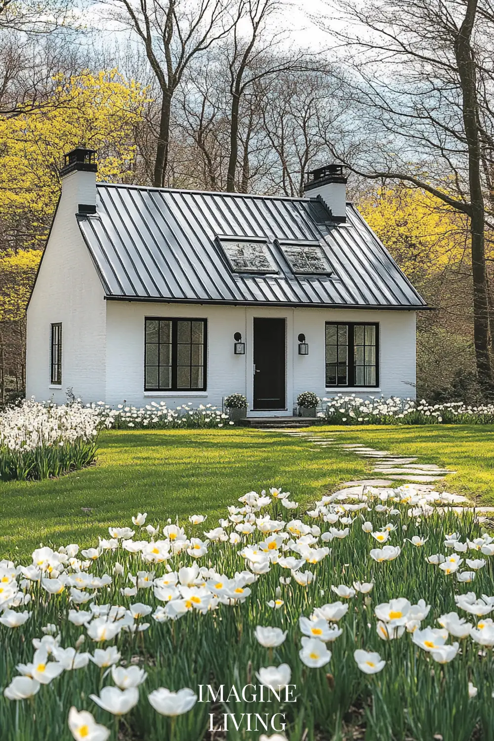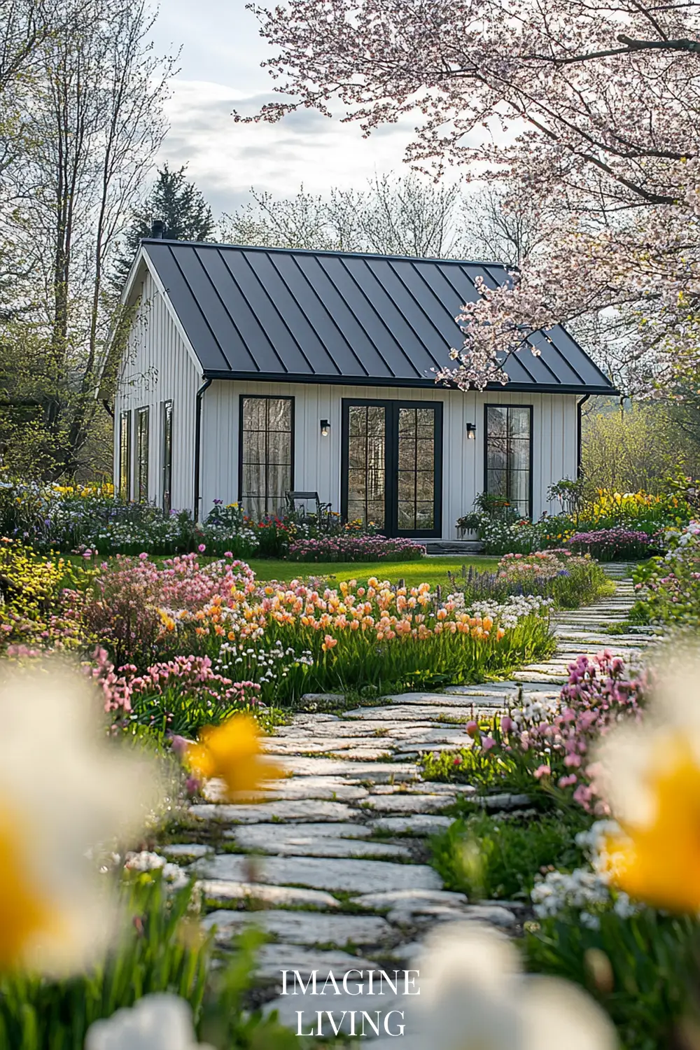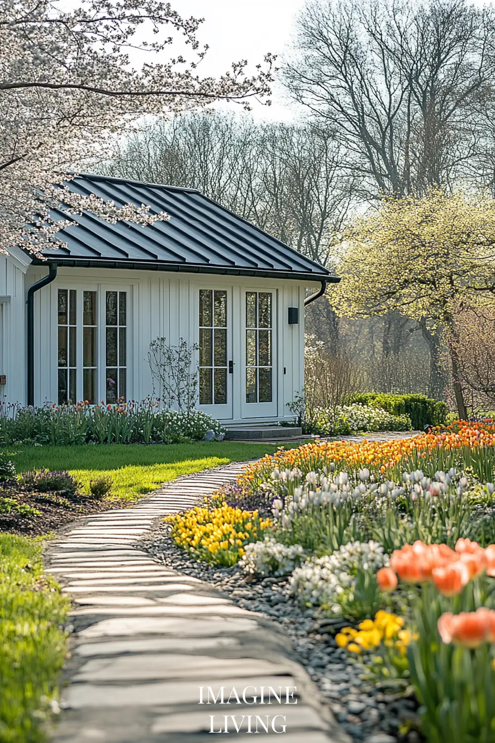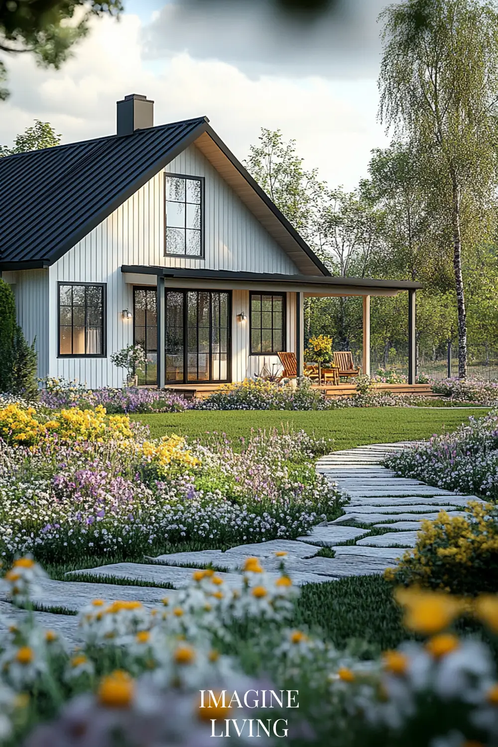 In spring, these homes take on an even more serene charm. White-washed facades, black metal or wood roofs, and clean lines are softened by gentle greenery and delicate blooms. The landscaping remains intentional yet unfussy, with neatly arranged flower patches, structured pathways, and natural stone elements that enhance the minimalist aesthetic without overwhelming it.