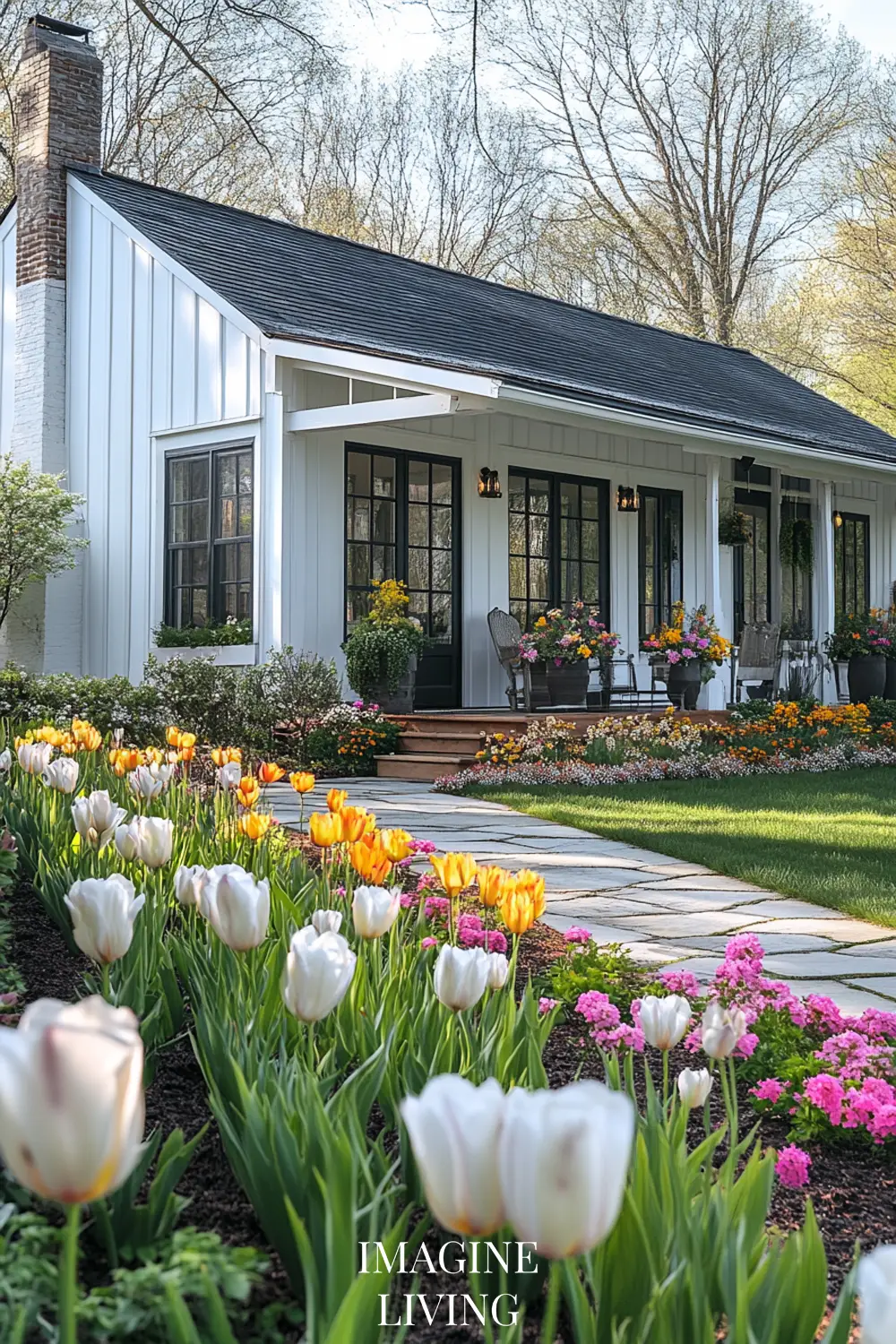 ✔ Soft, Neutral Color Palette: White tulips, daffodils, and subtle yellows or soft pinks add gentle warmth against cool-toned facades.