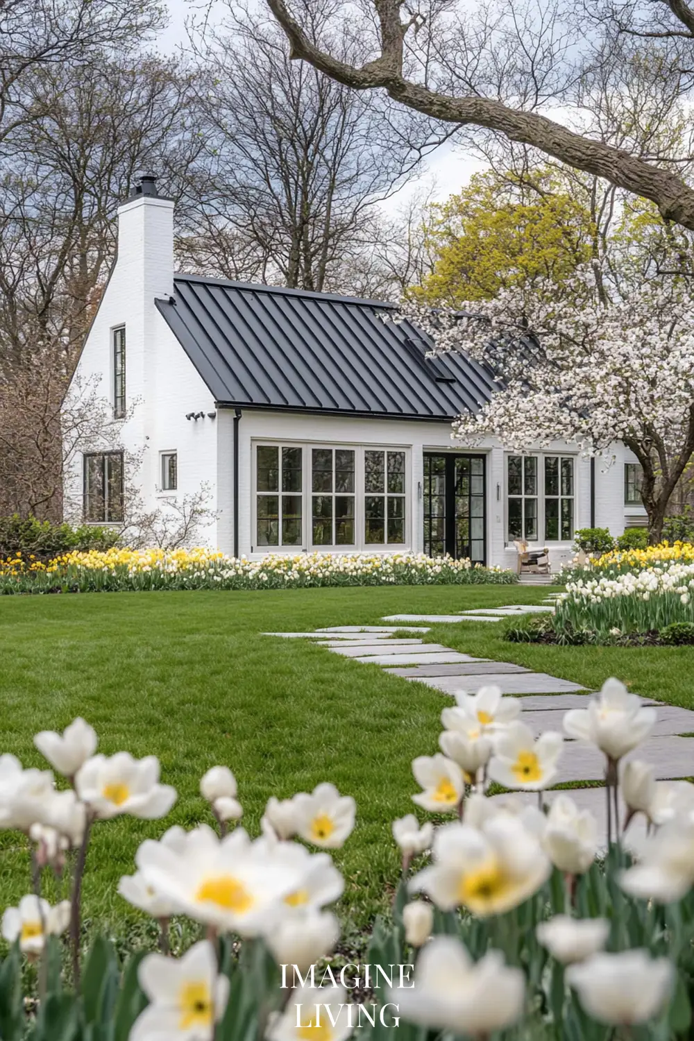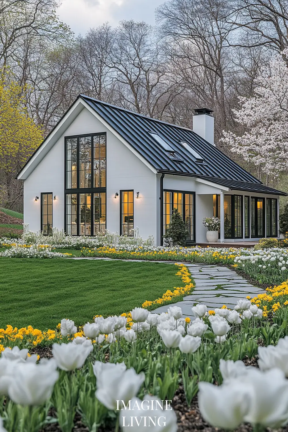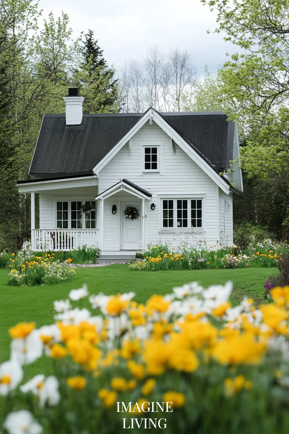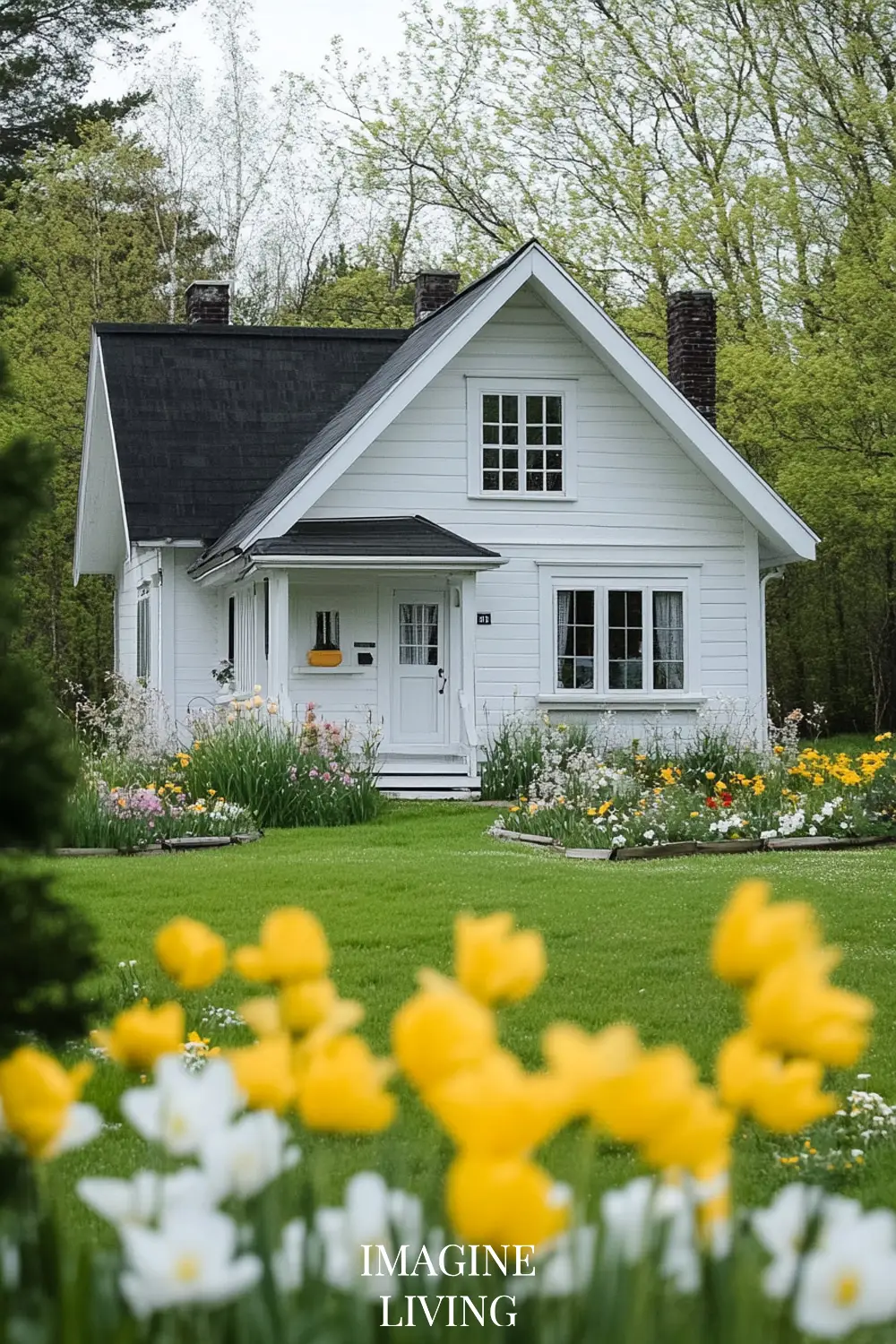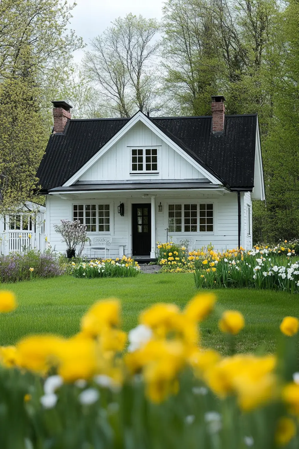 - White cottage + yellow and white flowers (tulips, daffodils, and delicate wildflowers) for a fresh, inviting spring look.