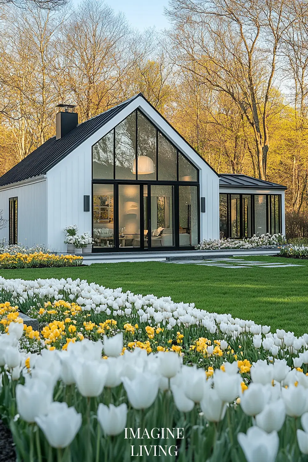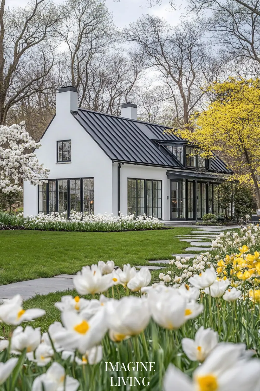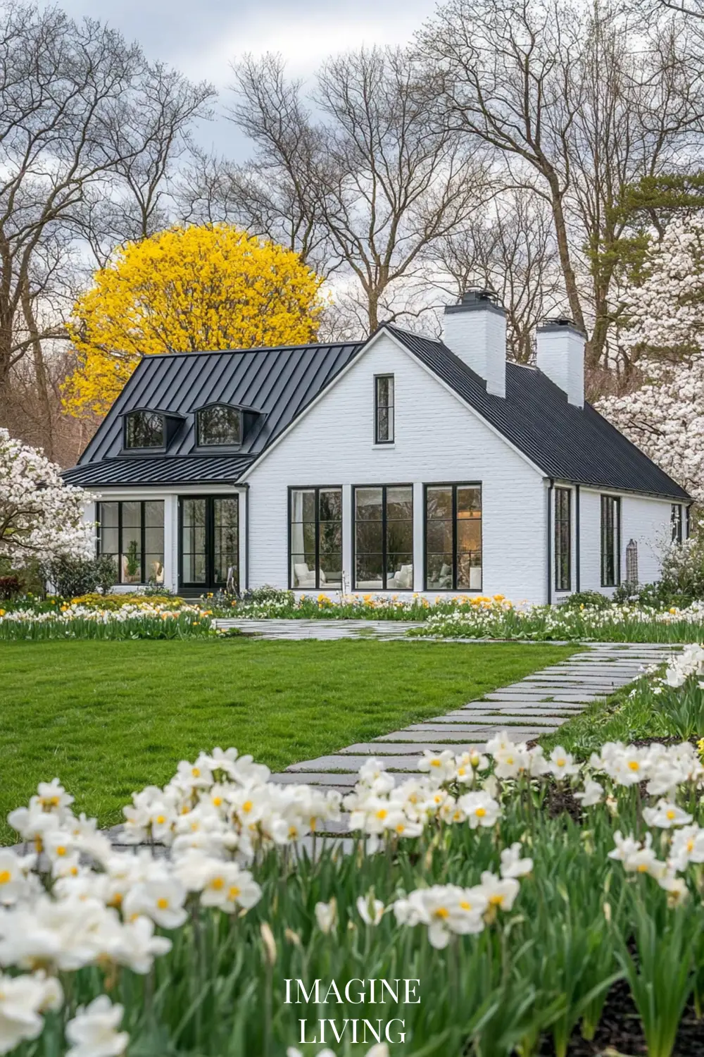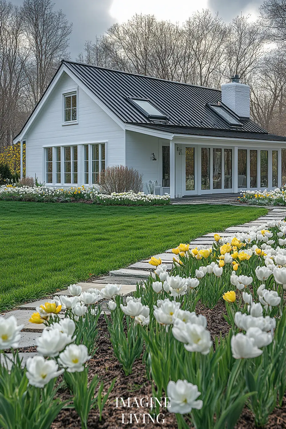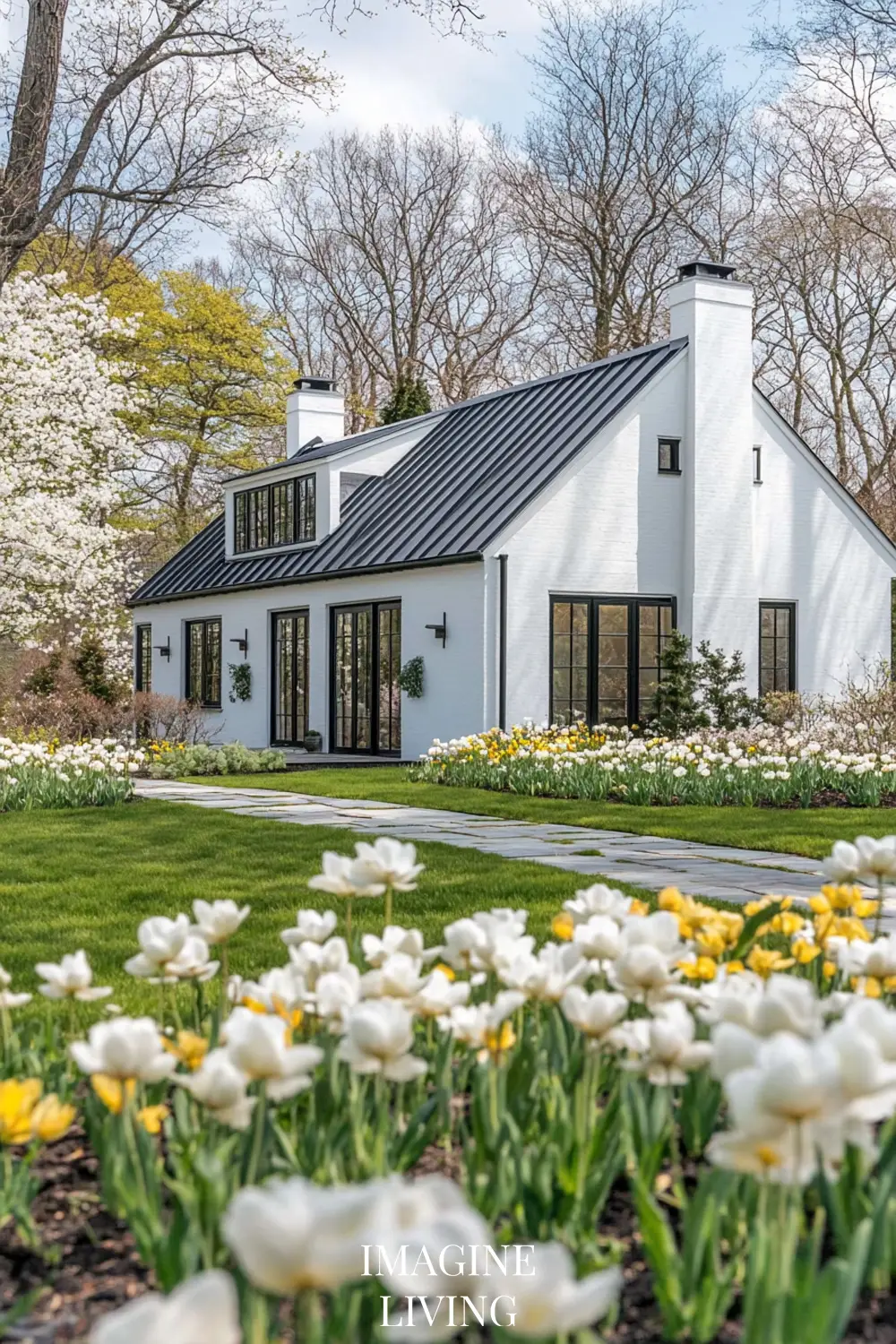 - White cottage + yellow and white flowers (tulips, daffodils, and delicate wildflowers) for a fresh, inviting spring look.