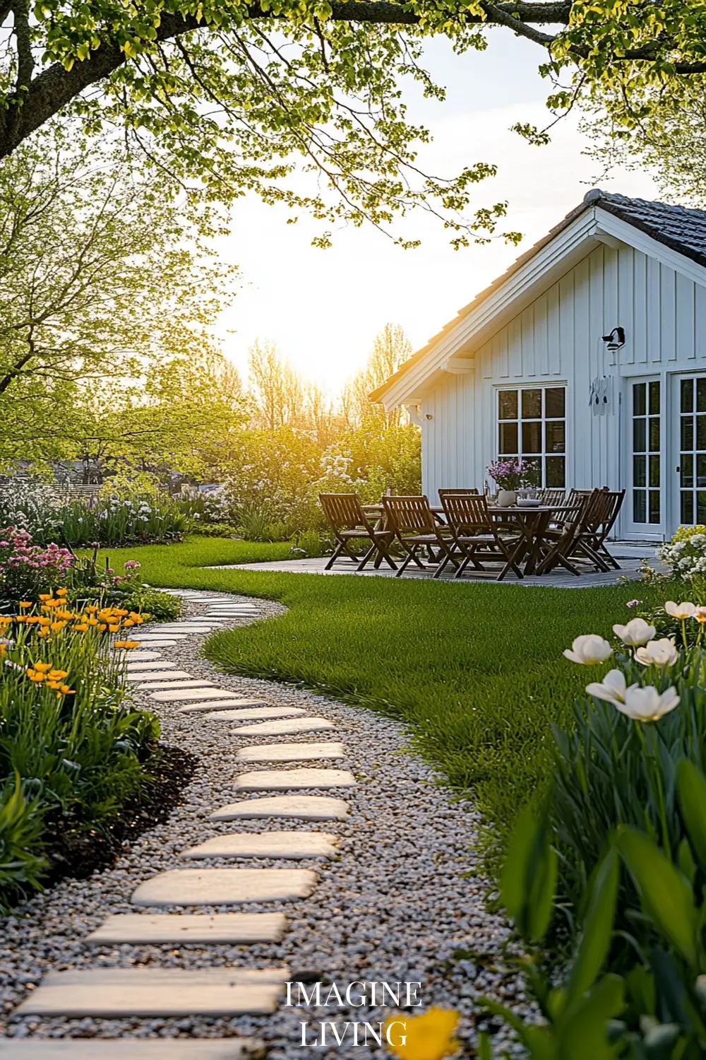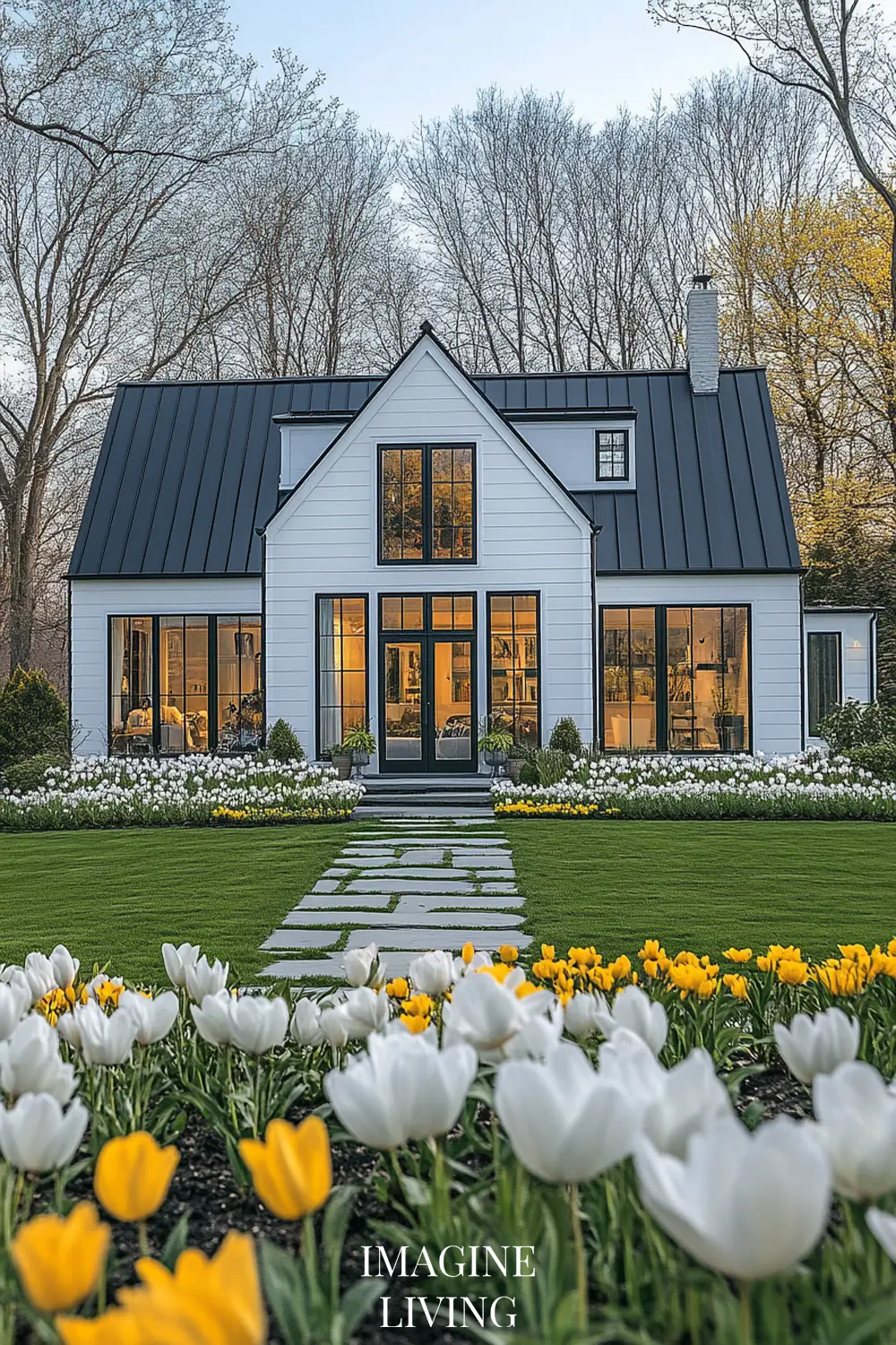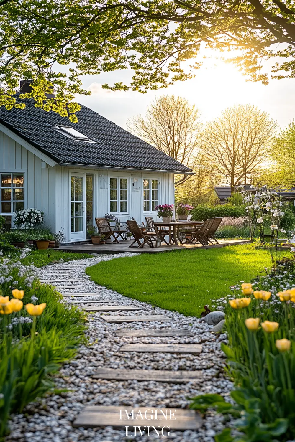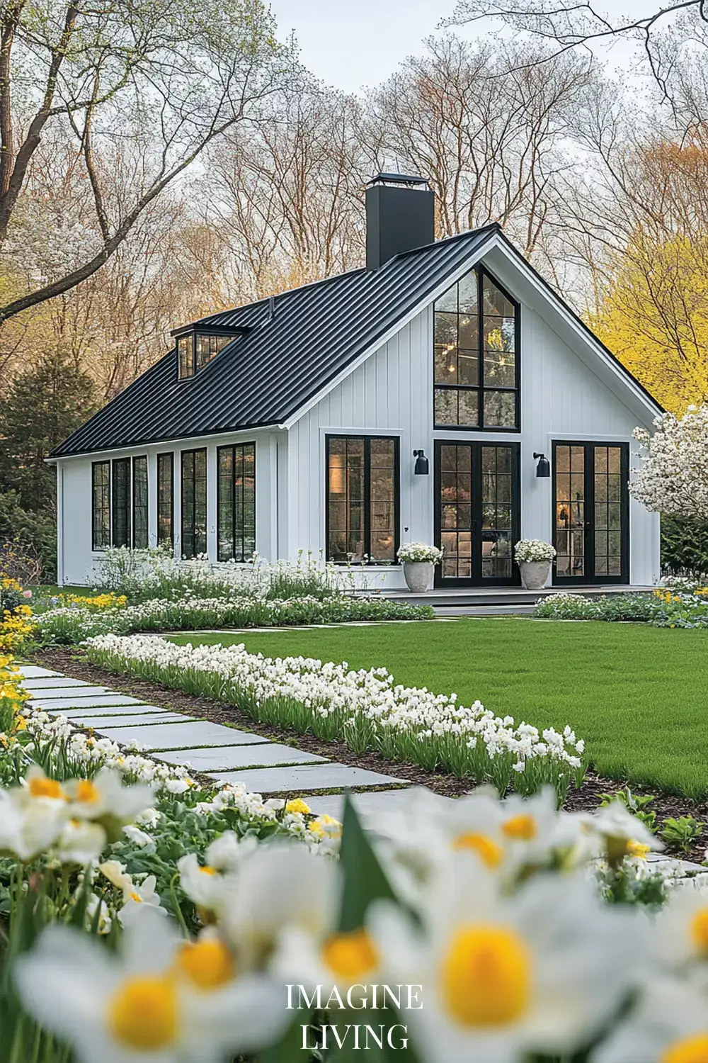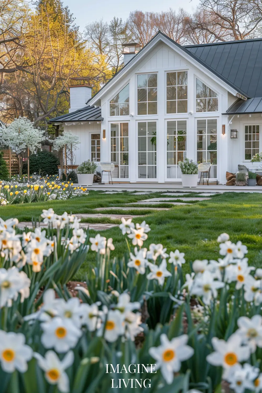 - White cottage + yellow and white flowers (tulips, daffodils, and delicate wildflowers) for a fresh, inviting spring look.