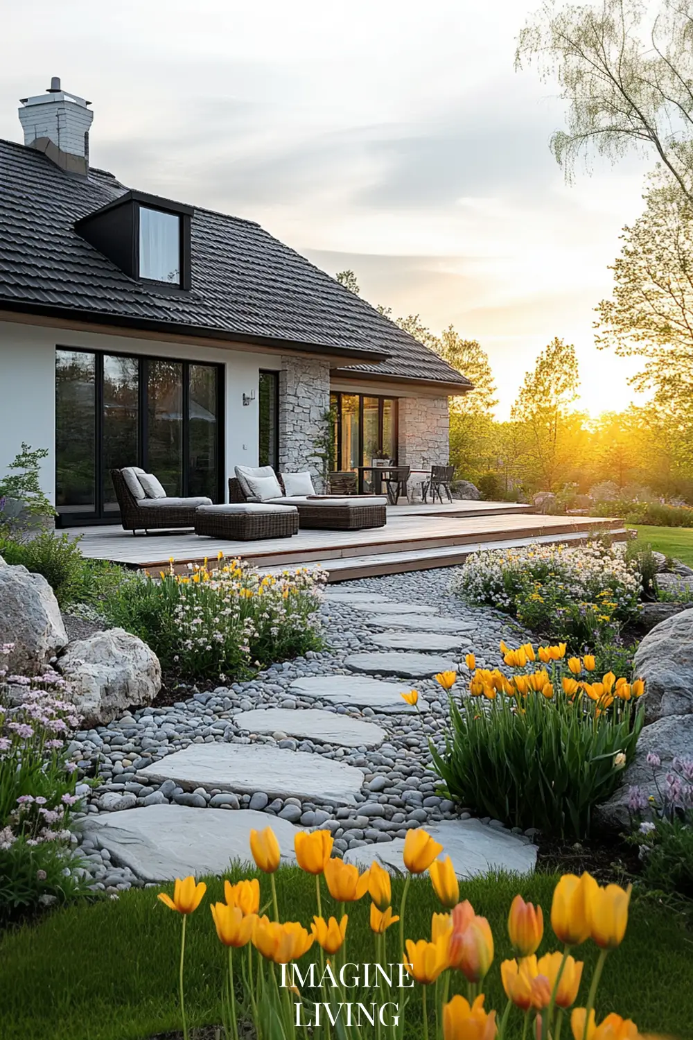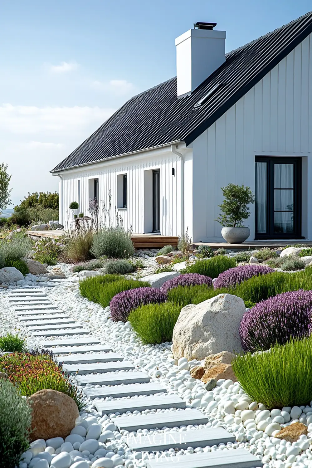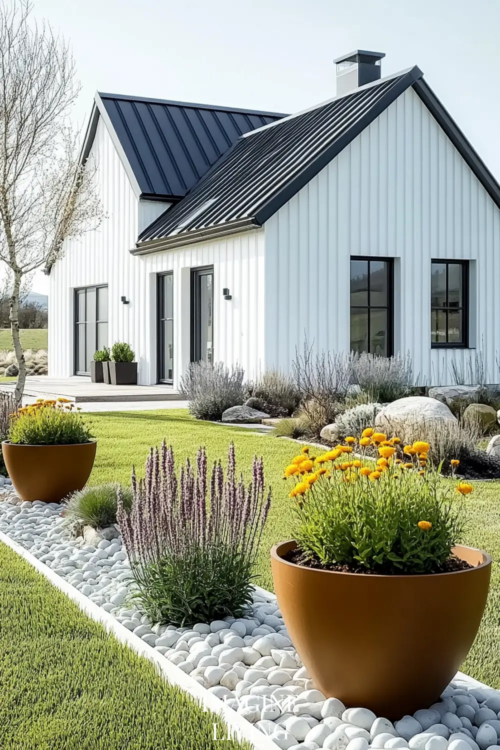 - Warm up the look with wooden benches, planters, or stone garden edging.