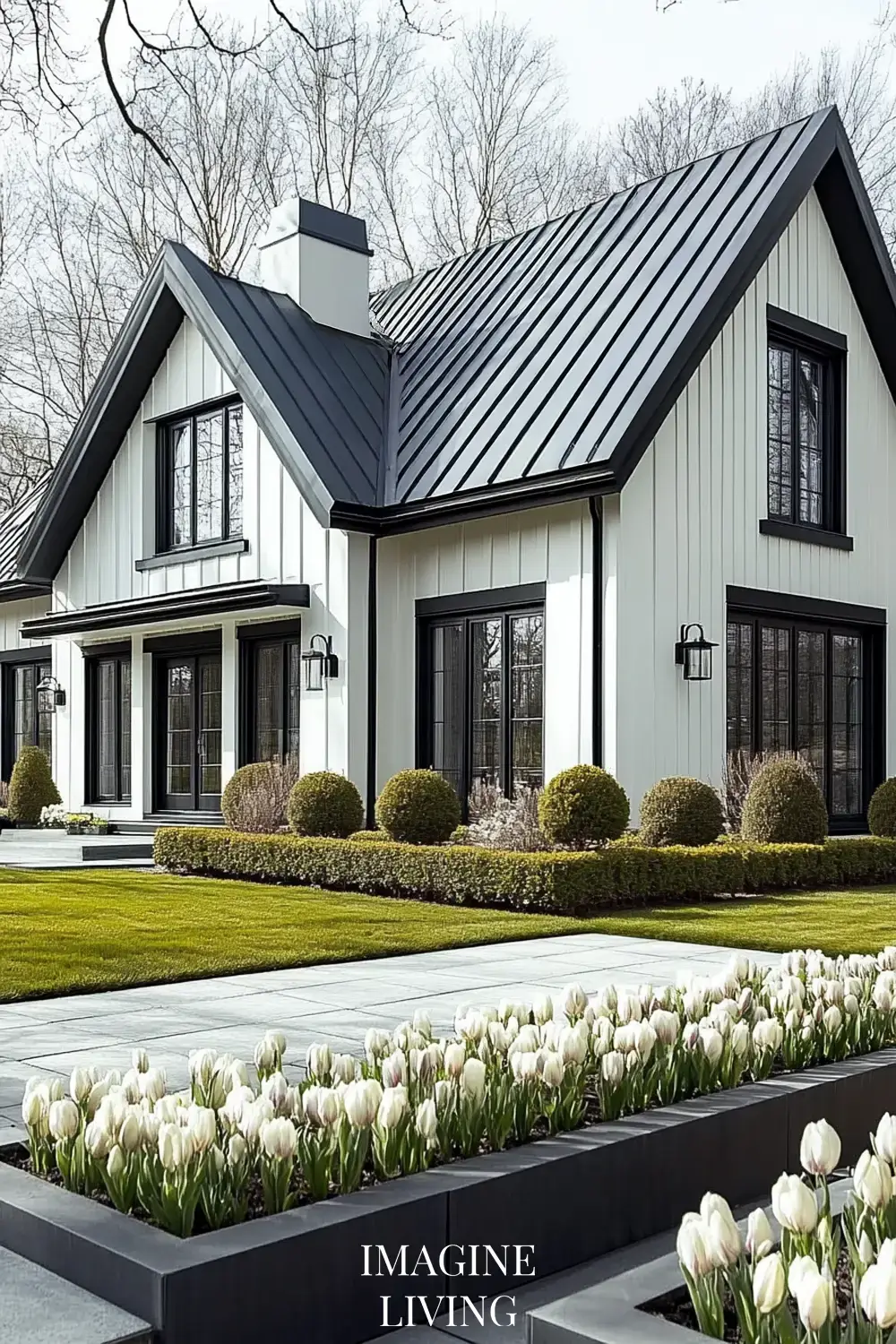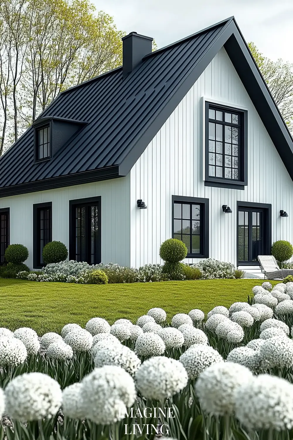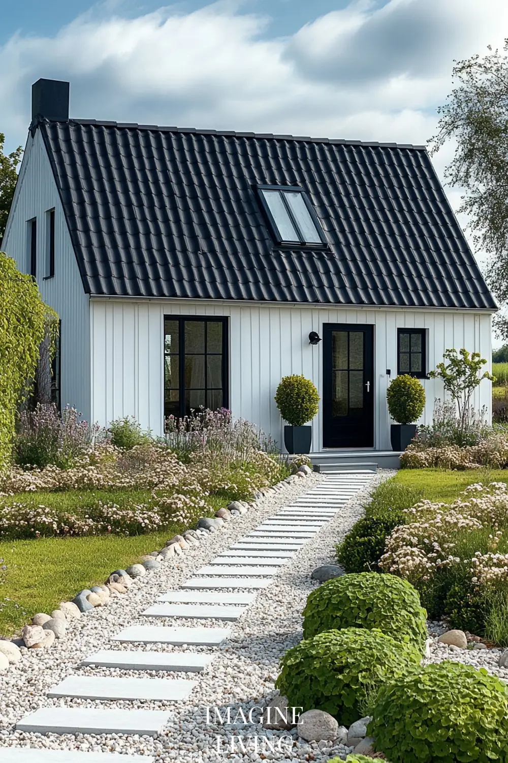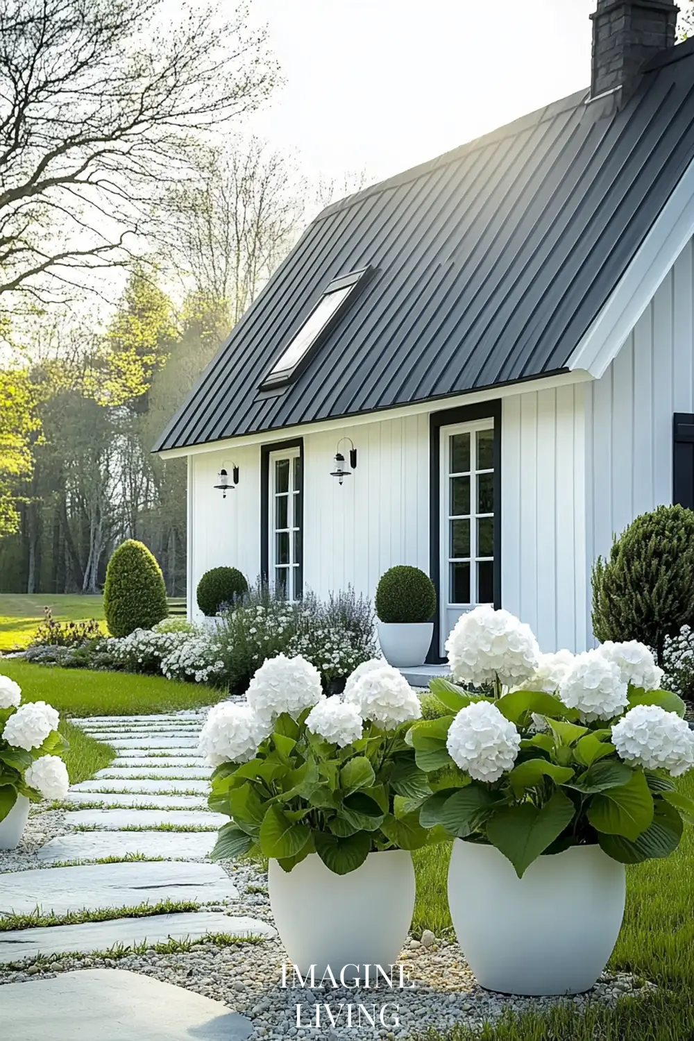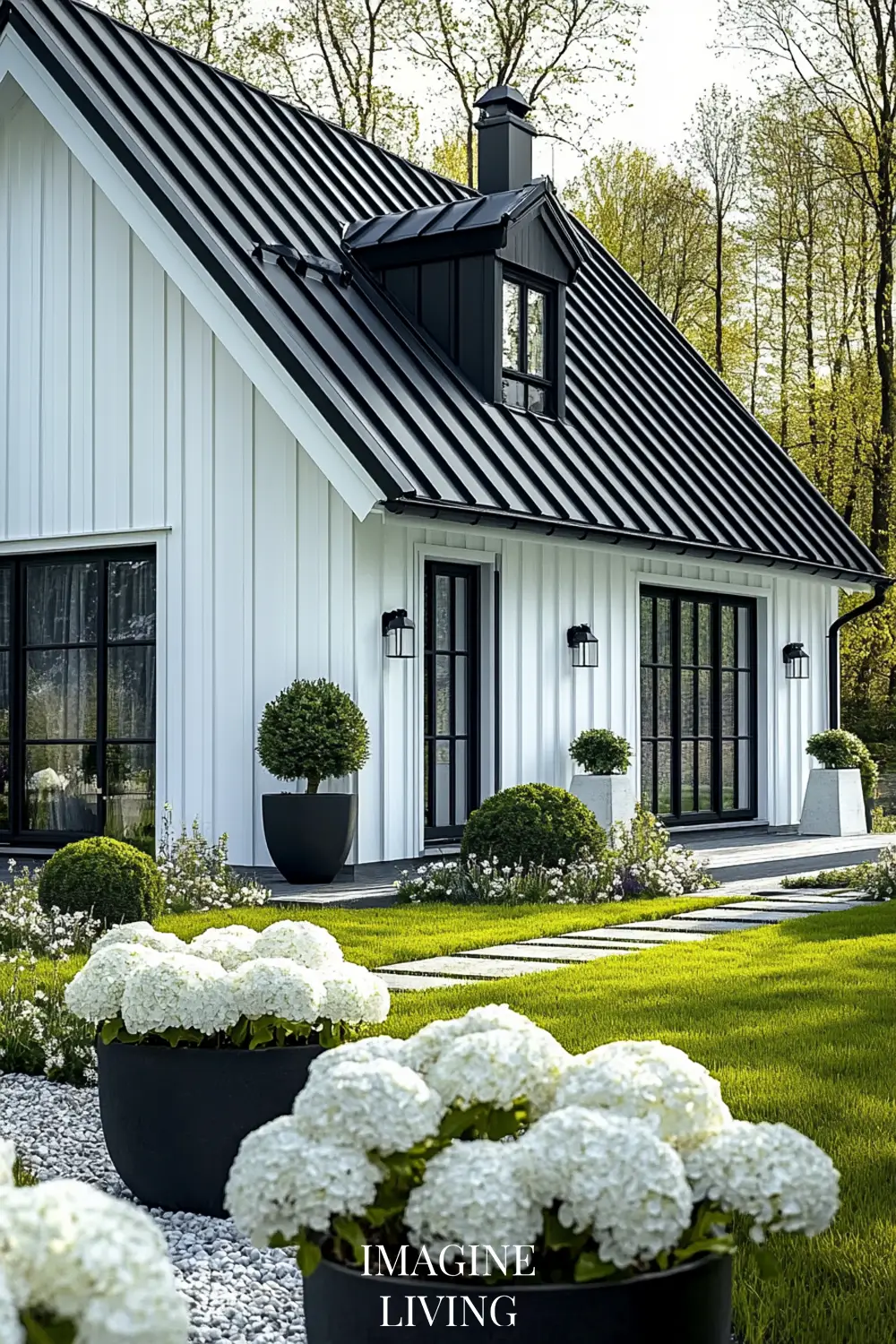 - Black-roofed white home + structured green hedges and white flowering trees for a clean, Nordic-inspired aesthetic.