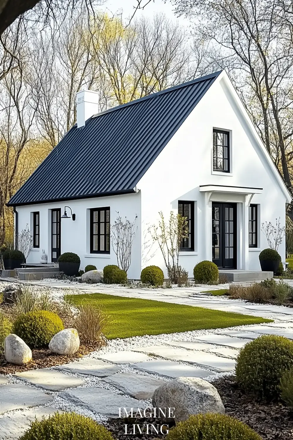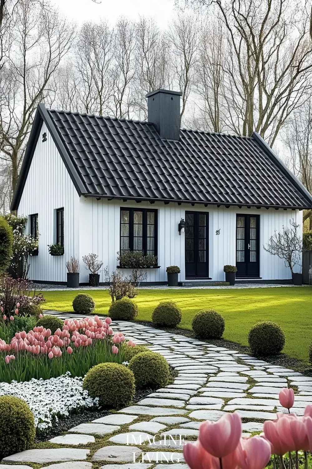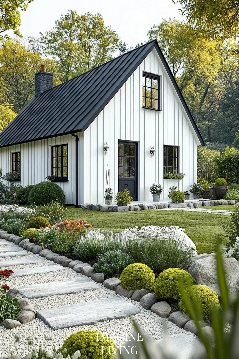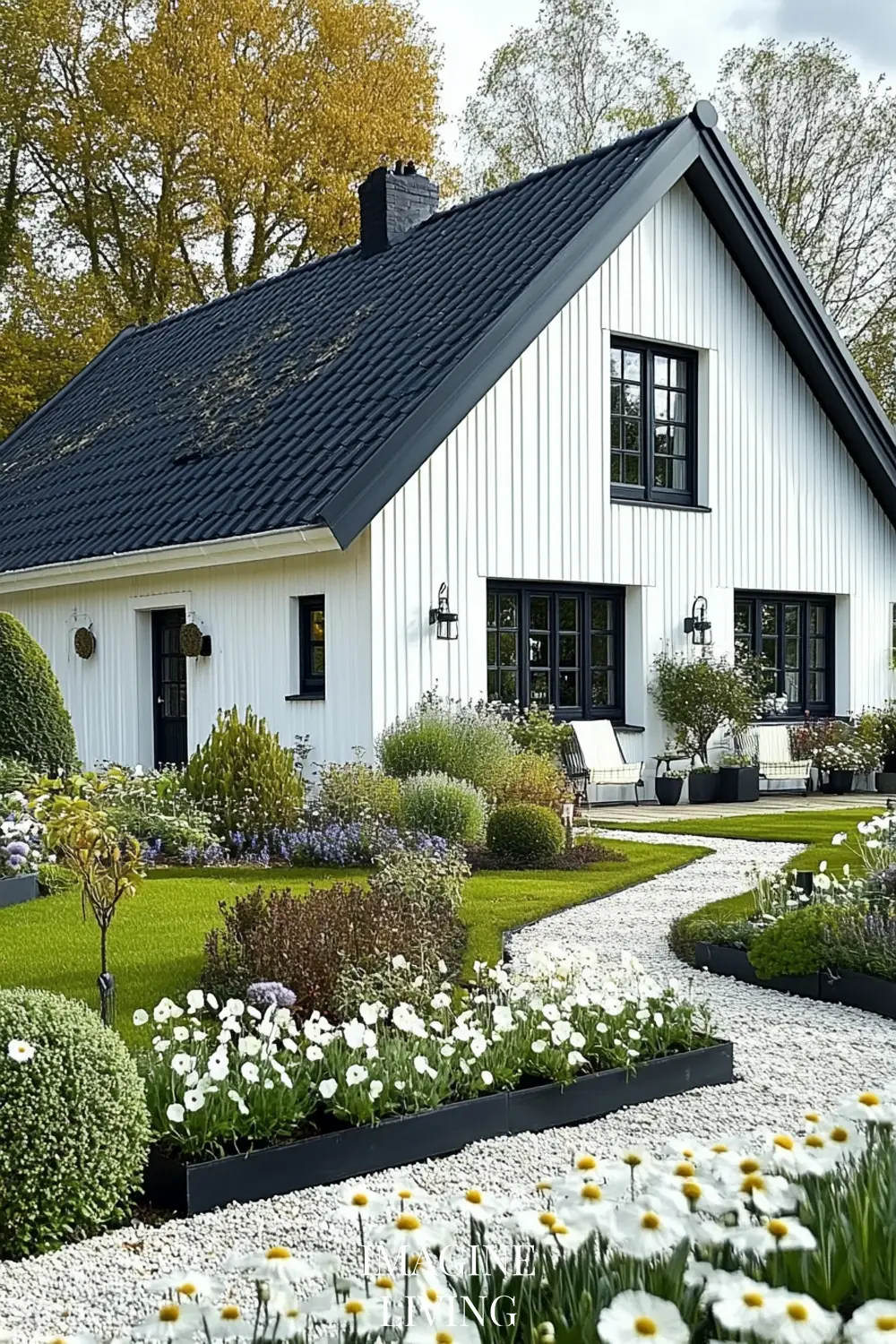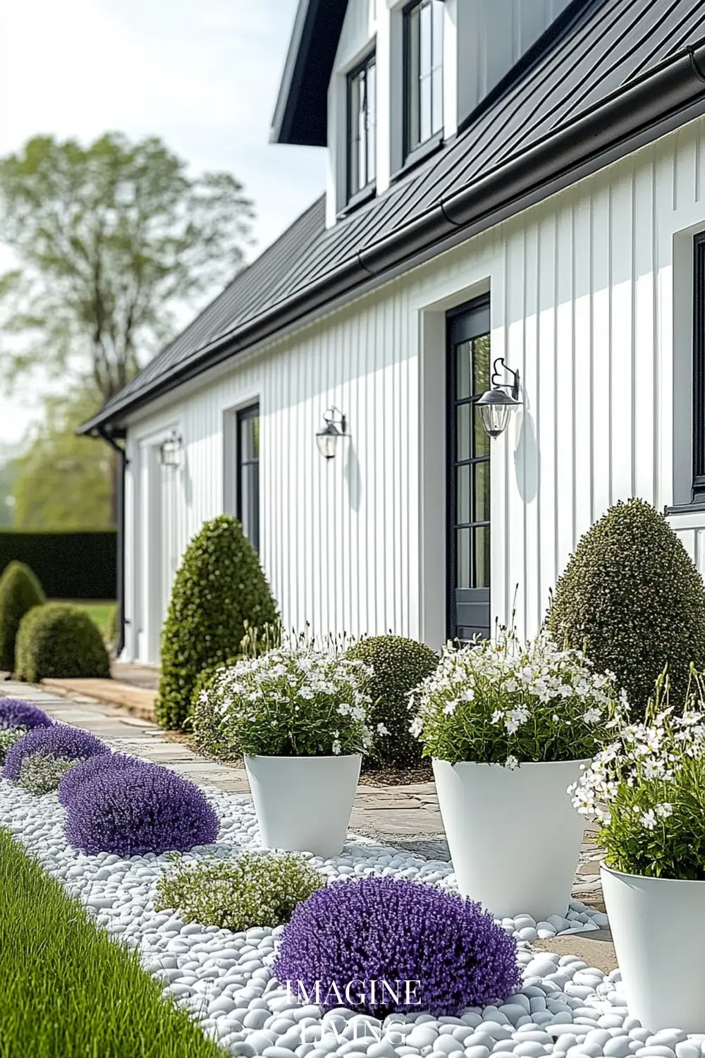 - Black-roofed white home + structured green hedges and white flowering trees for a clean, Nordic-inspired aesthetic.