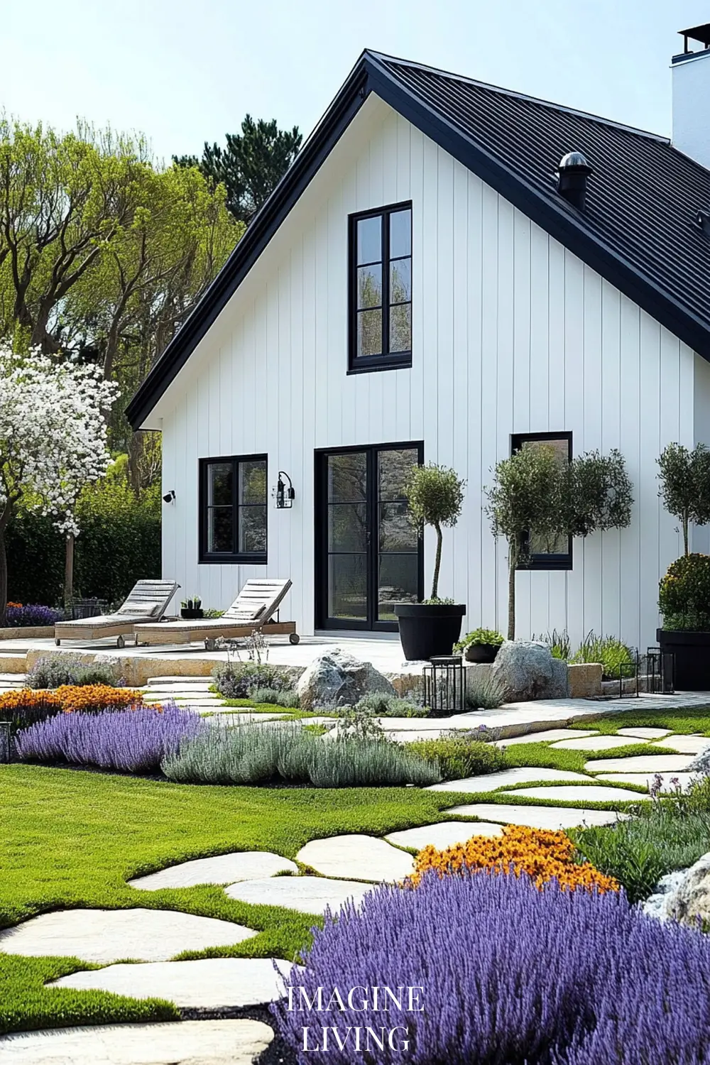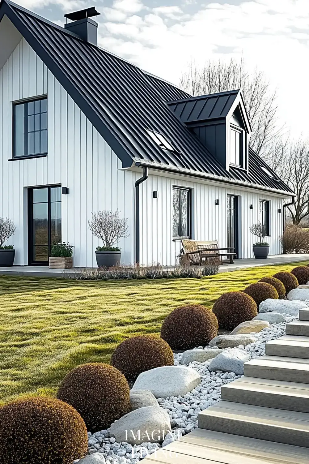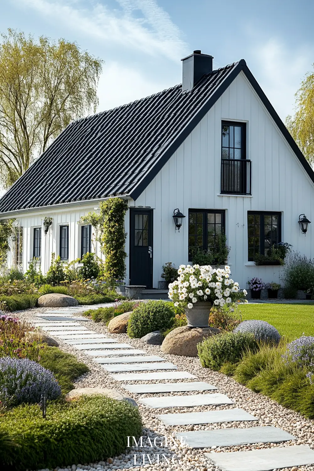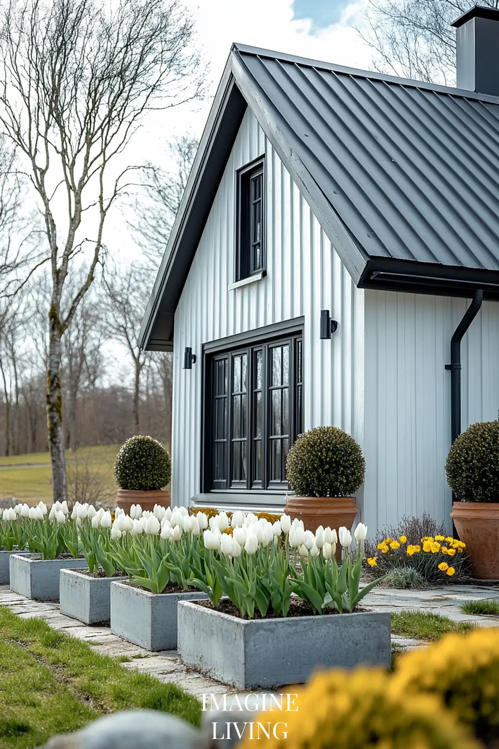 - Black-roofed white home + structured green hedges and white flowering trees for a clean, Nordic-inspired aesthetic.
