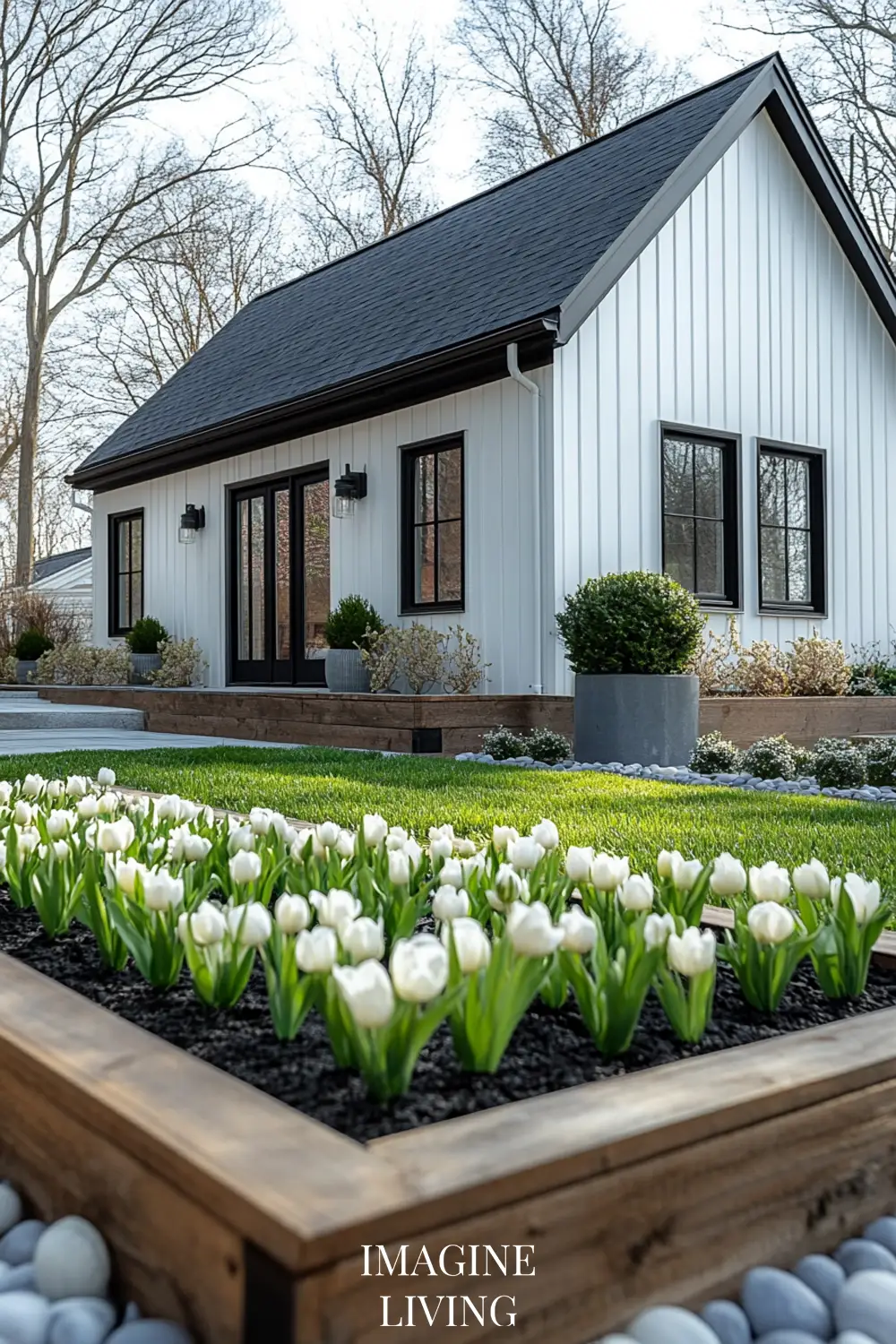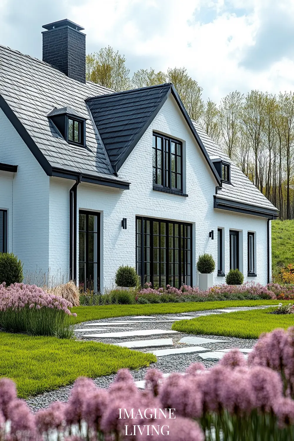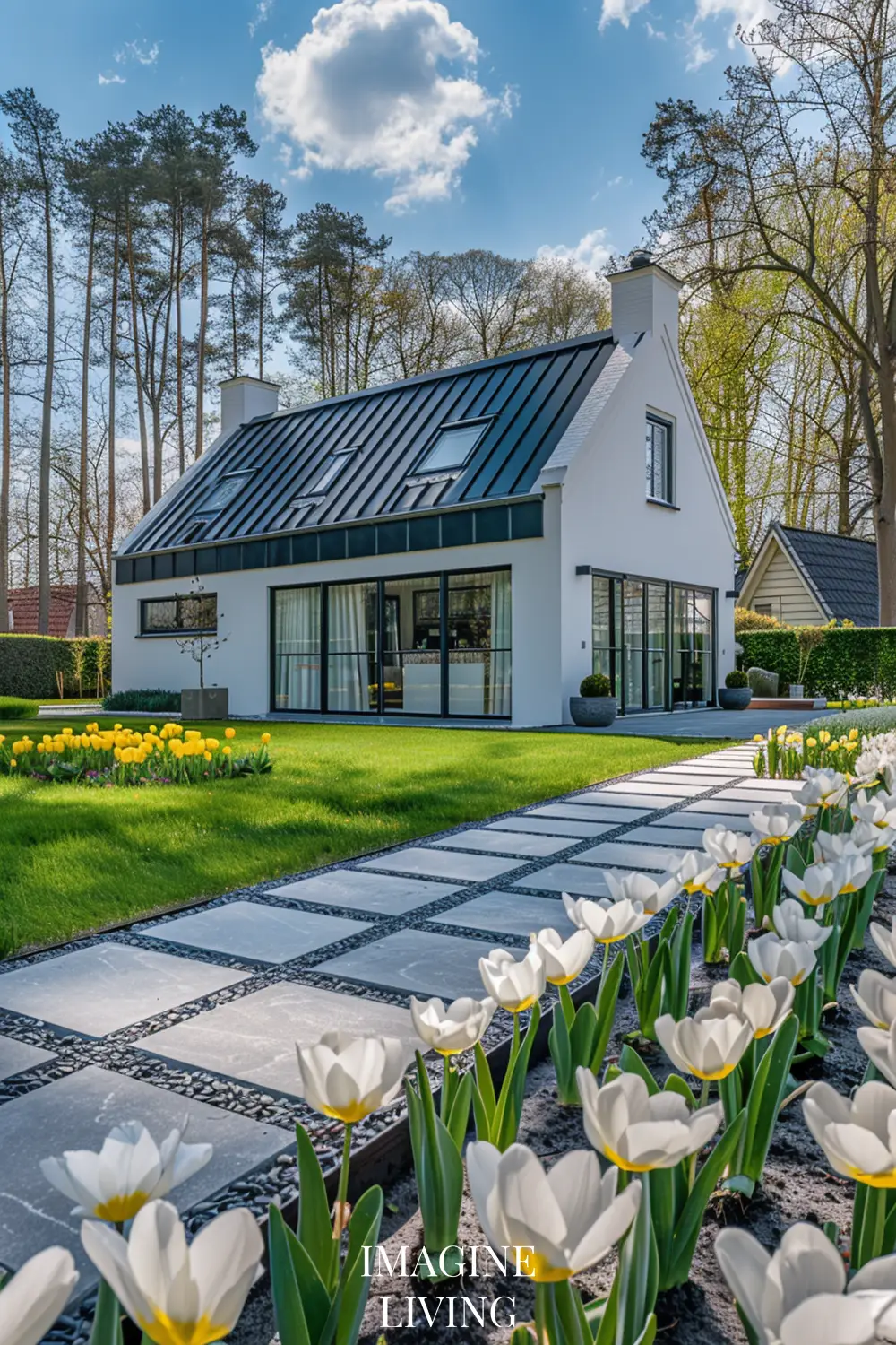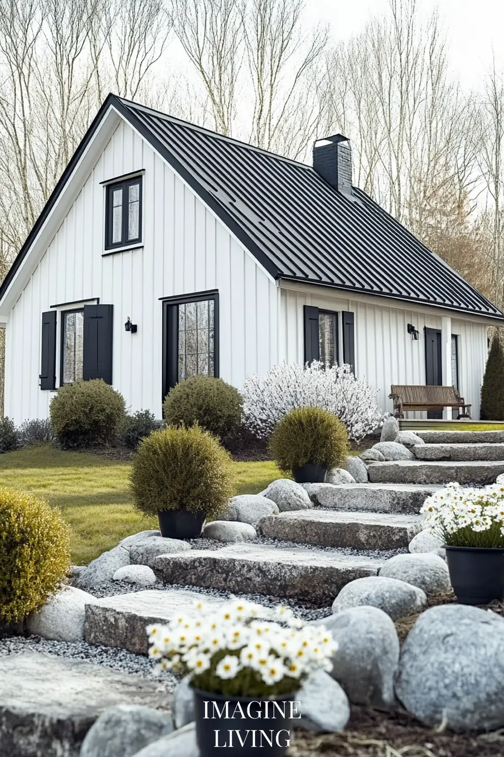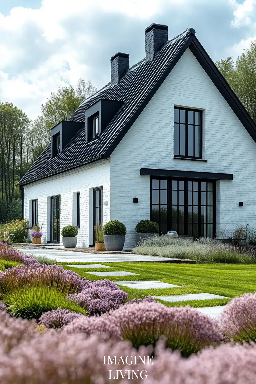 - Black-roofed white home + structured green hedges and white flowering trees for a clean, Nordic-inspired aesthetic.