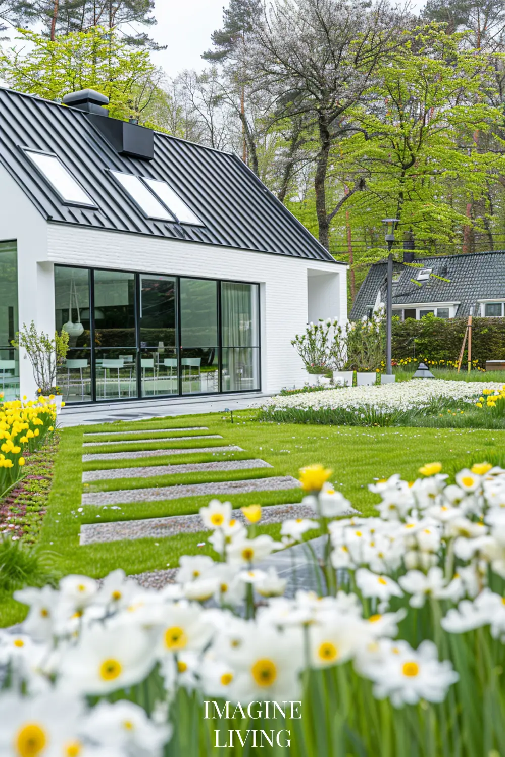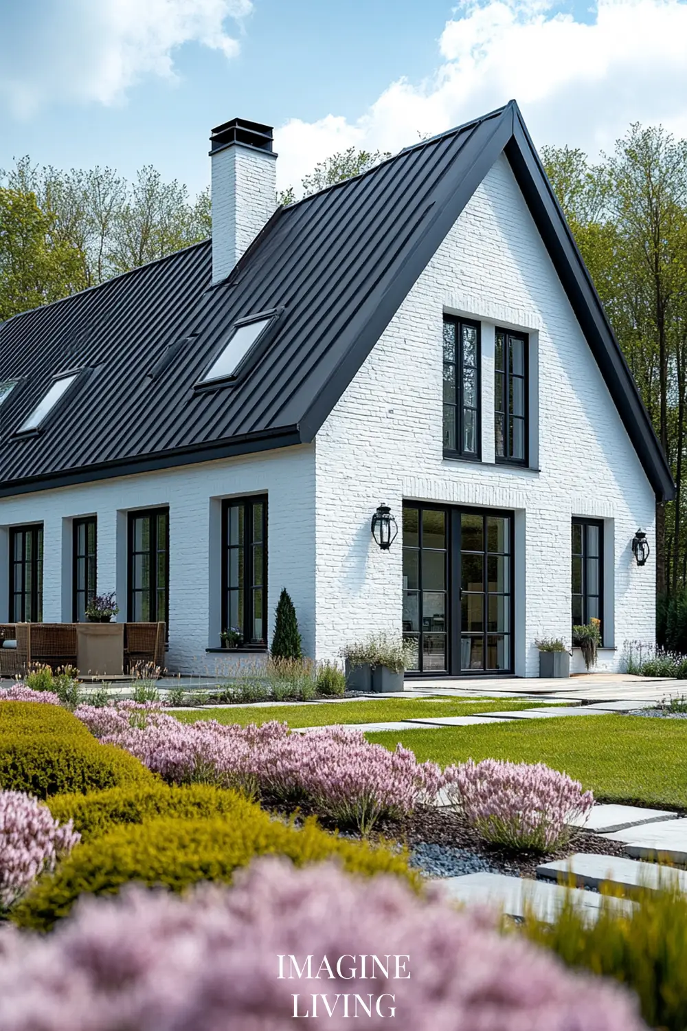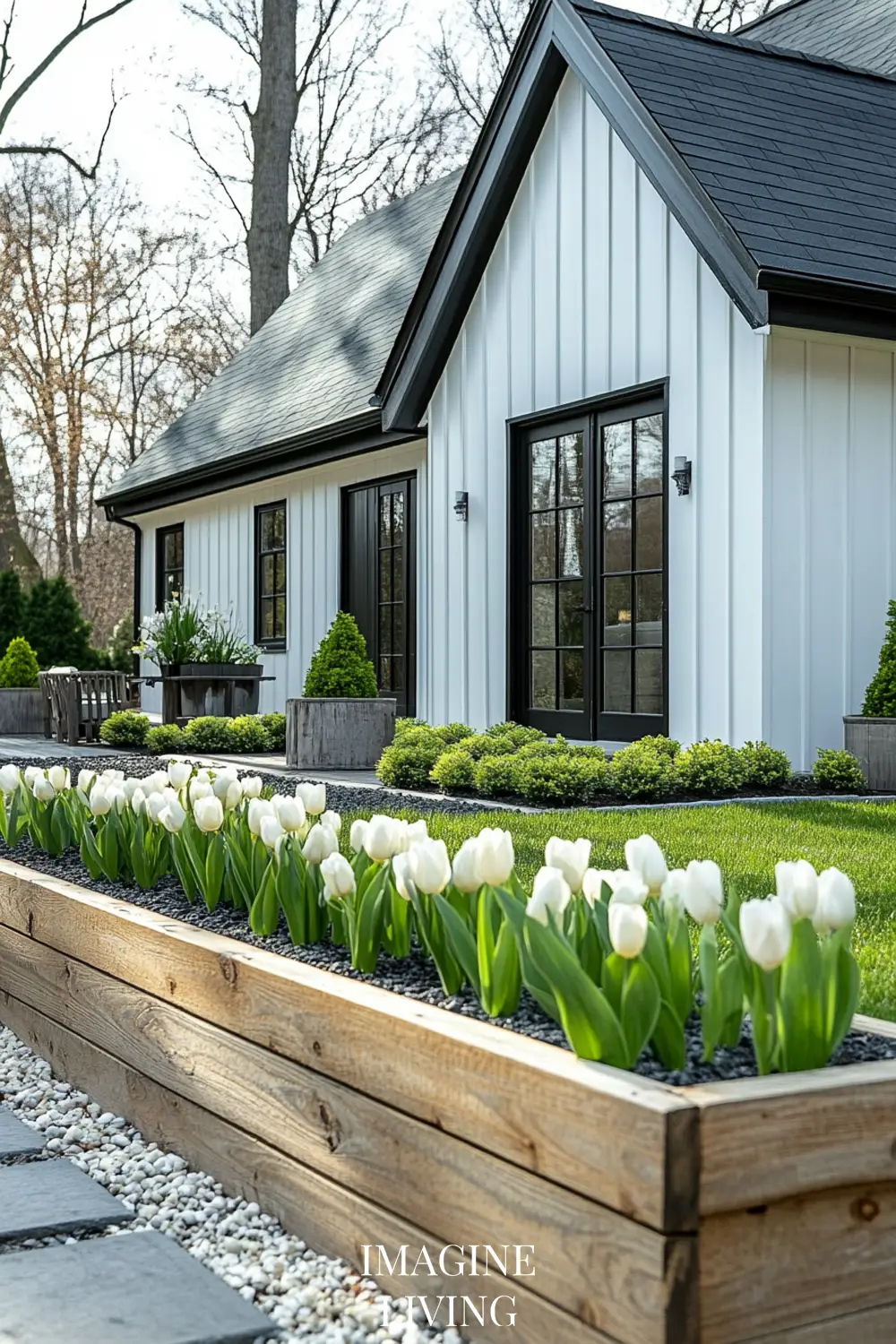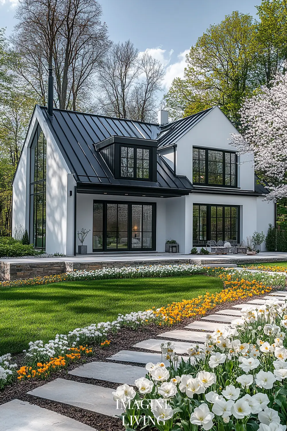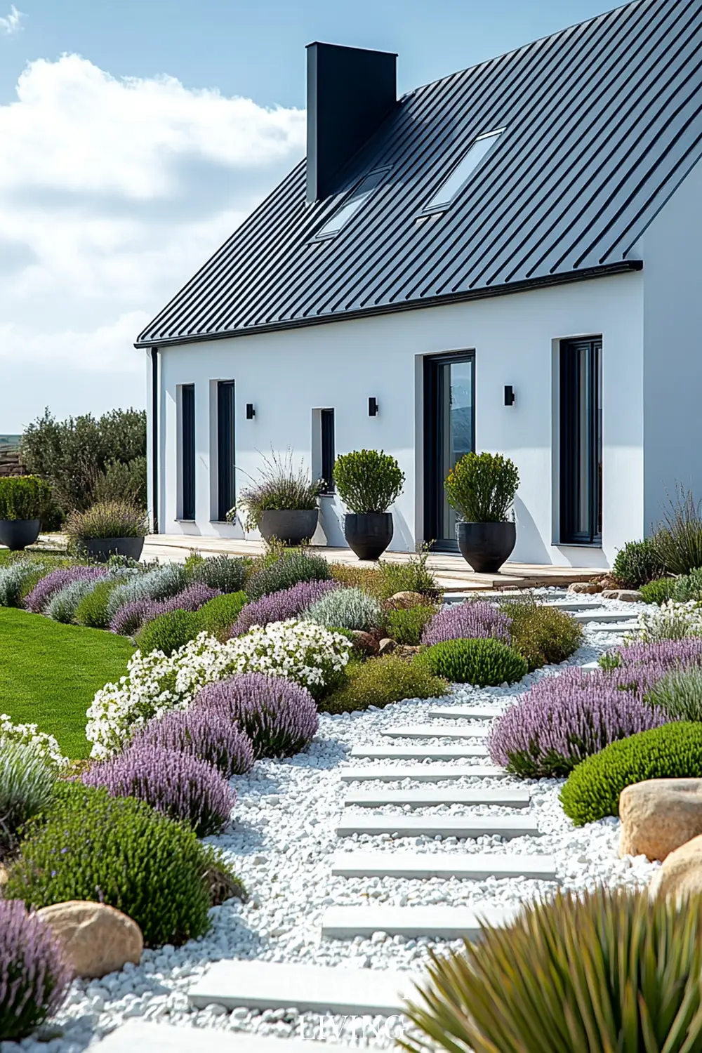 - Black-roofed white home + structured green hedges and white flowering trees for a clean, Nordic-inspired aesthetic.
