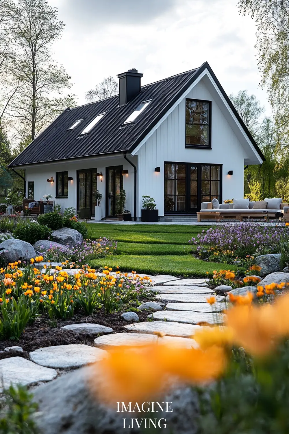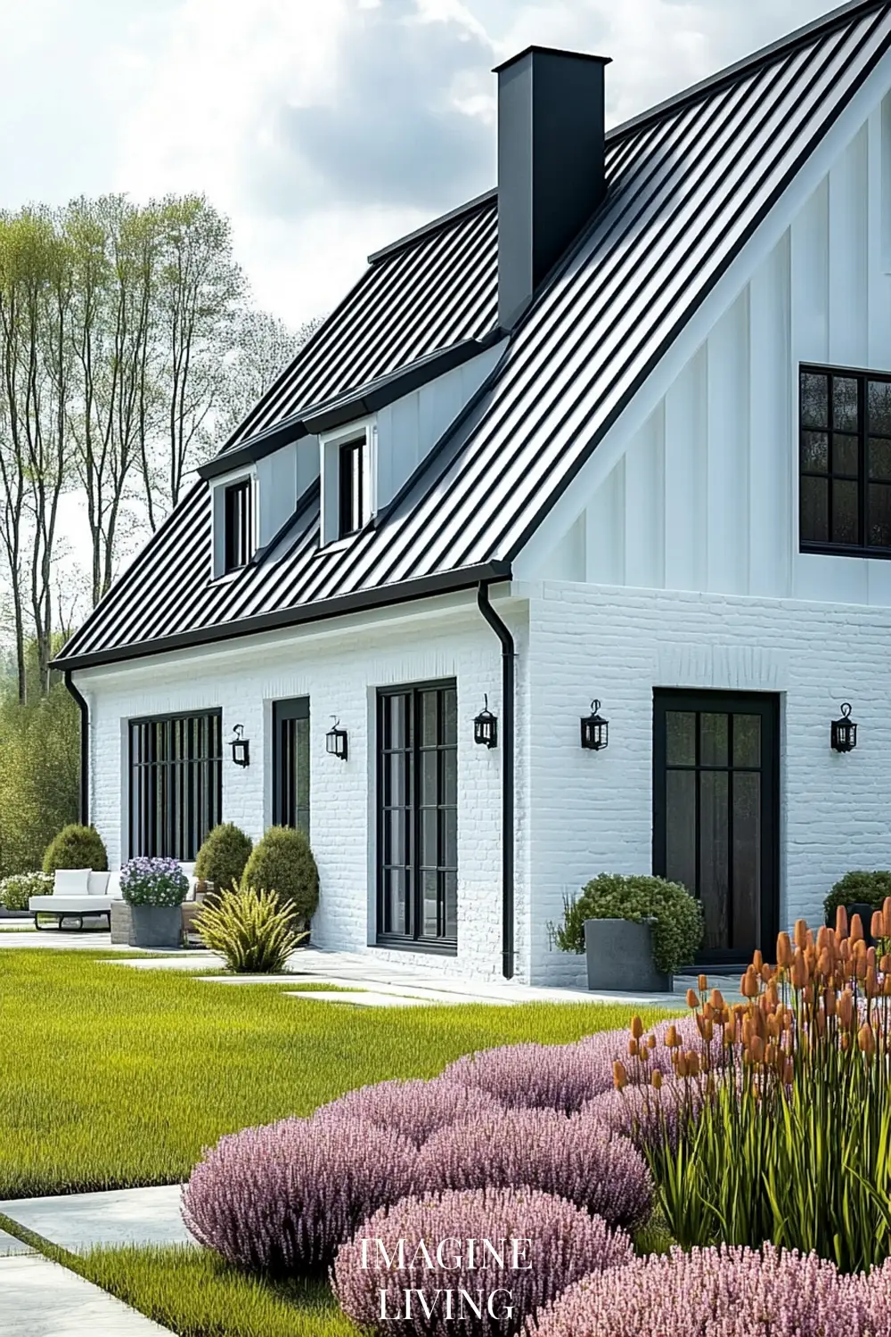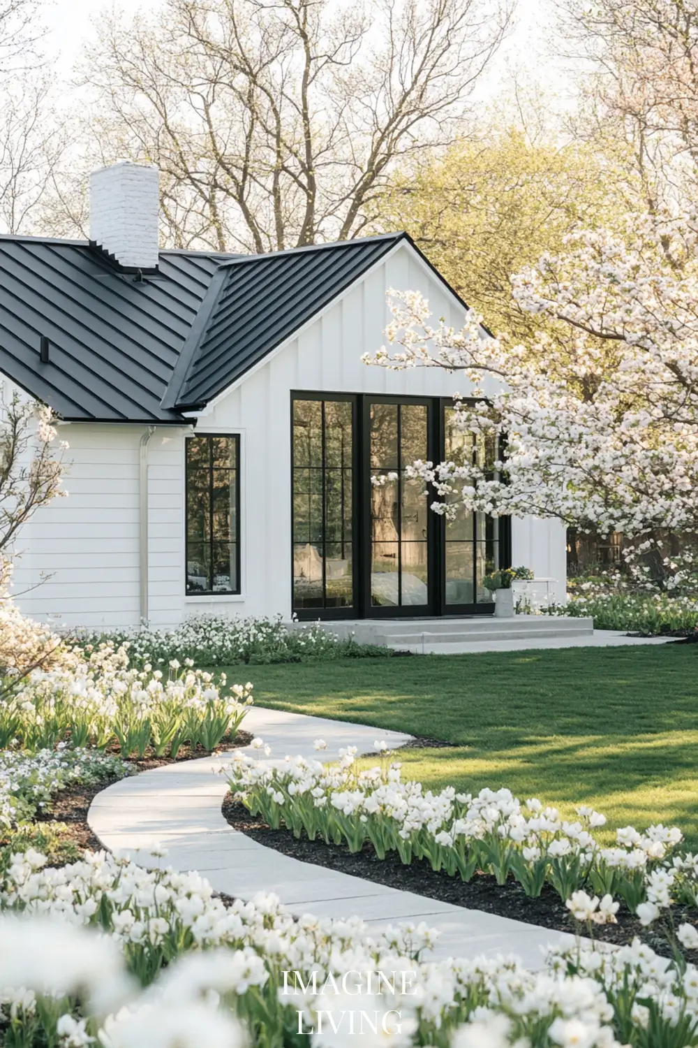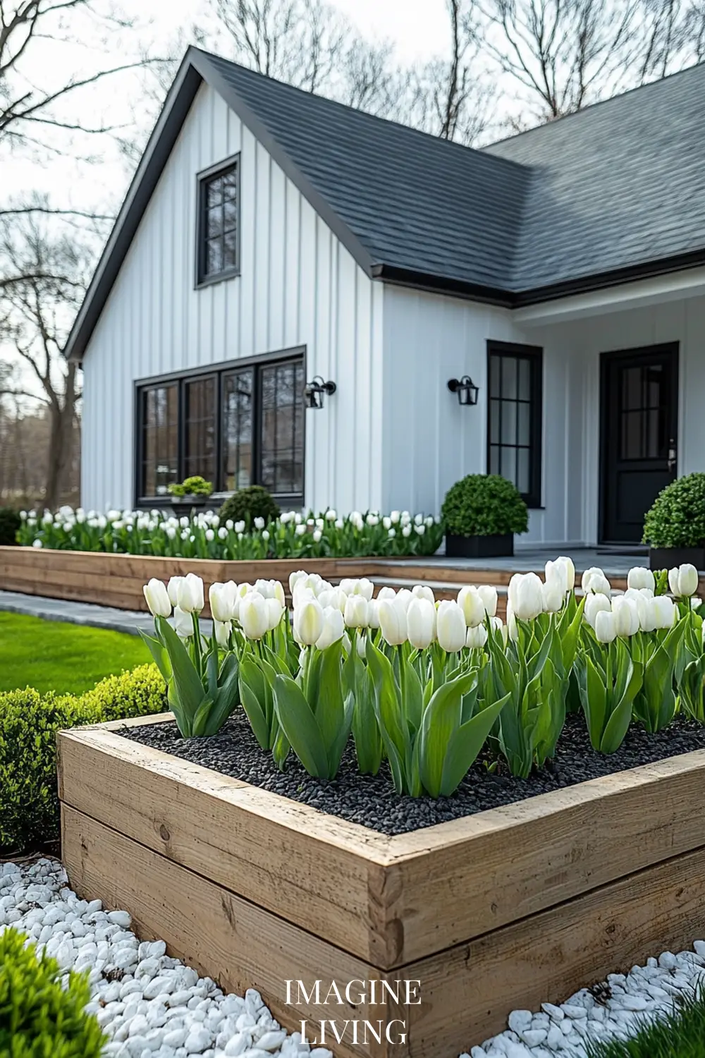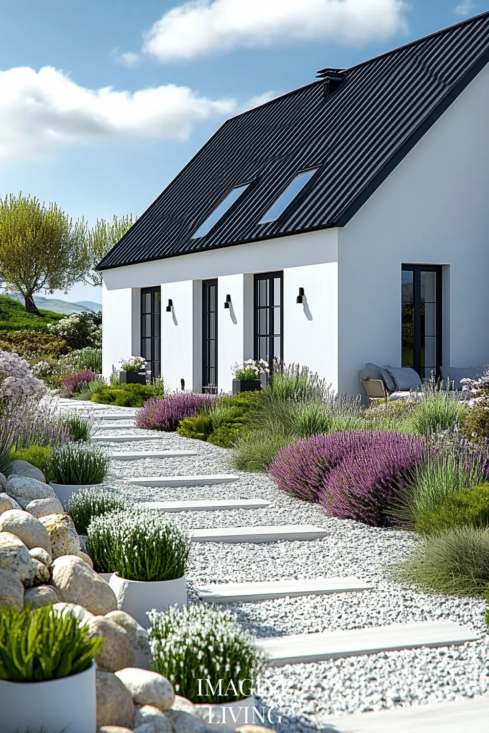 - Black-roofed white home + structured green hedges and white flowering trees for a clean, Nordic-inspired aesthetic.