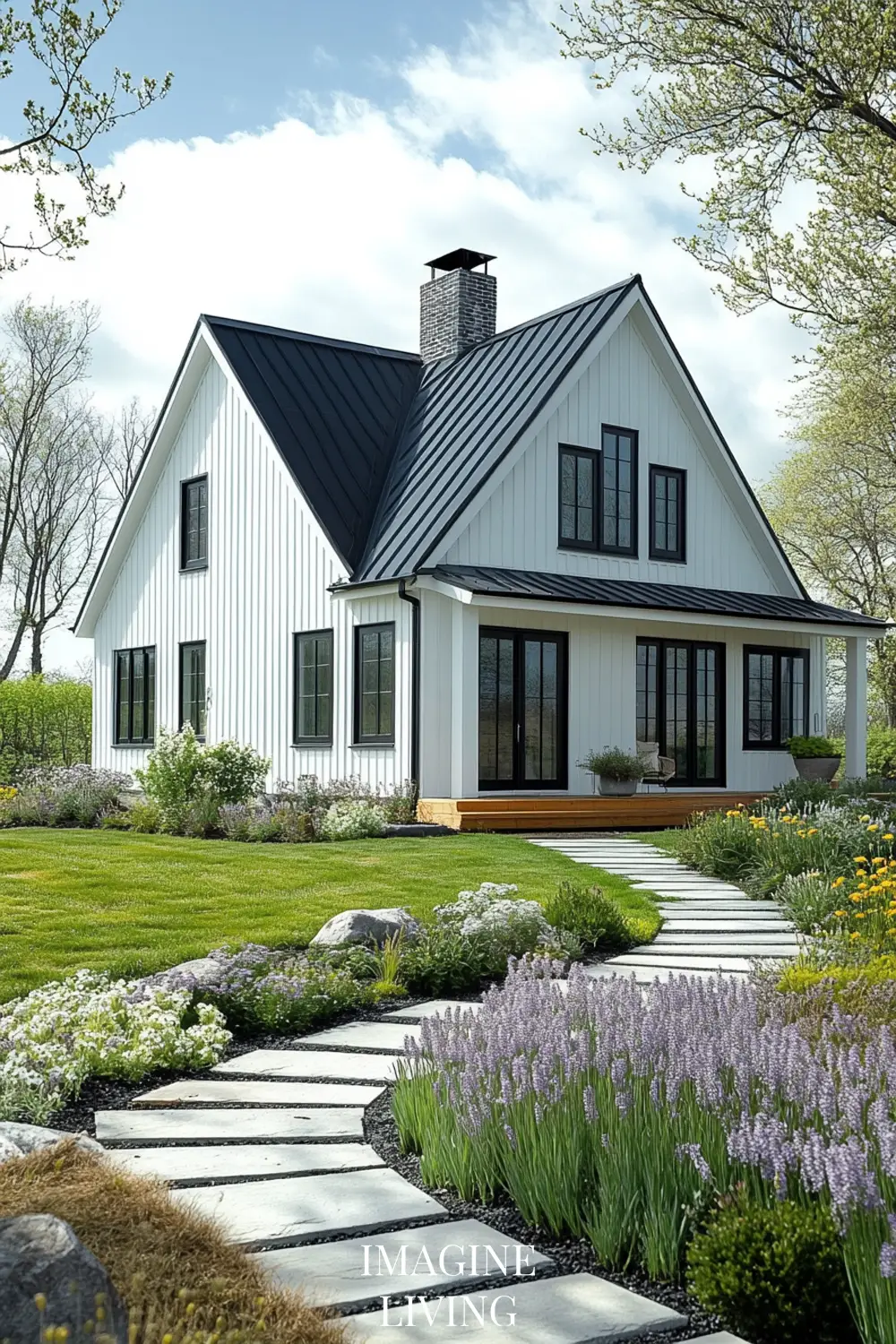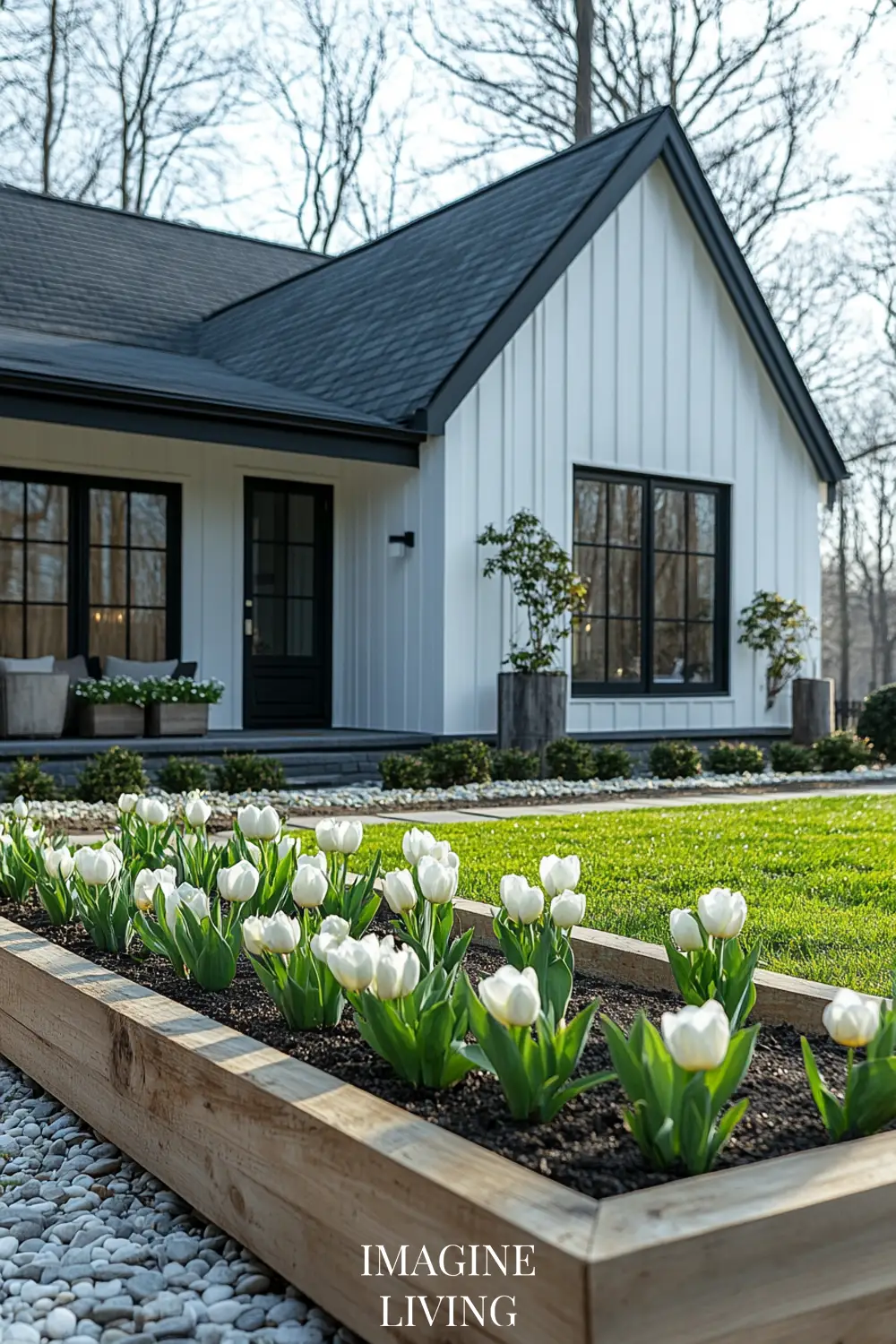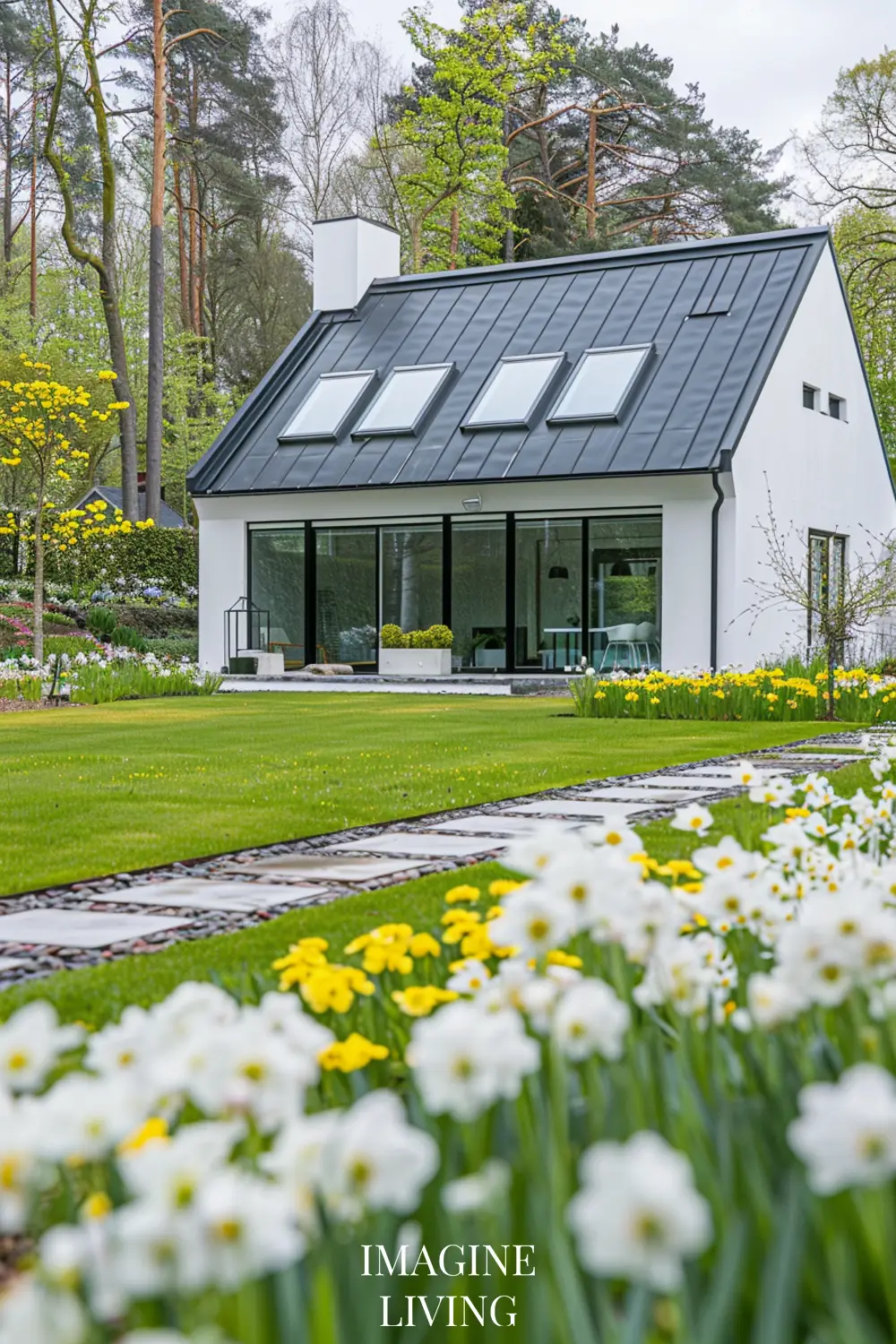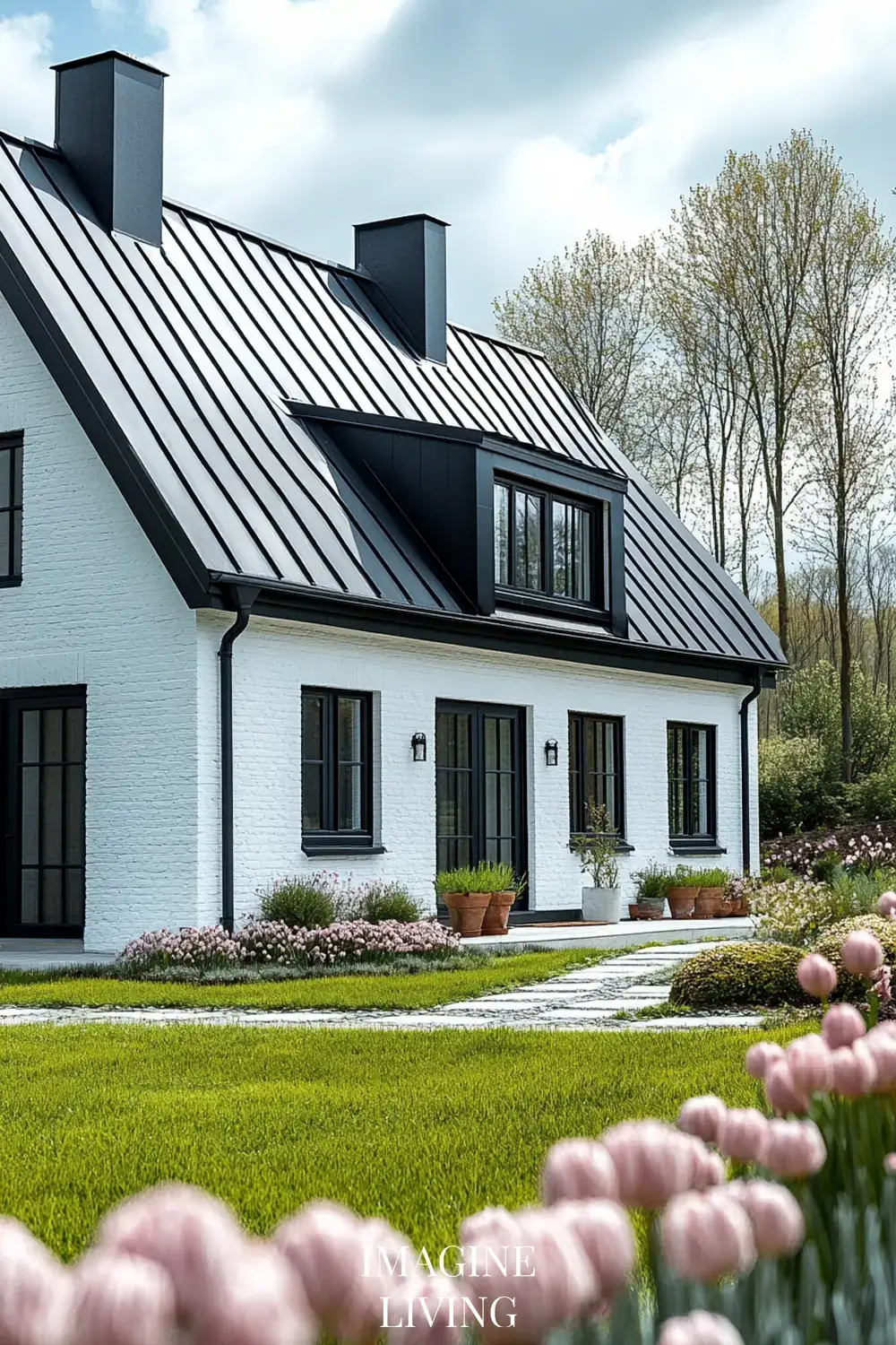 - Black-roofed white home + structured green hedges and white flowering trees for a clean, Nordic-inspired aesthetic.