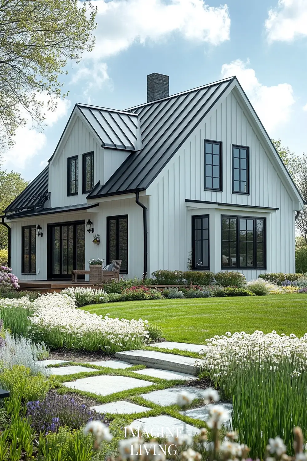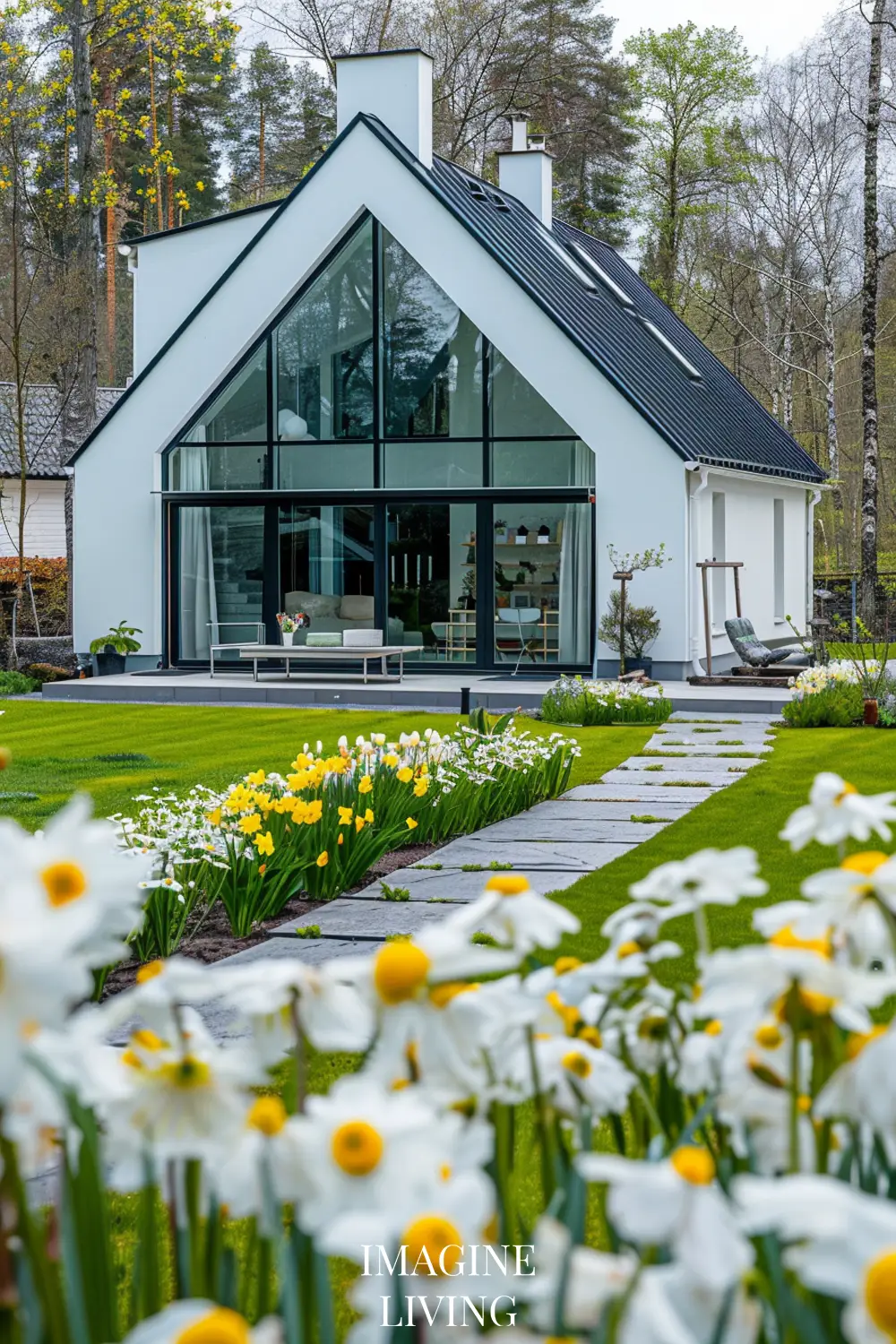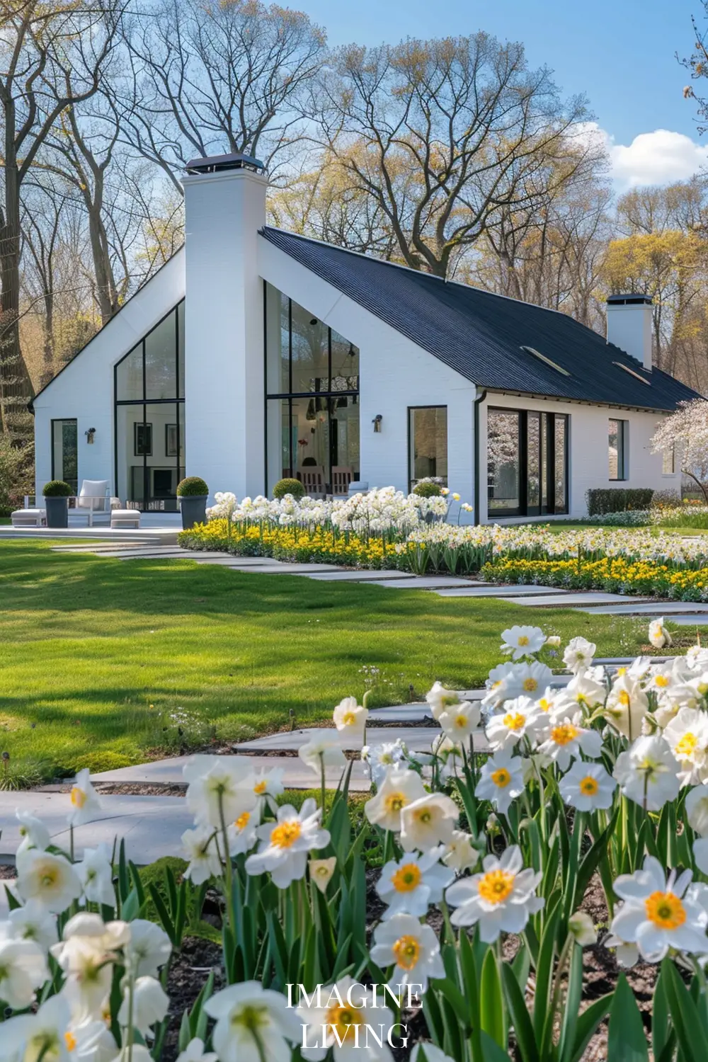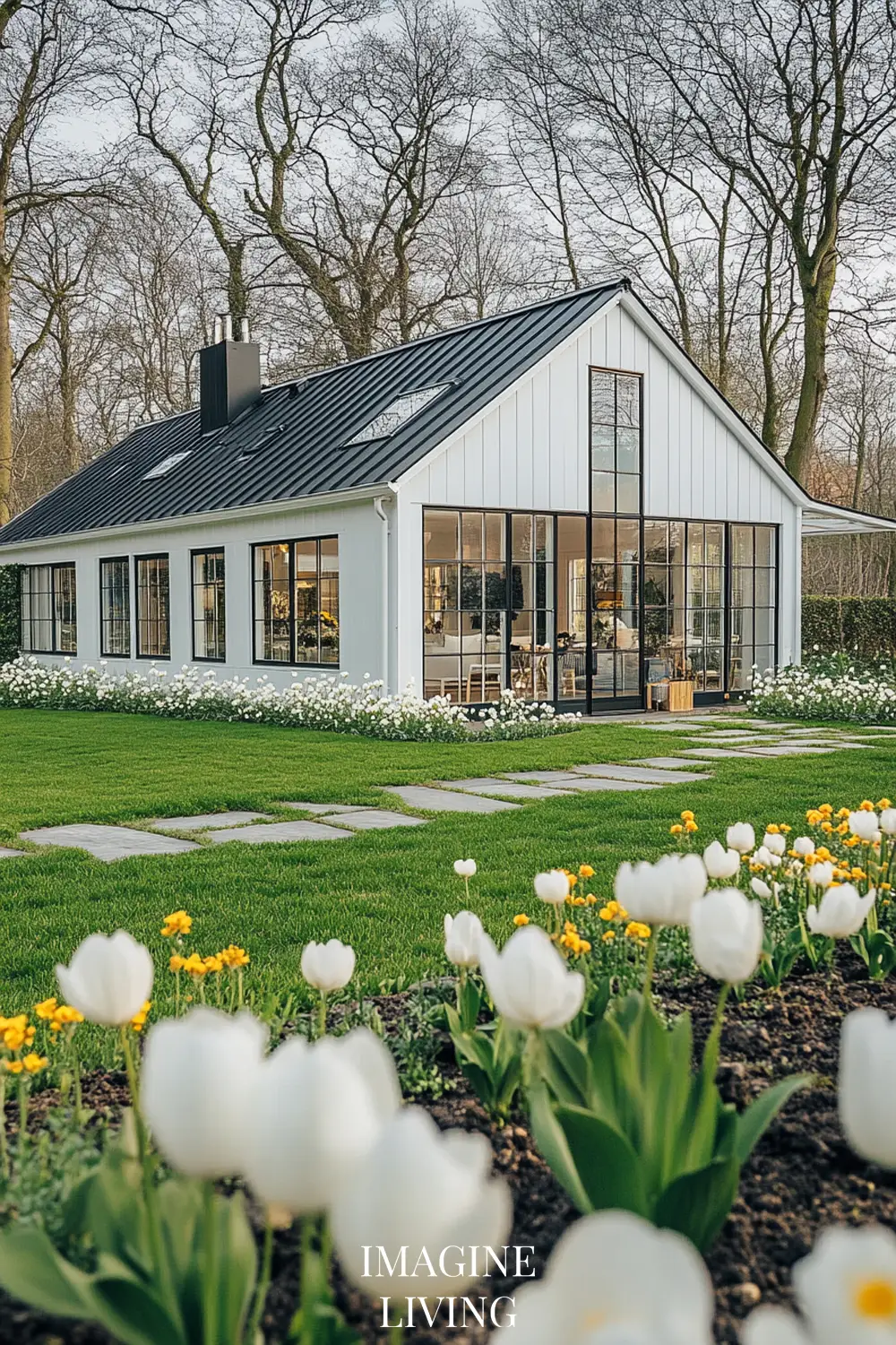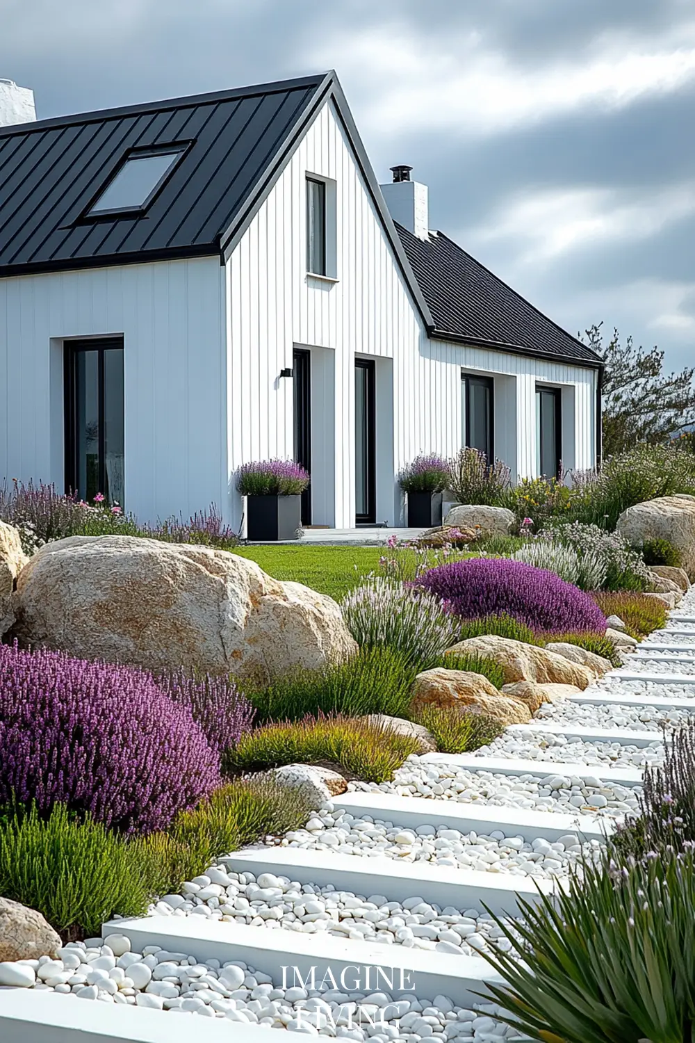 - Black-roofed white home + structured green hedges and white flowering trees for a clean, Nordic-inspired aesthetic.