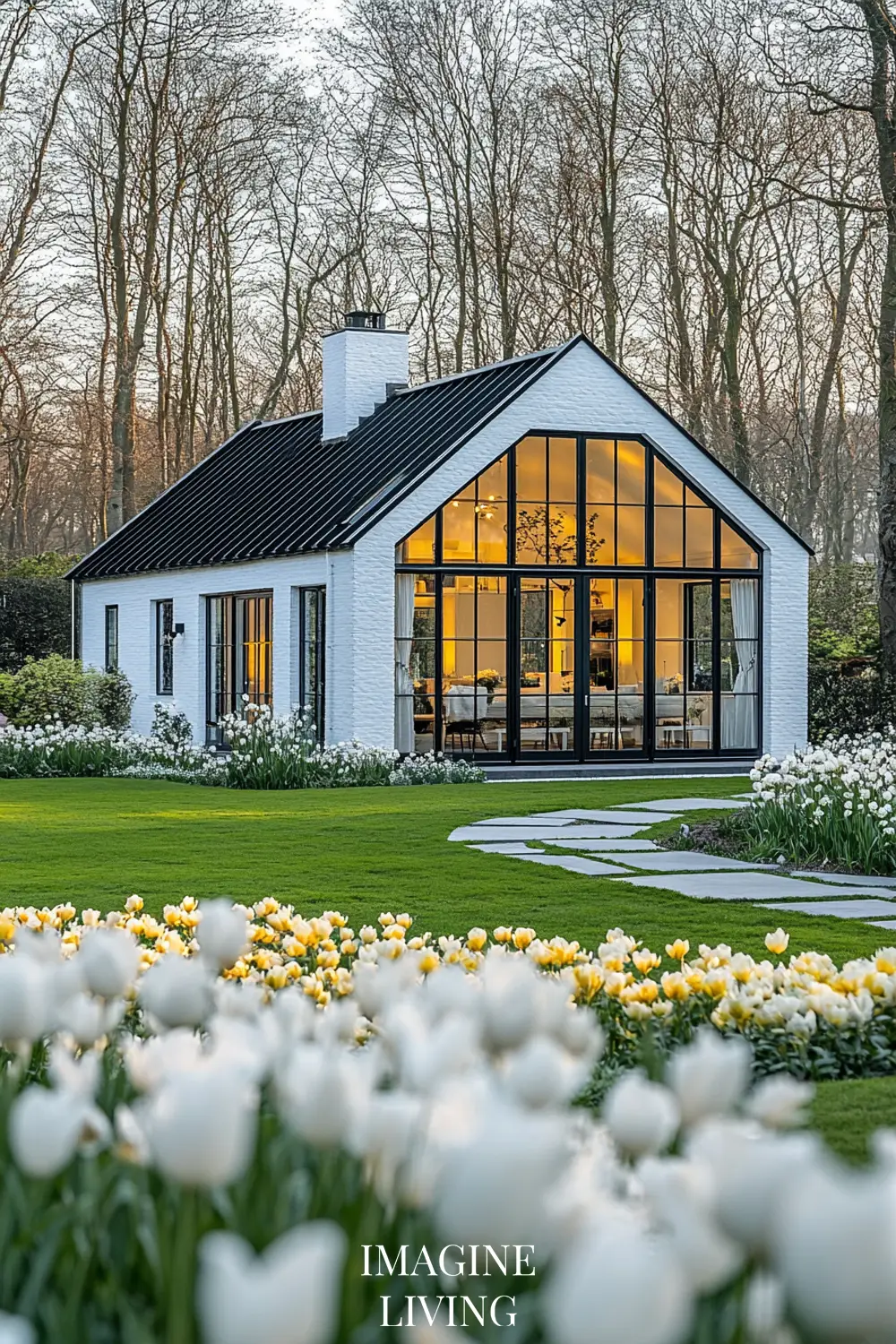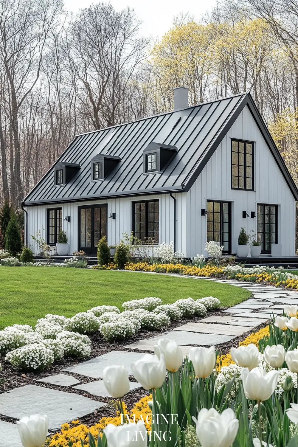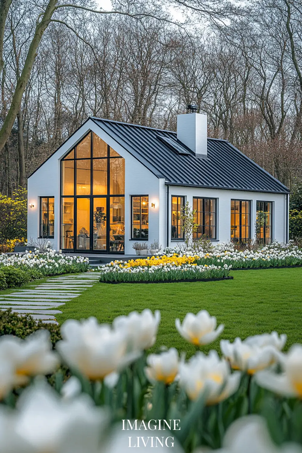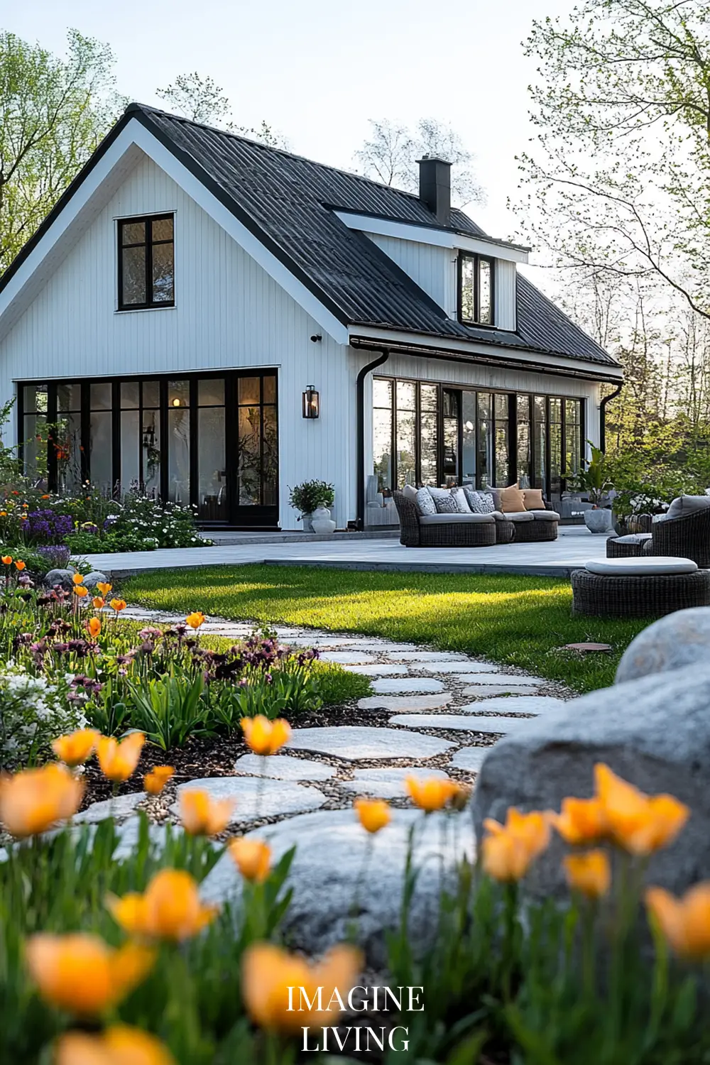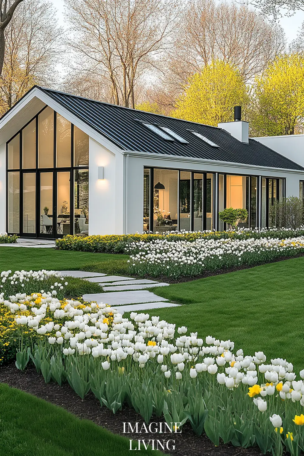 - Black-roofed white home + structured green hedges and white flowering trees for a clean, Nordic-inspired aesthetic.