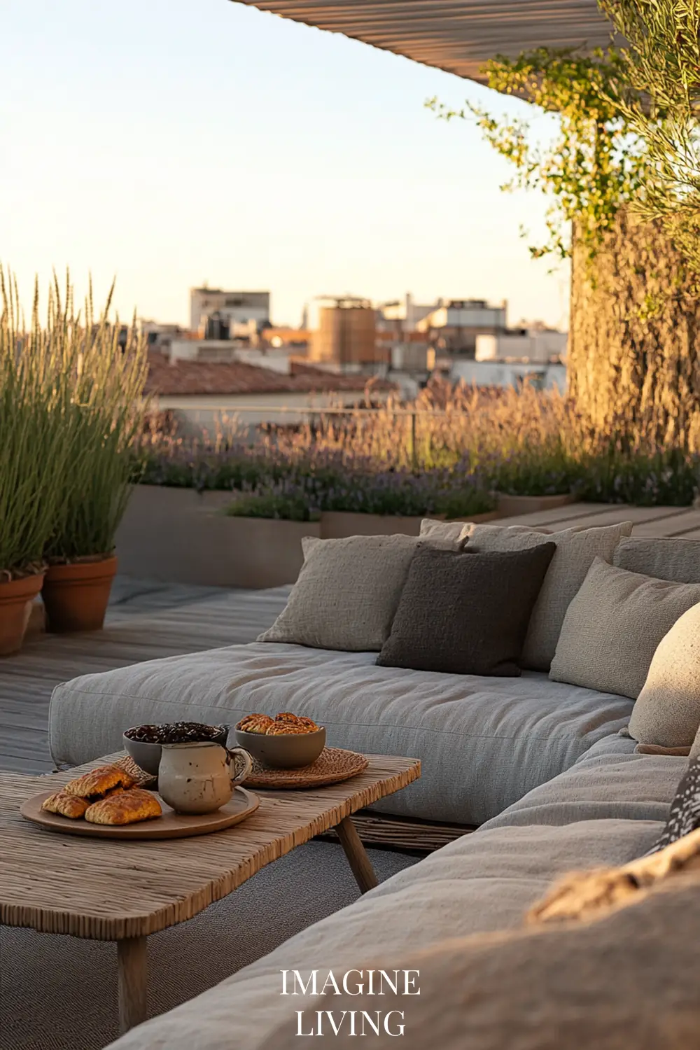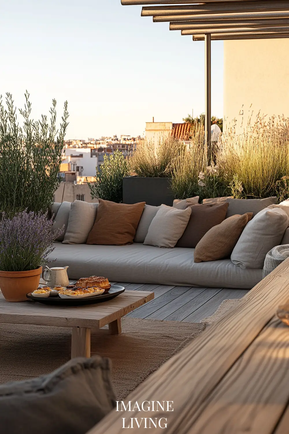 Olive, lavender, or rosemary in large clay pots bring life and balance. Their muted foliage complements the warmth of the palette.