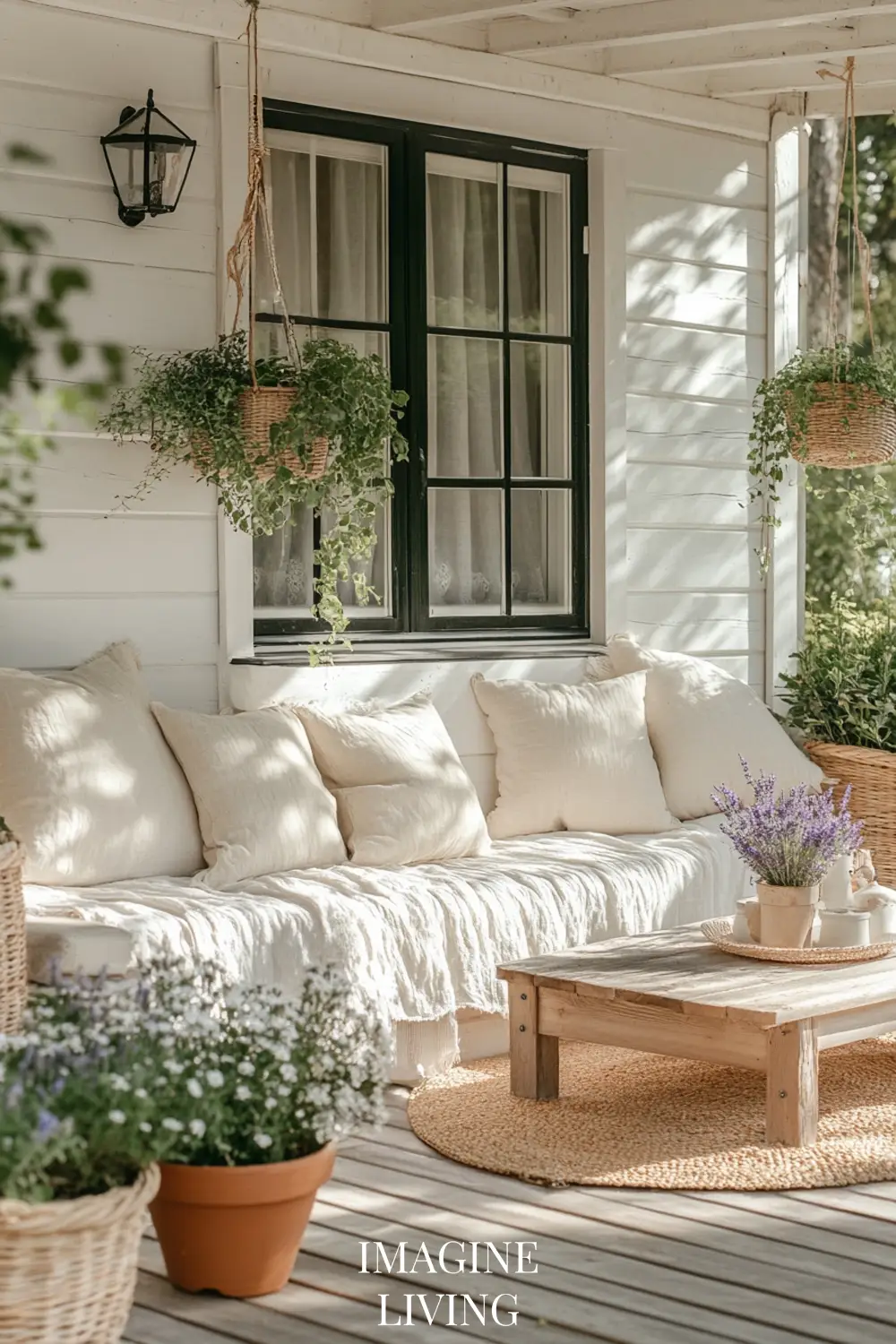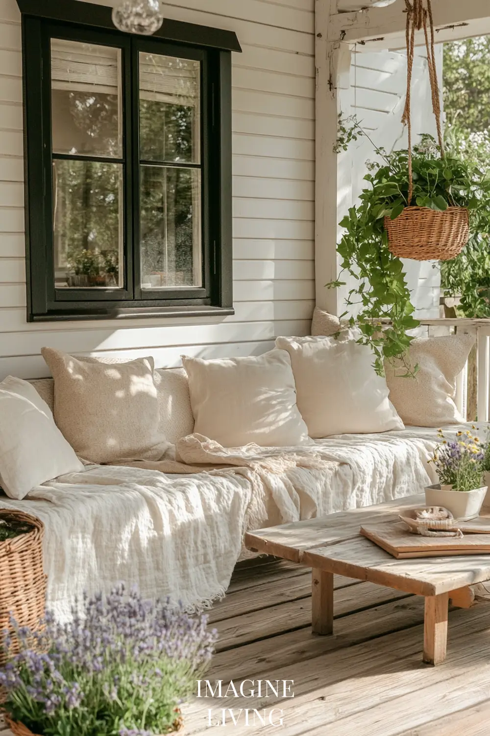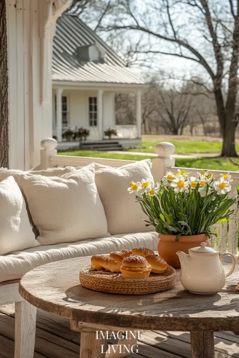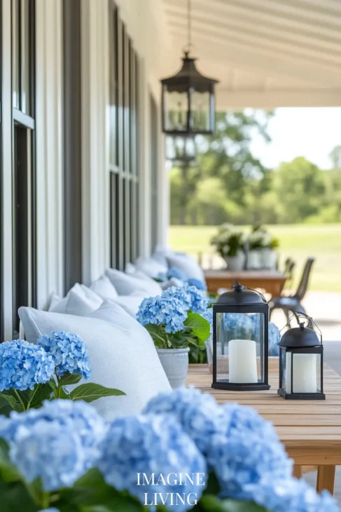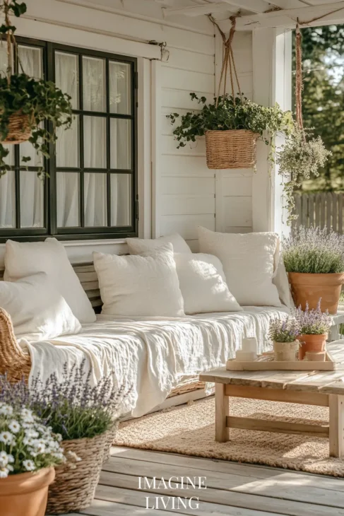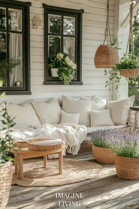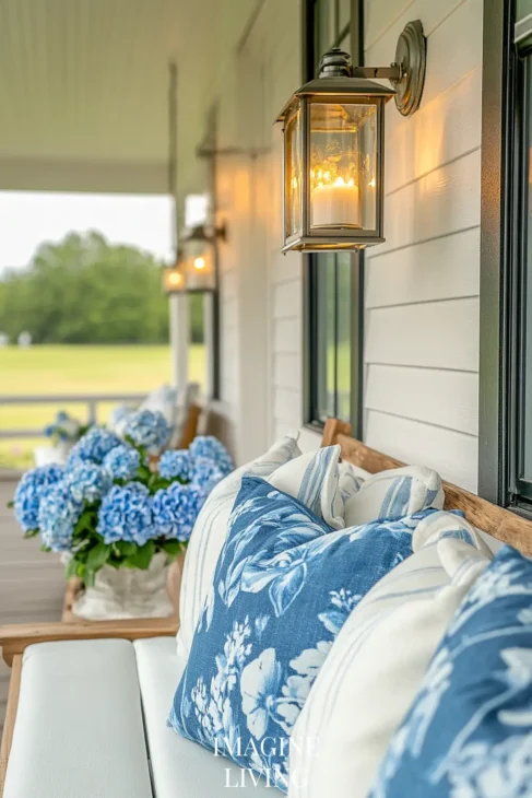 Don’t feel the need to center everything. A low bench with three pillows of different sizes, a hanging plant off to one side, or mismatched planters in staggered heights—all these give the porch a more relaxed, lived-in charm.