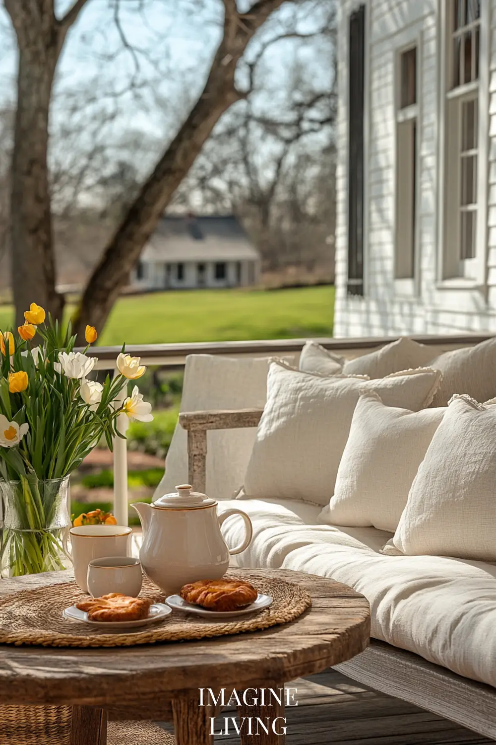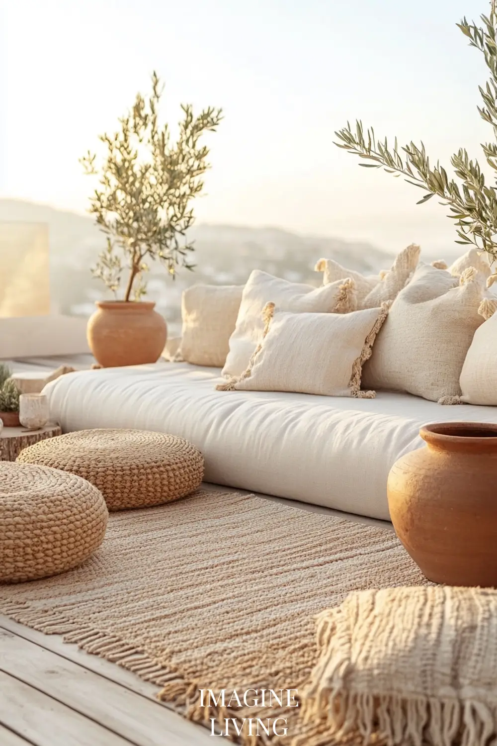 Add soft layers for lounging. Mediterranean porches are built for afternoon naps, long dinners, and golden-hour conversations.