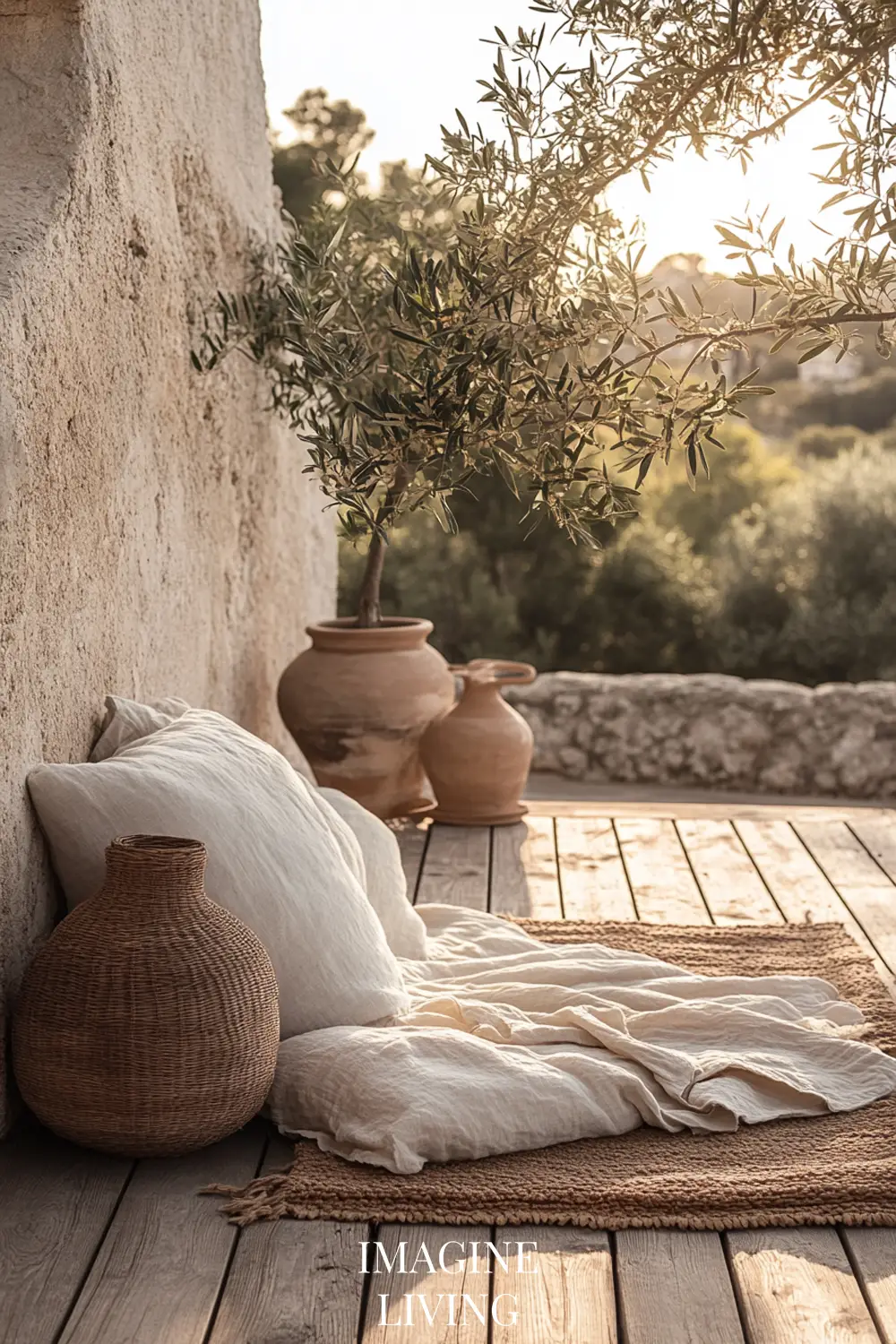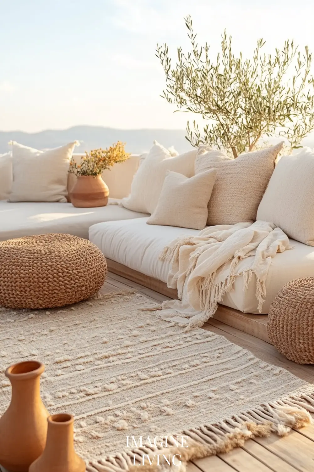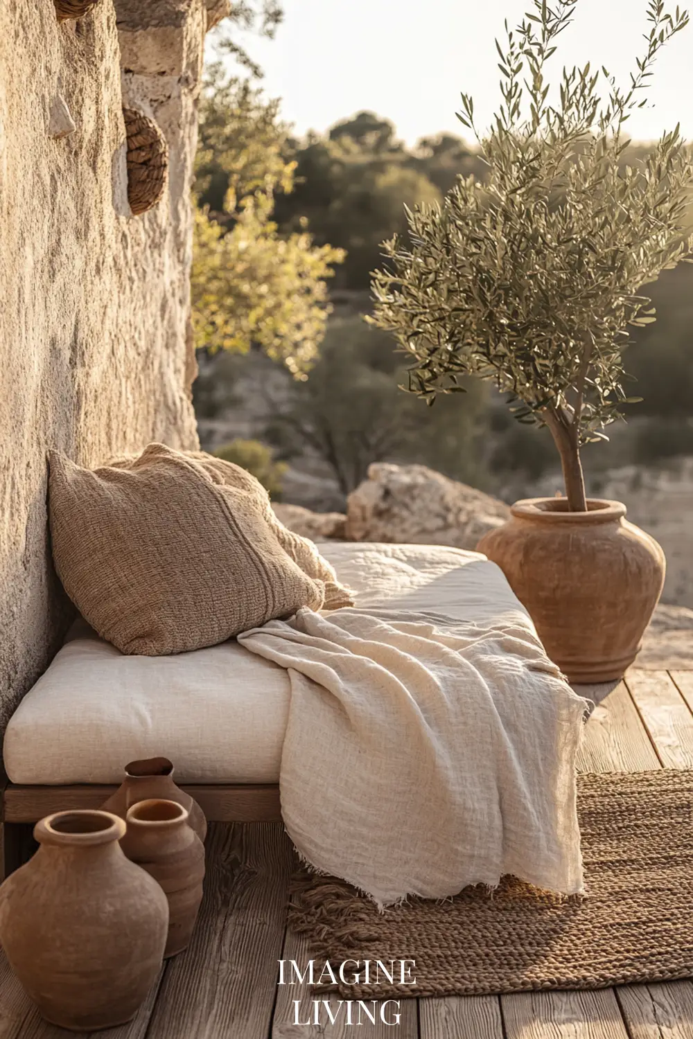 Thick linen throws, striped cotton cushions, and natural fiber rugs in warm, sun-faded tones.