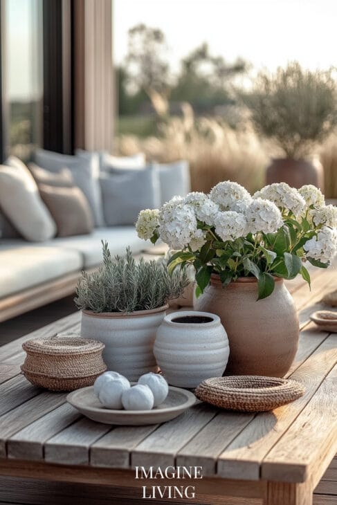 Lavender, chamomile, olive branches, and wild herbs—nature plays both backdrop and focal point. Group potted plants with varied heights and textures for a lush, organic effect.