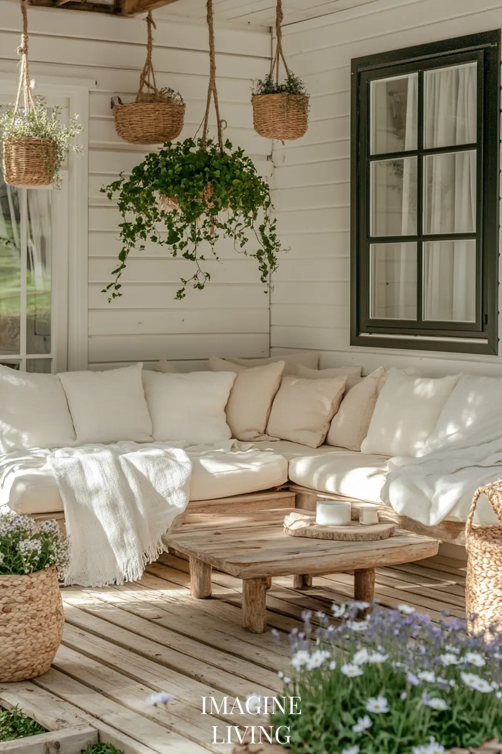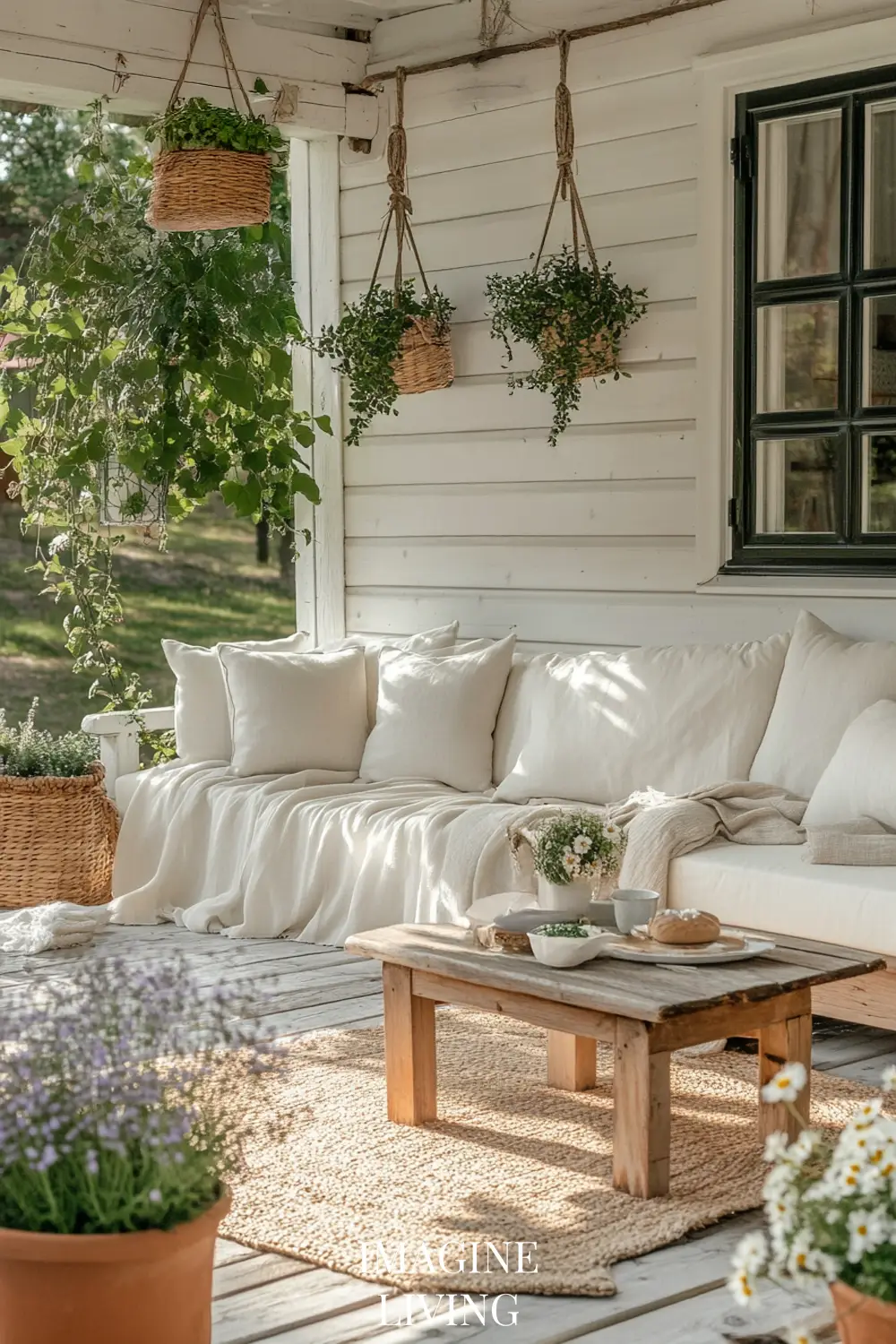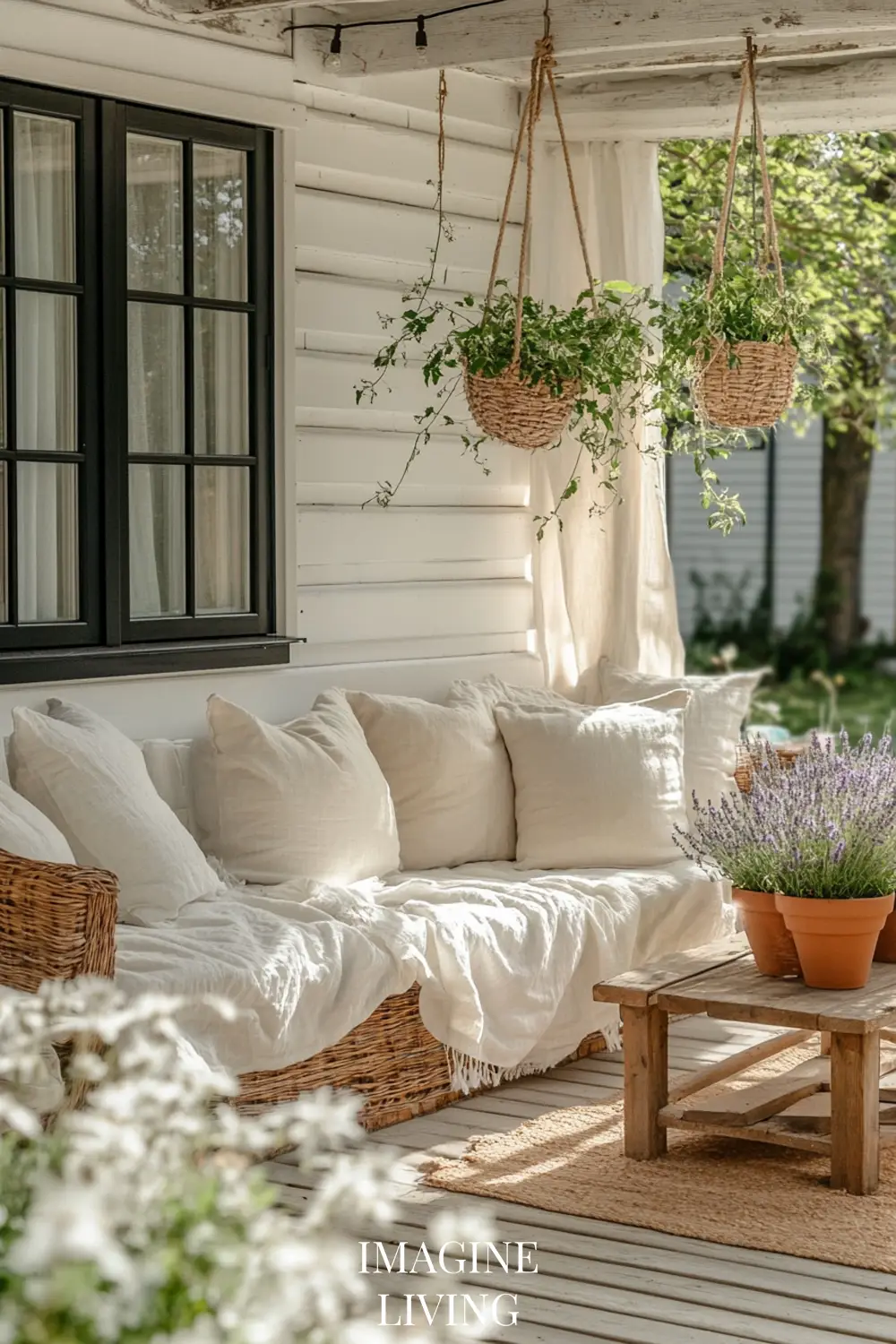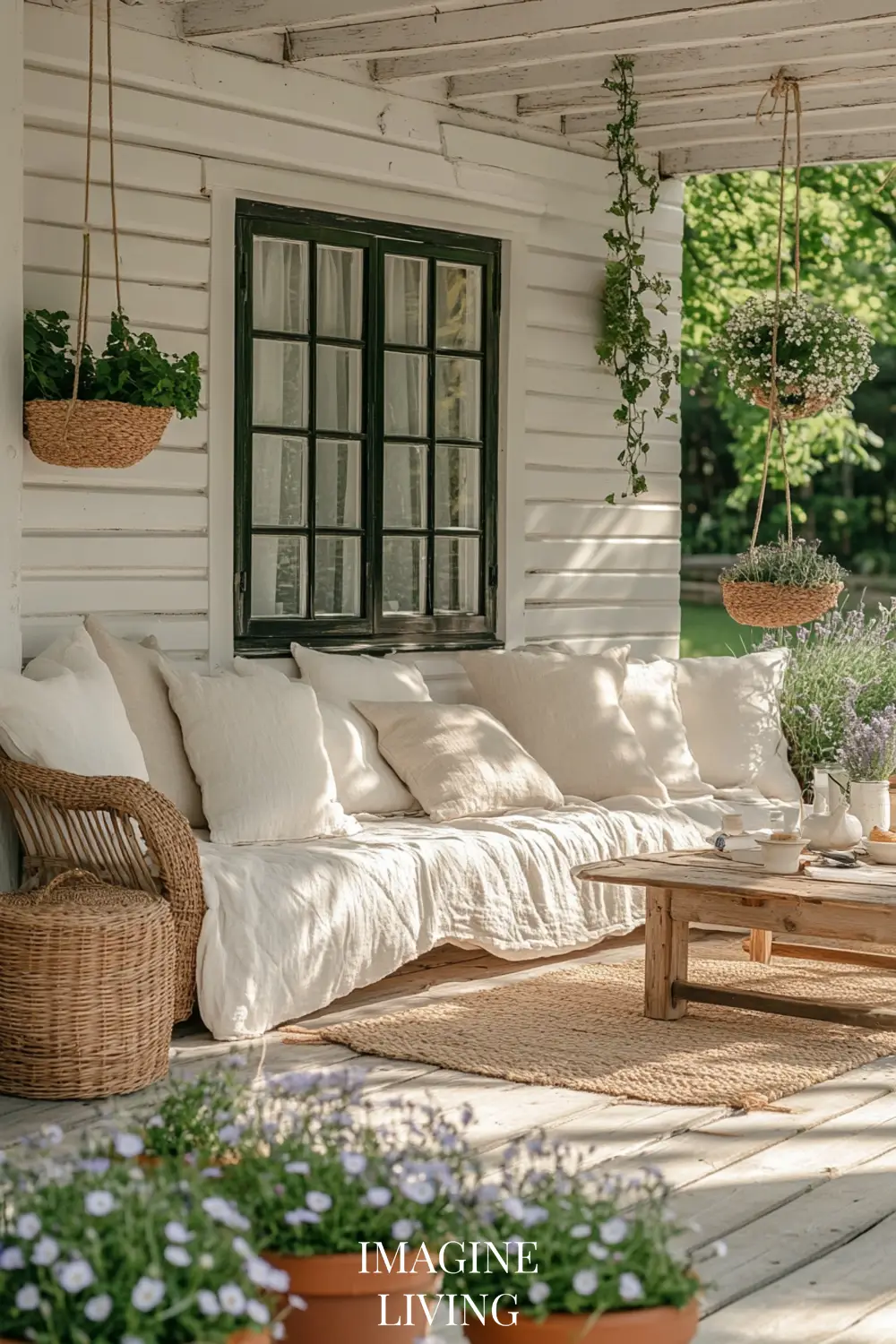 Layer soft rugs, floor cushions, or woven mats underfoot. Coastal porches are meant to be felt with your whole body—not just looked at.