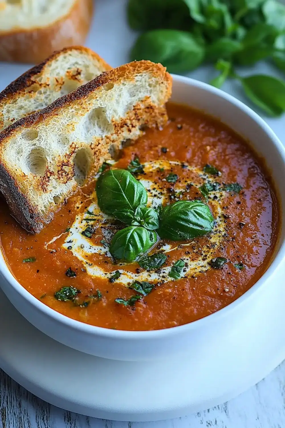 - Ladle the soup into bowls and garnish with fresh basil leaves, grated Parmesan, and croutons or a slice of crusty bread on the side.